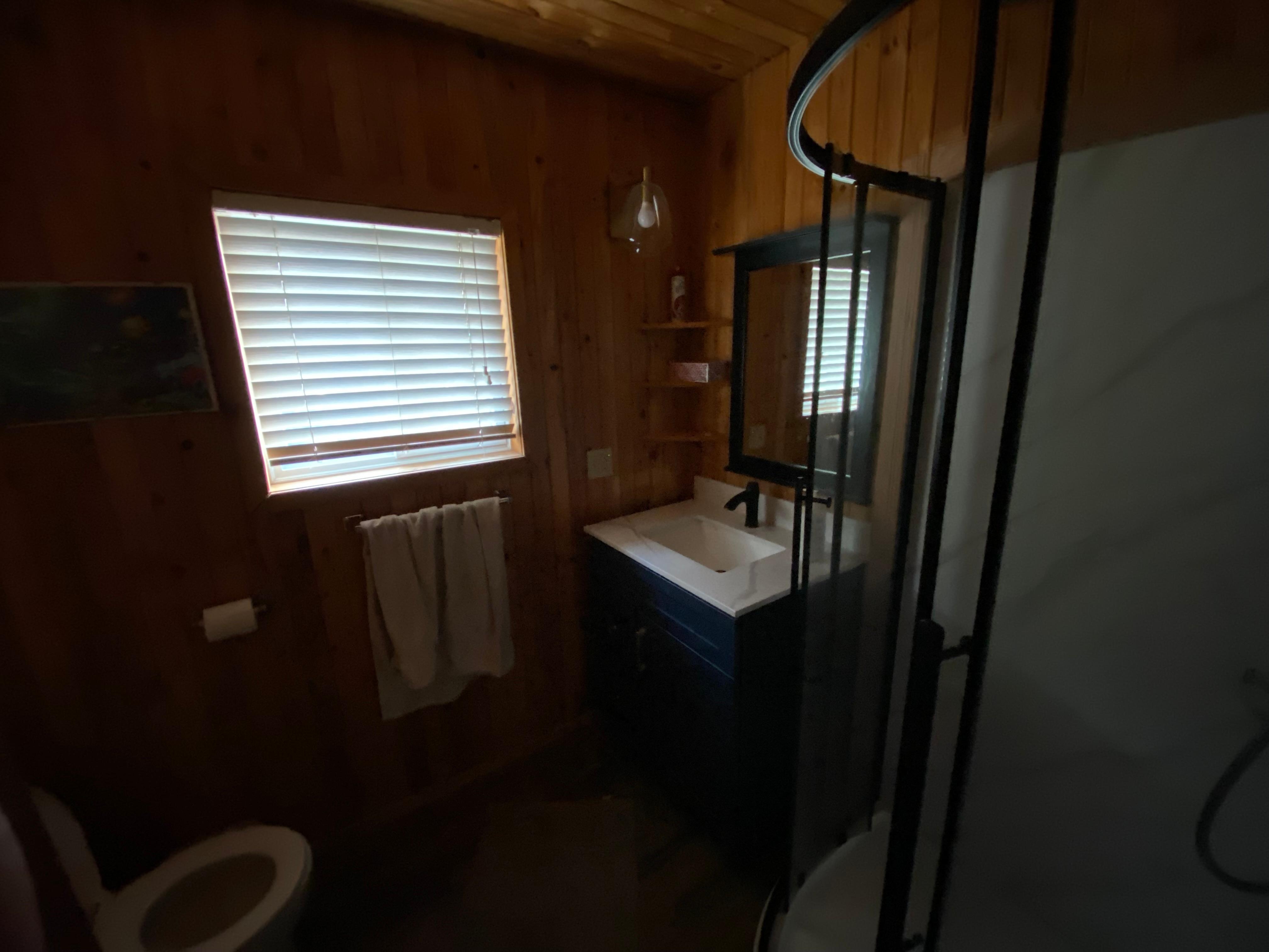Inside you find 2 levels. The top level includes dining, living room, kitchen, washrooms, master bedroom & a small kids bedroom with bunk beds. There is a large deck with walk out from both master bedroom and living room.