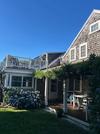 This classic Cape Cod house is full of traditional charm and features without skimping on the modern amenities. Upstairs there are four full bedrooms, a child's bedroom, a full bathroom and a deck offering glorious ocean views. Downstairs there is a bedroom, large kitchen, two living rooms, walk-in pantry with full laundry, and a bathroom with a tub. Outside you can enjoy a large covered porch, a huge lawn, an outdoor shower, and a shared tennis court. Stage Harbor beach is a five minute walk and Lighthouse beach is five minutes away by car or bike. Oyster Pond beach and the town are also five minutes away by car.