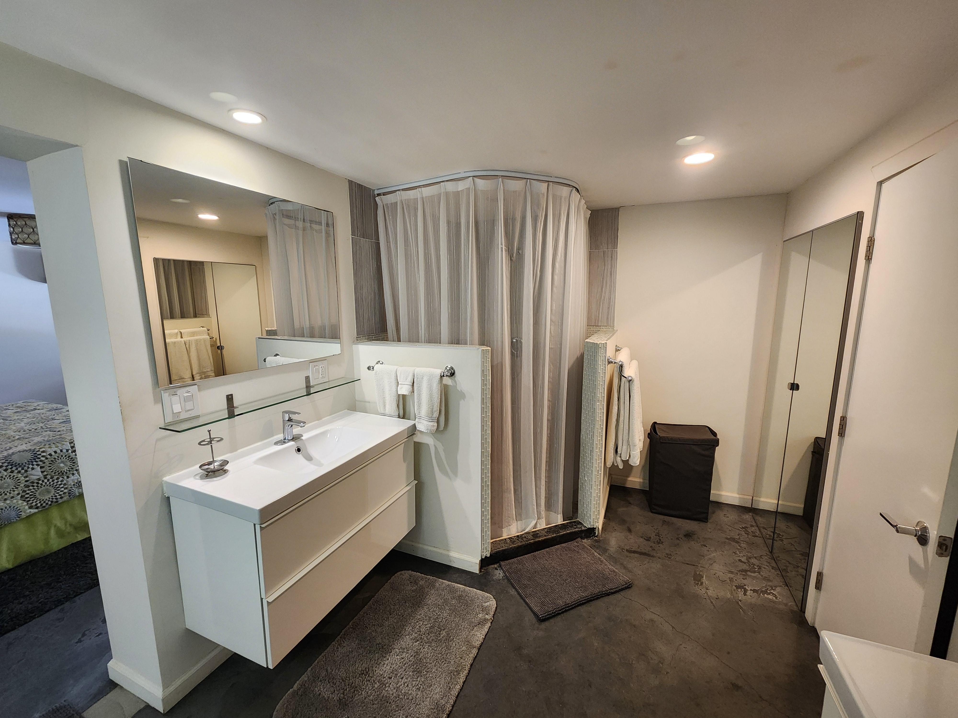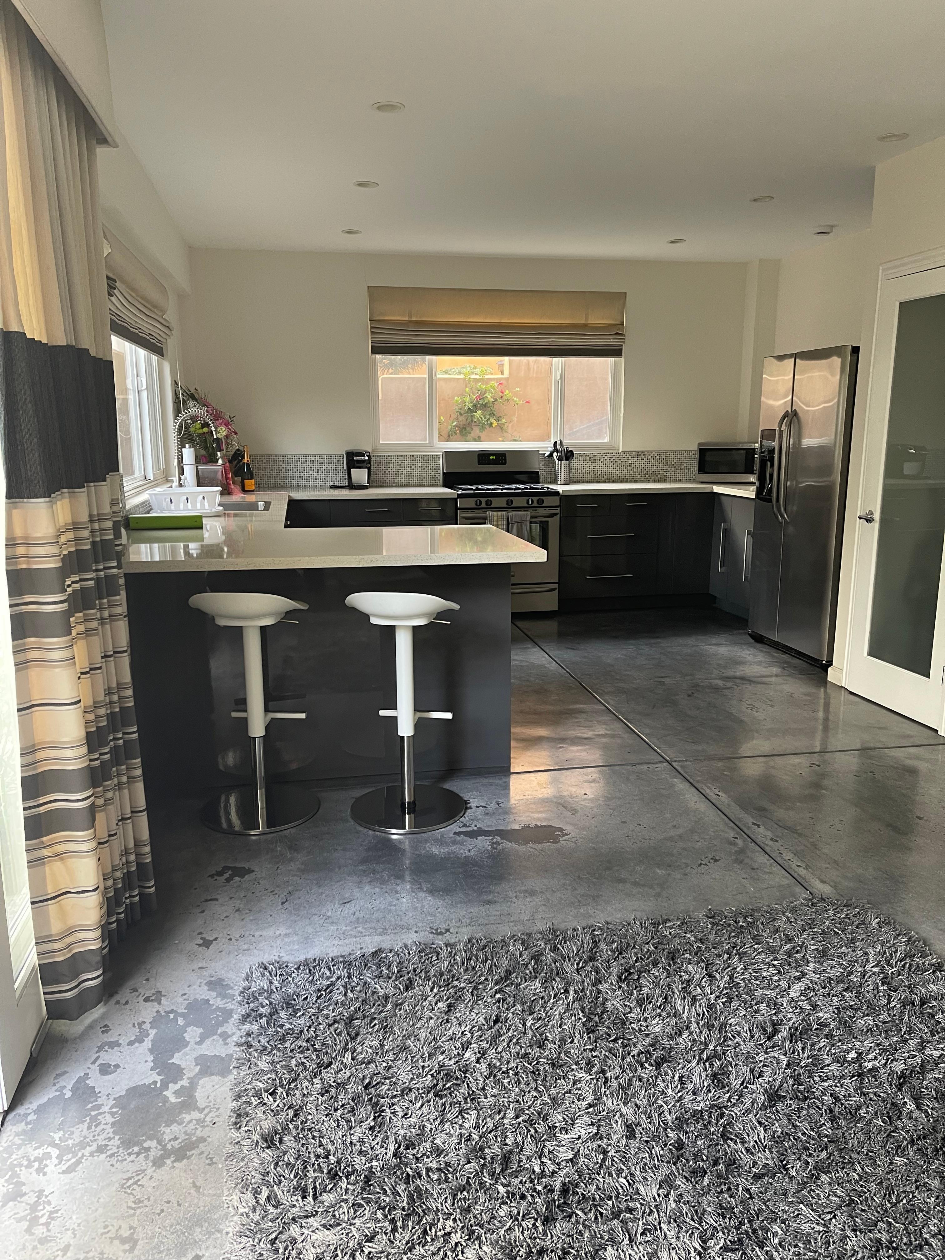 High-end fully stocked modern kitchen with new stainless steel appliances, quartz counter-tops, polished concrete floors and dining for six makes this the ideal location. The apartment offers air conditioning, heating, a washer and dryer for your comfort, and convenience.