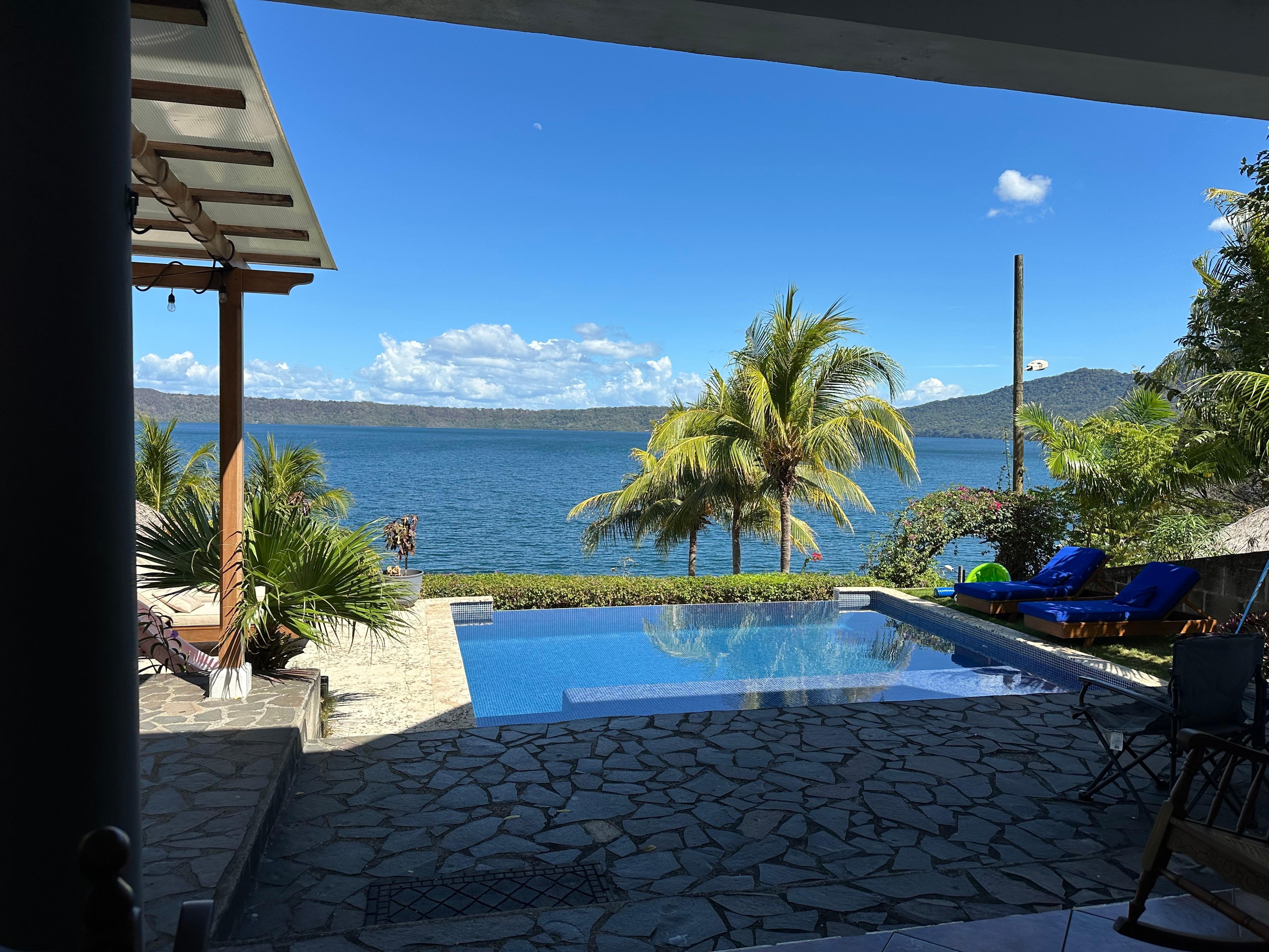 Aguas de Apoyo is a beautiful property nestled at the waters edge of one of the most visited national reserves in Nicaragua. The solid well built walk out lower level style house is set up as a multi purpose facility. Family Gatherings, Anniversary Parties, Mission Retreats, Weddings, or just simply a private getaway are all ways that you our guests have enjoyed our property. The top floor has a large master bedroom with walk in closet and ensuite bathroom / shower. Glass sliding patio doors open to the amazing view of the lake from the balcony. A second bedroom is furnished with a queen bed, desk, closet, and large windows with a view of the reserve. A third bedroom has two single beds, walk in closet, and also a view of the reserve. Bedroom two and three share a bathroom furnished with a bathtub option. All of the bedrooms have high efficiency split A/C units with remote. The sitting room faces the lake and often has a refreshing breeze enter through the open patio doors. Beautiful balcony with glass railing system affords safety without compromising the view of the Lake. Enjoy a fully furnished kitchen, authentic nicaraguan dining room table and a pretty impressive view of the lake. The pantry has a 4' chest freezer for your convince. The walk out lower level has been designed as a complete living area. Full kitchen and 8 chair dining room table. The master bedroom has a queen bed, full closet, ensuite bathroom. A second bedroom also has a queen bedroom set, and walk in closet. The third bedroom on the lower level has a queen bed and also two sets of bunk beds. The second and third bedroom on the lower level share a bathroom. All bedrooms have high efficiency split A/C with remote.