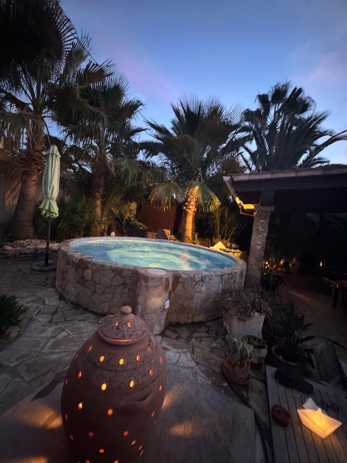 3 bedrooms, 2 bathrooms, spacious living room with open fireplace, dining room with large sliding door to the terrace with a view of your own palm trees. Very well equipped kitchen with large fridge and freezer, dishwasher, oven, ceramic hob, microwave etc., 2 large terraces, one of which is covered, the other with a large lounge set, private pool, outdoor shower, sun loungers, barbecue area, plot size approx. 500 m², edged with a privacy screen. An outbuilding with a washing machine and dryer round off the comfort. Televisions with satellite reception and German programs are also included. A covered carport for your car is available on the lockable property with gate entrance. A small safe for your valuables is also part of the equipment of the house.