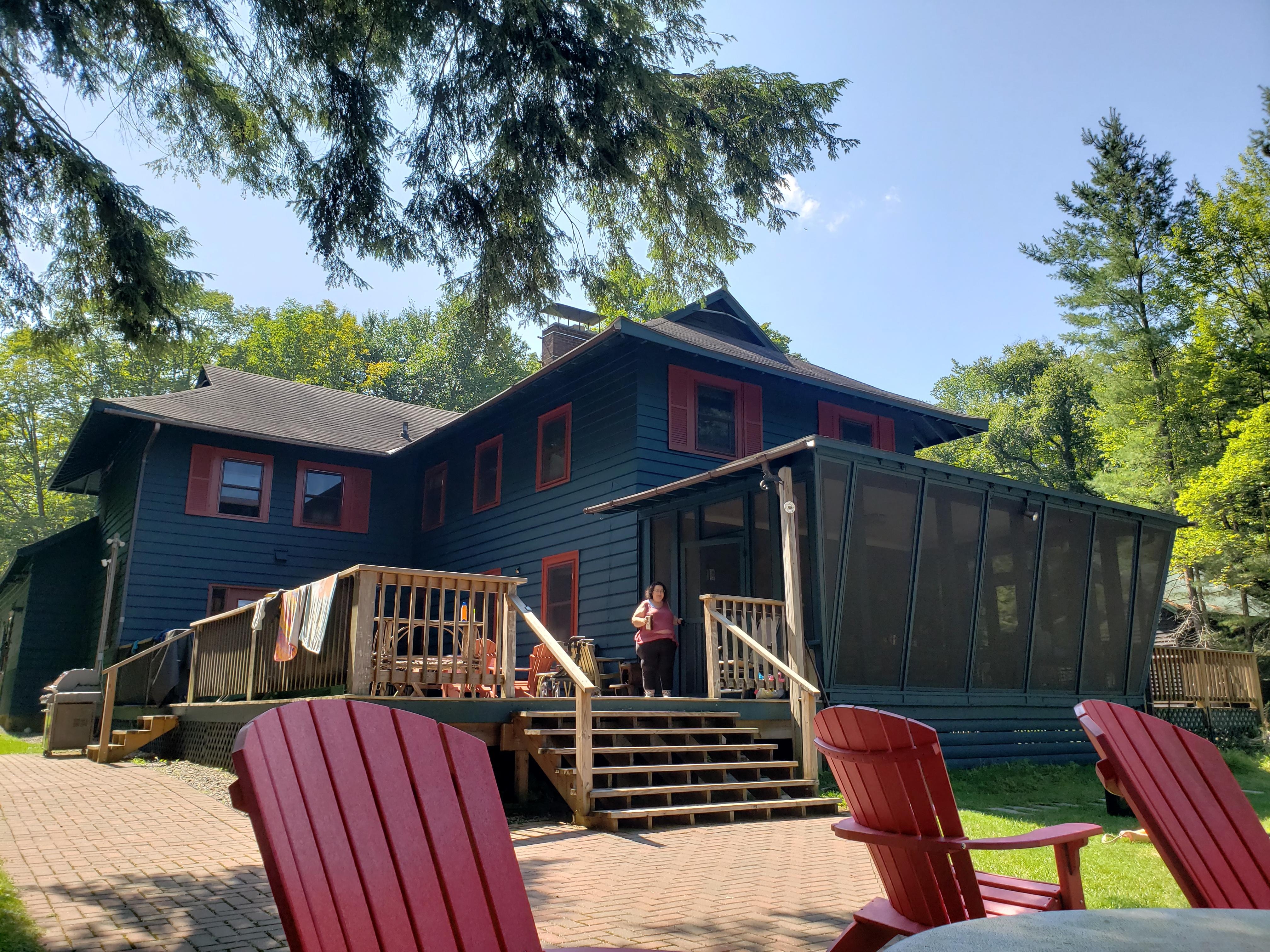 The Camp includes a comfortable lodge-style living room with fireplace and wide screen TV with cable with a selection of movie channels, a brand new large kitchen with island seating 6, and a dining area with antique table seating at least 8-10. The kitchen opens up to a large deck (one of two decks) with picnic tables and barbecue nearby and traditional Adirondack chairs. Three of the 6 bedrooms offer king-size beds (linens provided) with private or semi-private bathrooms. Two of the bedrooms offer 2 twin beds each, one of which is on the first floor with easy access. an en-suite bathroom and TV. The sixth bedroom is a bunk room with two bunk beds; both beds are full-size on bottom and regular-twin on top. The home is fully heated with dual modern furnaces, if needed.
