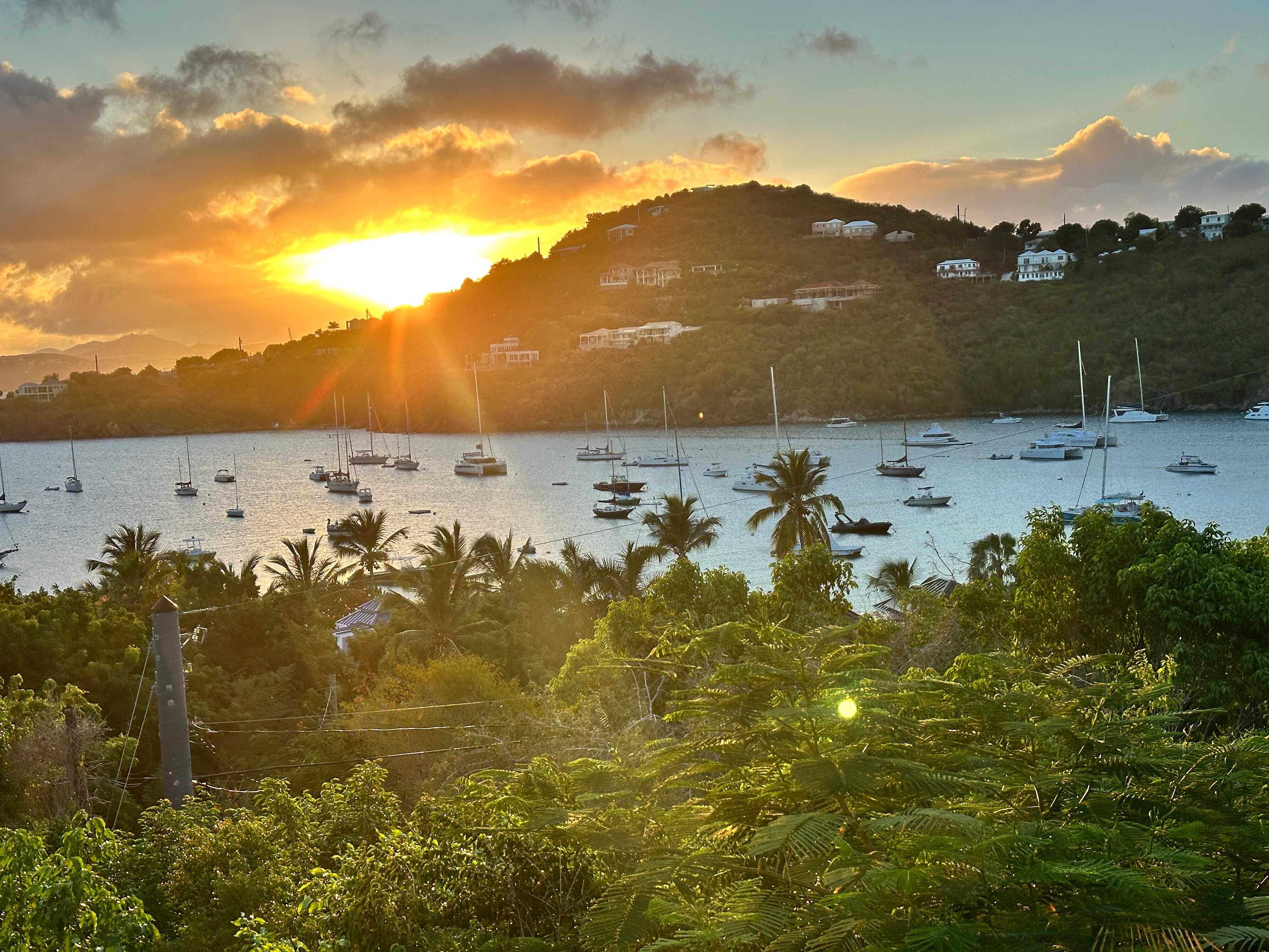 a harbor replete with boats, Pillsbury Sound, the hills of St. Thomas in the distance.