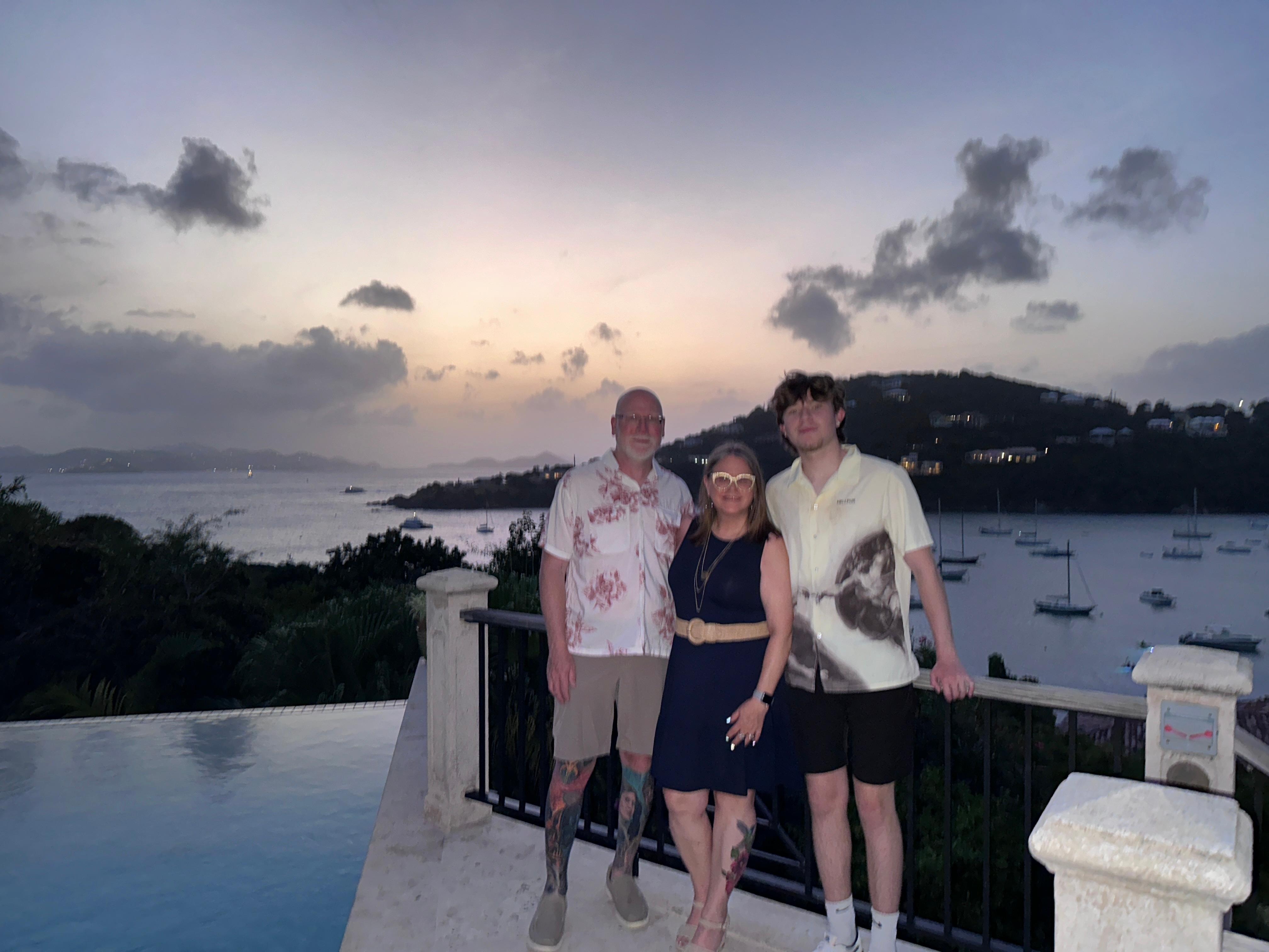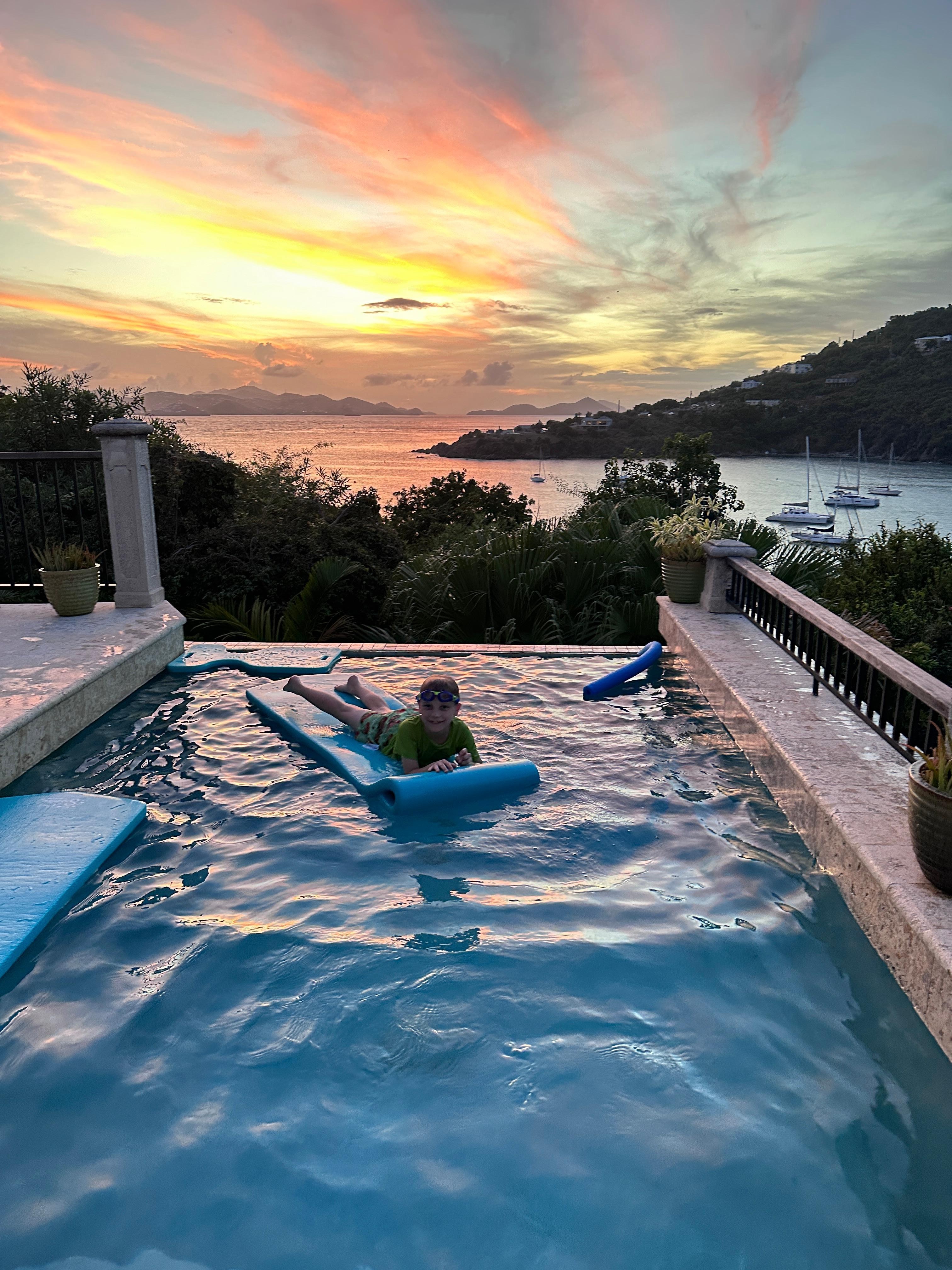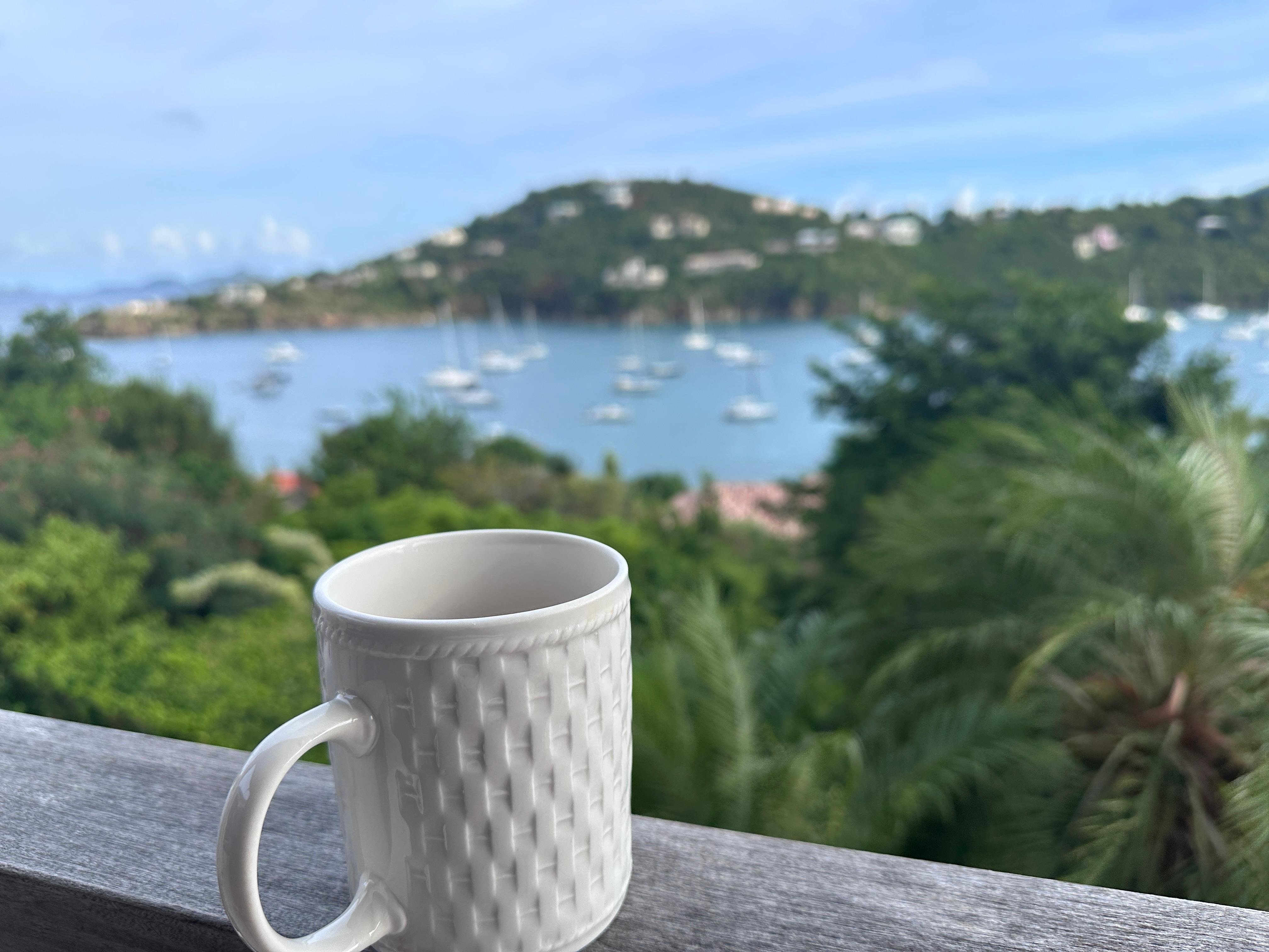 In the foreground, all of Great Cruz Bay and a fleet of sailboats bobbing at their moorings are visible just a stone’s throw away. (Our first guest joked about seeing if she could throw her return airline ticket that far.)