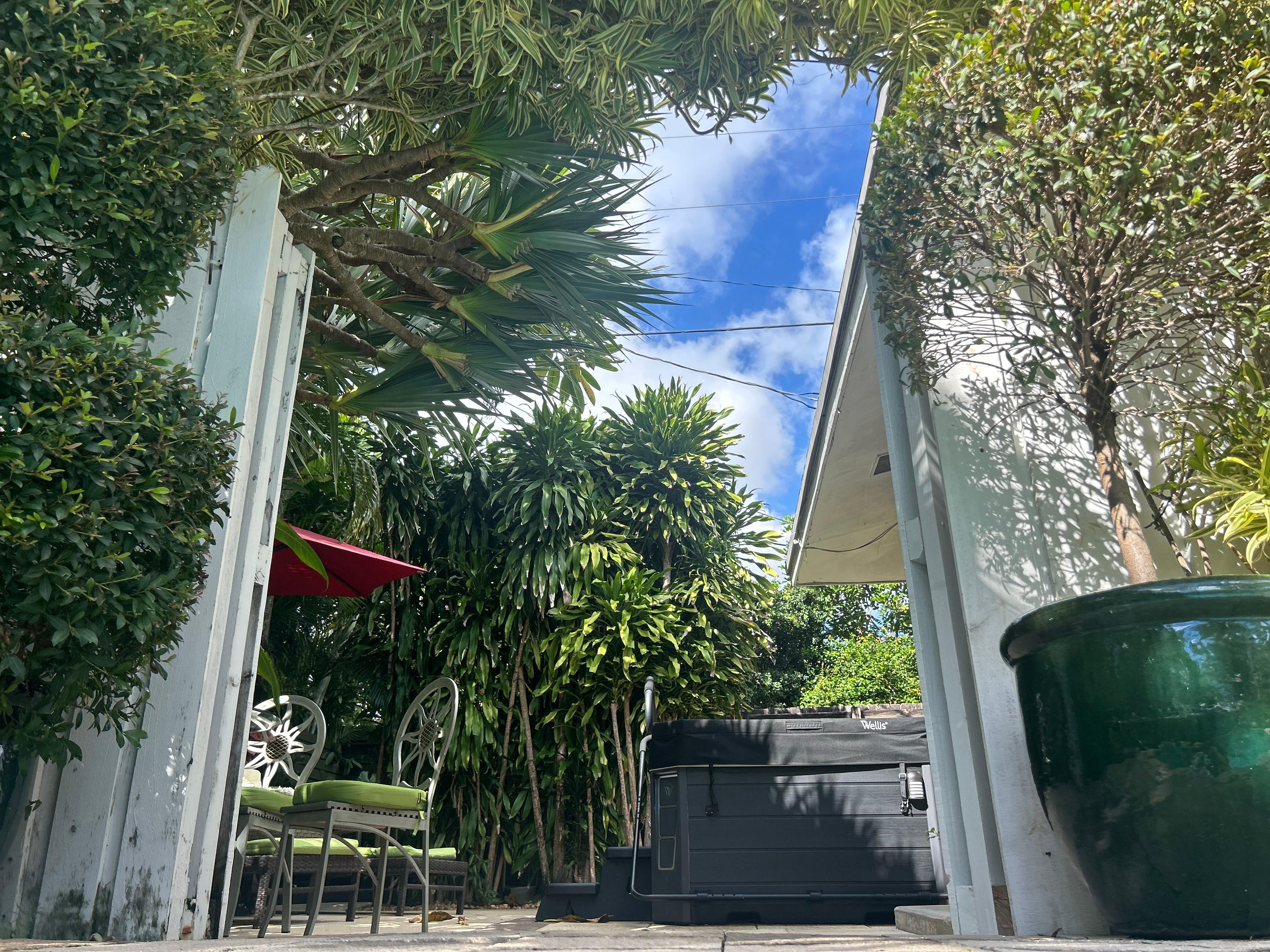 LANDSCAPED/ GARDEN-LIKE OUTSIDE -- The Cottage is comparable to a five star hotel room in this area, at a fraction of the cost. Your elegant guest home-away-from-home has its own private entrance through a secret, landscaped garden walk. The door to your cottage has its own security code off a beautiful, private patio with two chaise lounges, glass-top table for outside dining, a hot tub and an orchid-filled outdoor shower. Access to the shared-with-your hosts (but no one else) sparkling new, salt-water heated swimming pool (clothing optional), gas grill, outside dining area all enclosed with a privacy fence and gorgeous, lush tropical landscaping. A double-doored gate separates the Cottage from the pool area. You may choose to leave it open or close it for complete privacy.