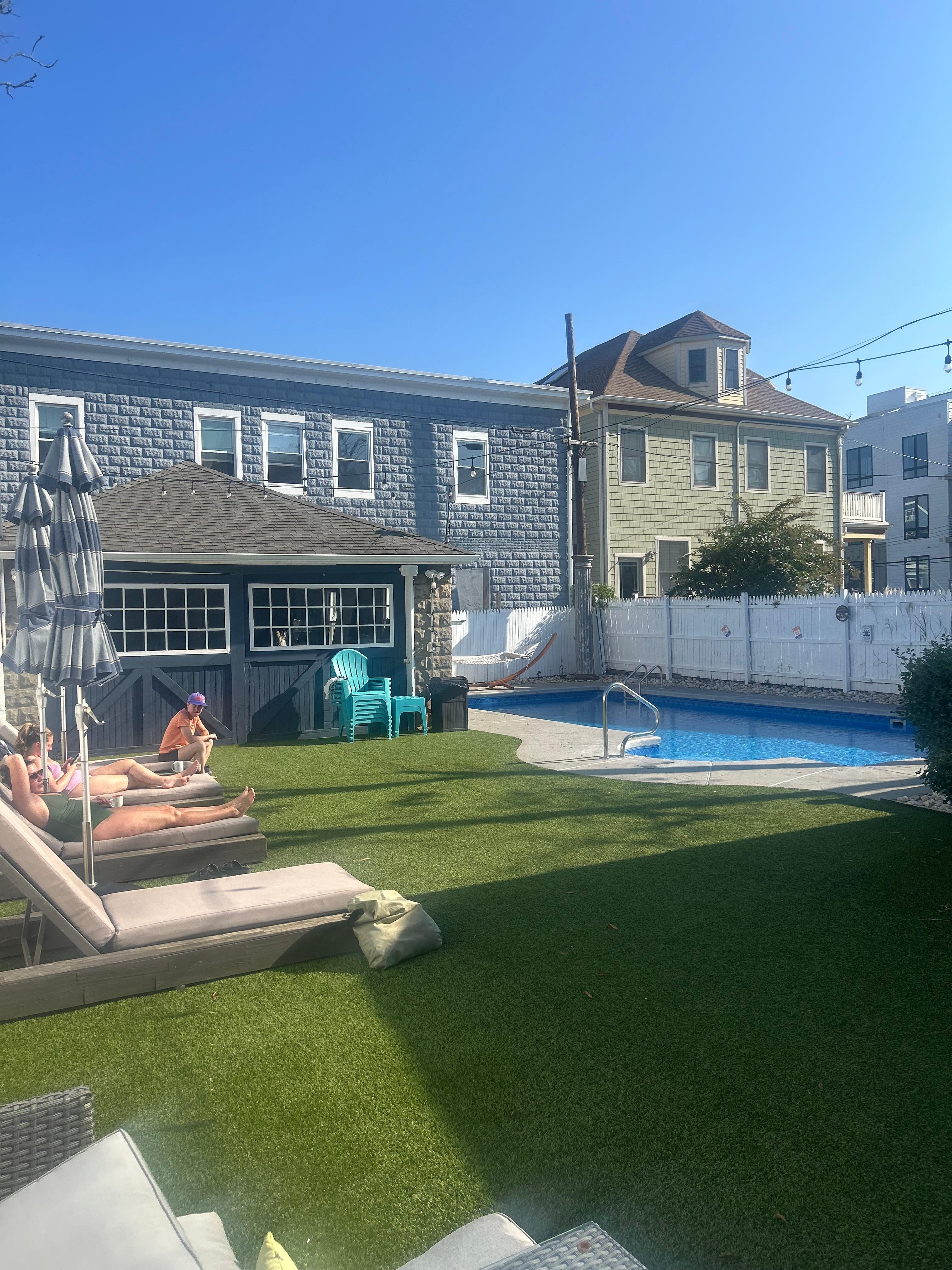 large (16x36) in-ground NO DIVE salt water pool (Pool open Memorial Day weekend and closes early September after Sea Hear Now music festival ). Pool heater will be set to 83. Please note photos there is no additional fence around the pool. Children must be supervised by an adult at all times when in backyard.