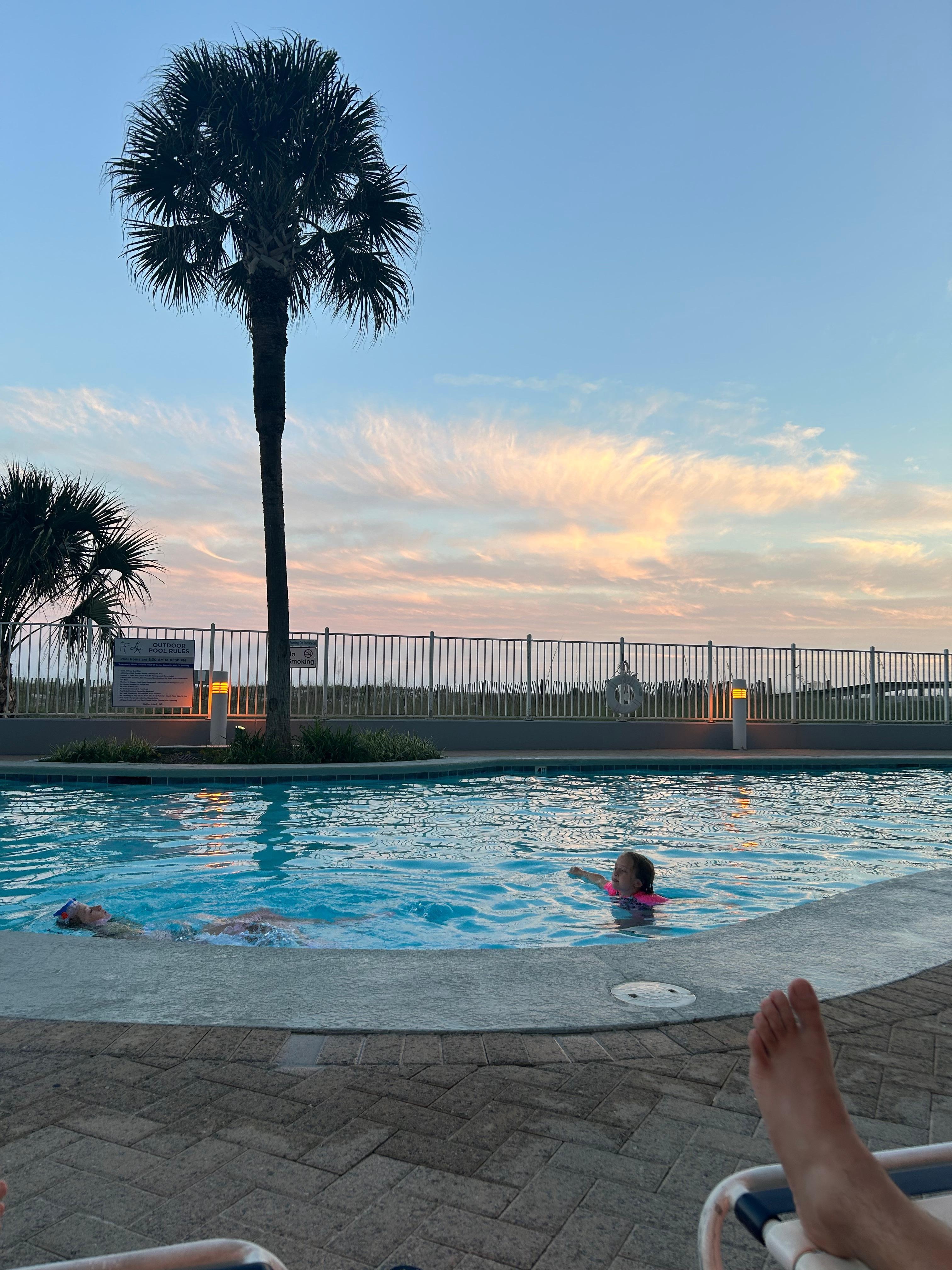 The balcony has a breathtaking view of the Gulf of Mexico and pools below. It also has a table that seats six and a lounge chair for relaxing. We enjoy the spectacular sunsets!