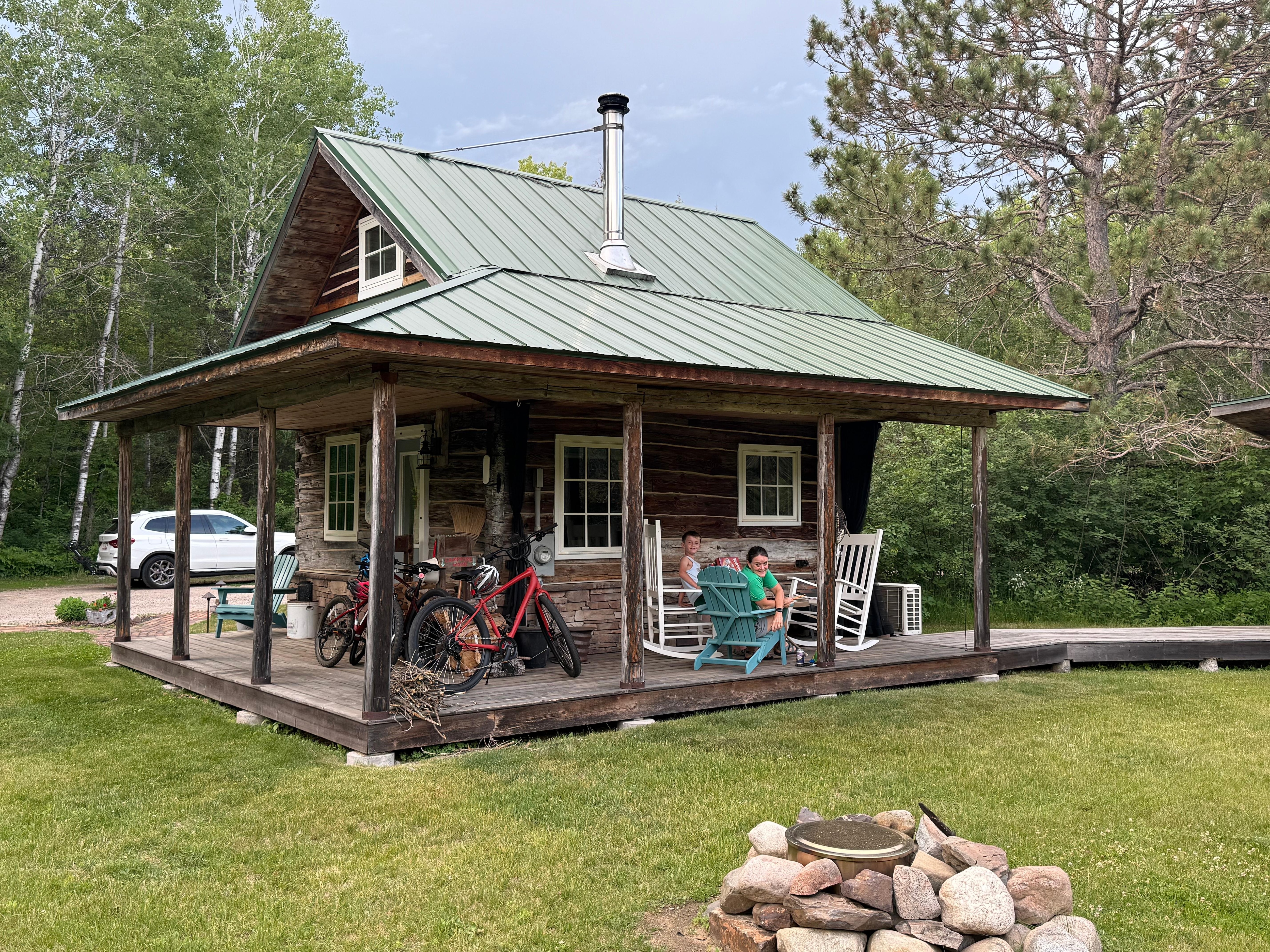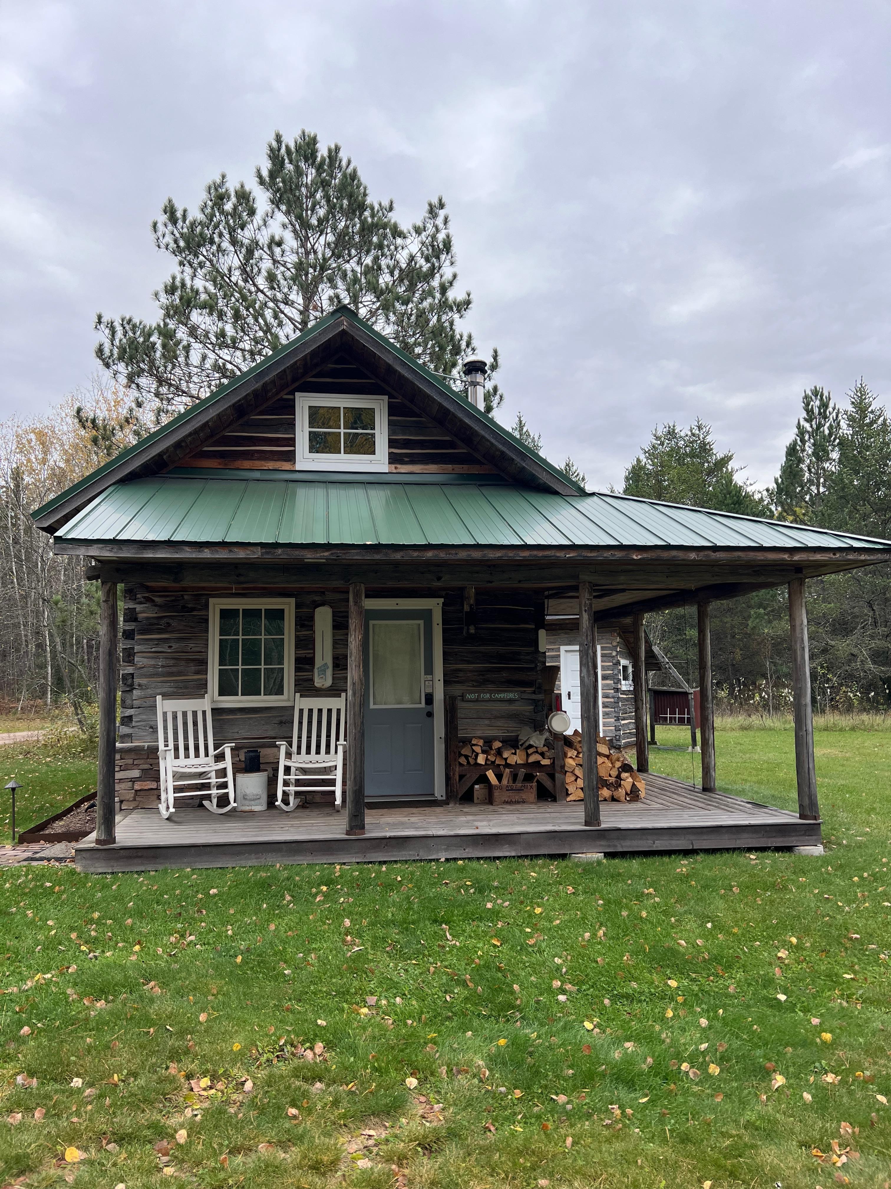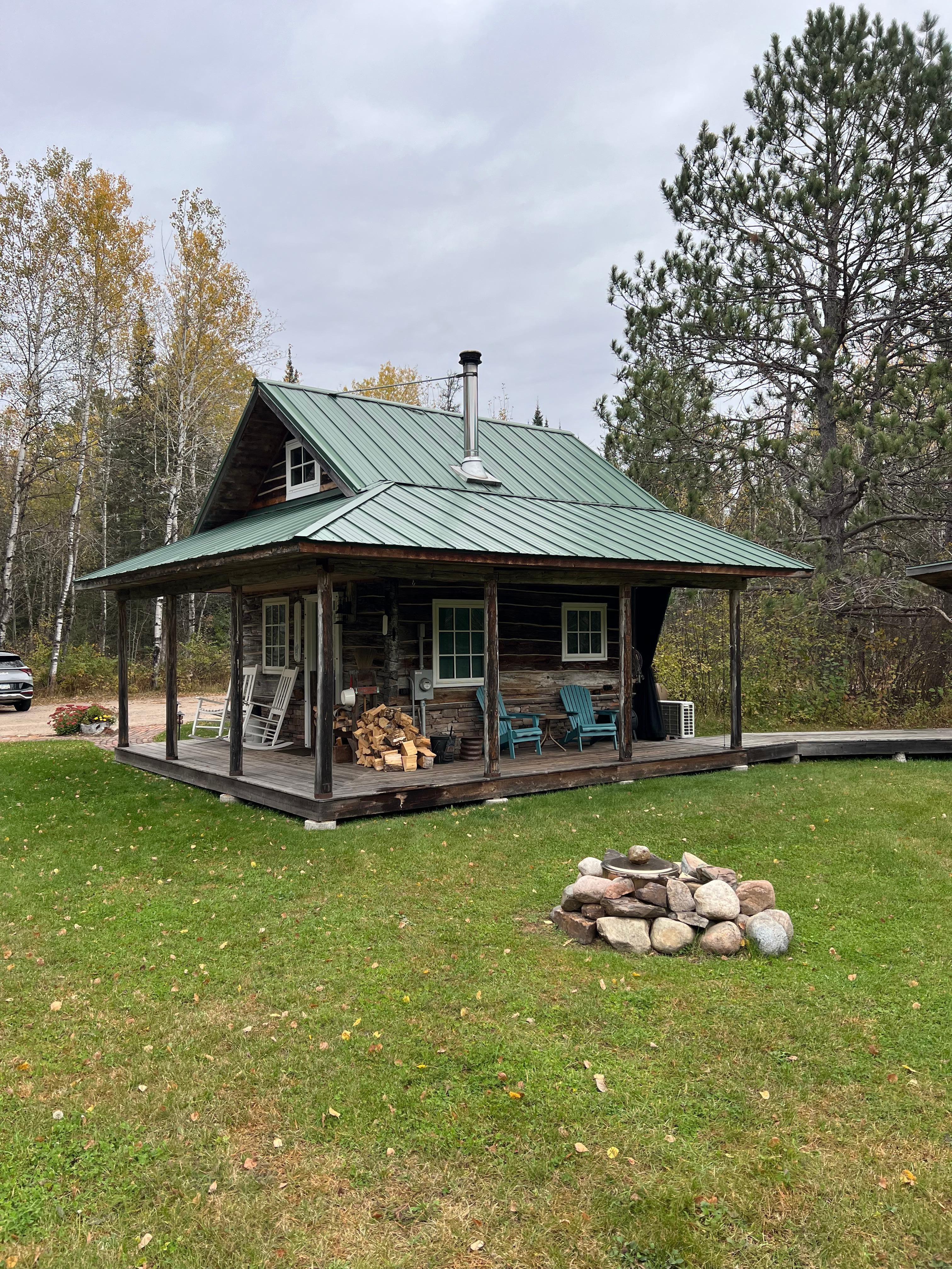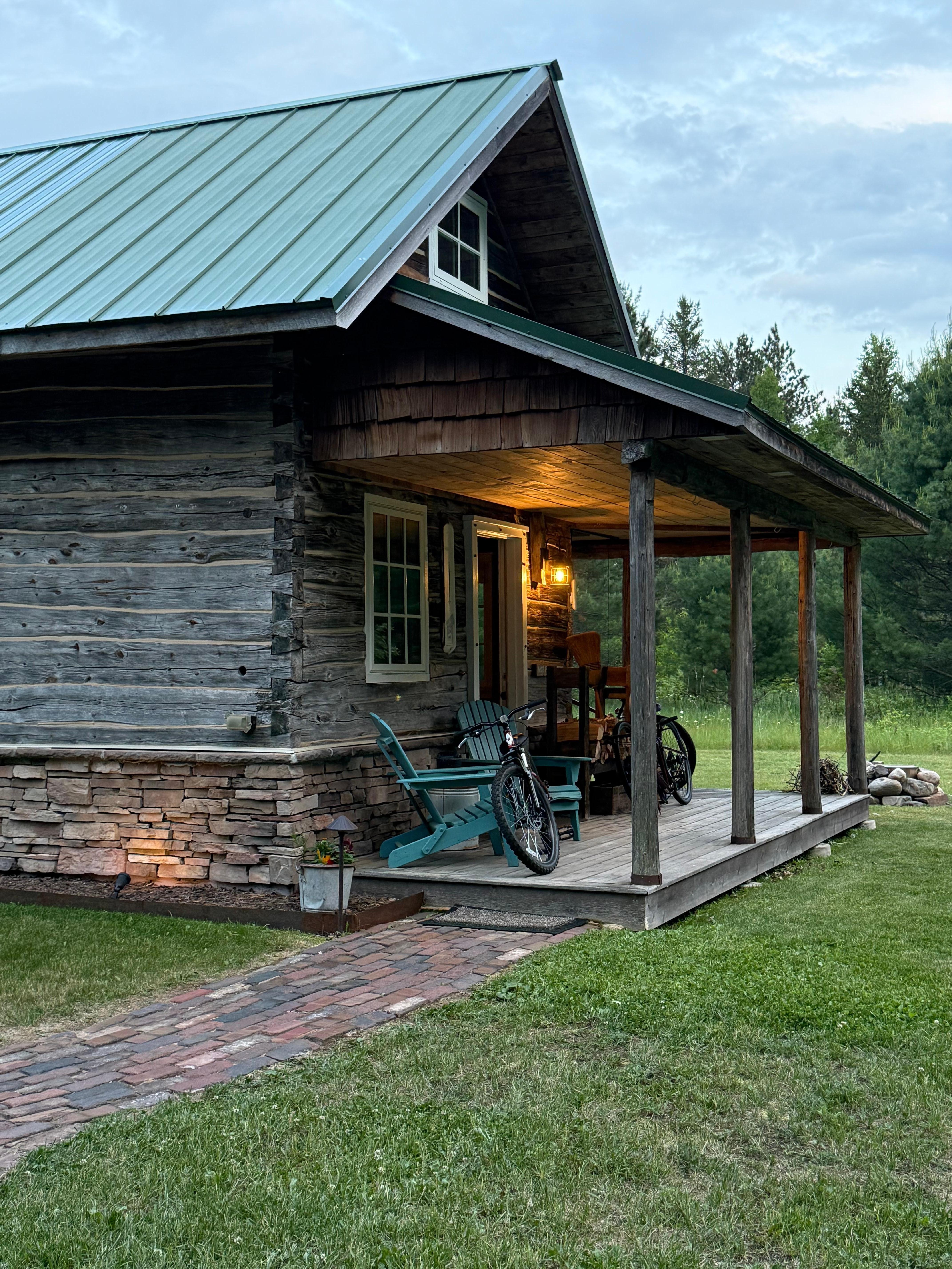 We believe big things can come in small packages. The Log Cabin is a comfortable and very well-equipped home in a small footprint. This 1890s hand-hewn log cabin has been beautifully updated into a modern, cozy space. The 15′ x 15′ floorplan includes a kitchen, dining table, sofa and wood stove, plus a full bathroom neatly tucked below the loft staircase. Thanks to the Norwegian owner (who also happens to be an engineer), this Finnish log cabin is equipped with modern mechanicals including air conditioning, in-floor heat, and a high-efficiency tankless water heater for endless hot water. To complete your log cabin experience, there is also a gorgeous glass-fronted wood stove and always a full supply of firewood available During your stay. The well-appointed kitchen on the main floor includes a 2-burner gas cooktop, farm sink, concrete countertops, an undercounter refrigerator/freezer, coffemaker, teapot, and cookware/serving ware for 2-3 guests. A microwave and countertop convection oven are also provided in the nearby closet should you need them. The upper floor provides a peaceful rest space with a full-sized platform bed, reclaimed oak flooring, vaulted ceiling, air conditioning, DVD player/monitor, and great views of the surrounding forests. Outside, the wrap-around porch covers the south and west sides and includes a custom screen enclosure for bug free lounging in the warmer months.