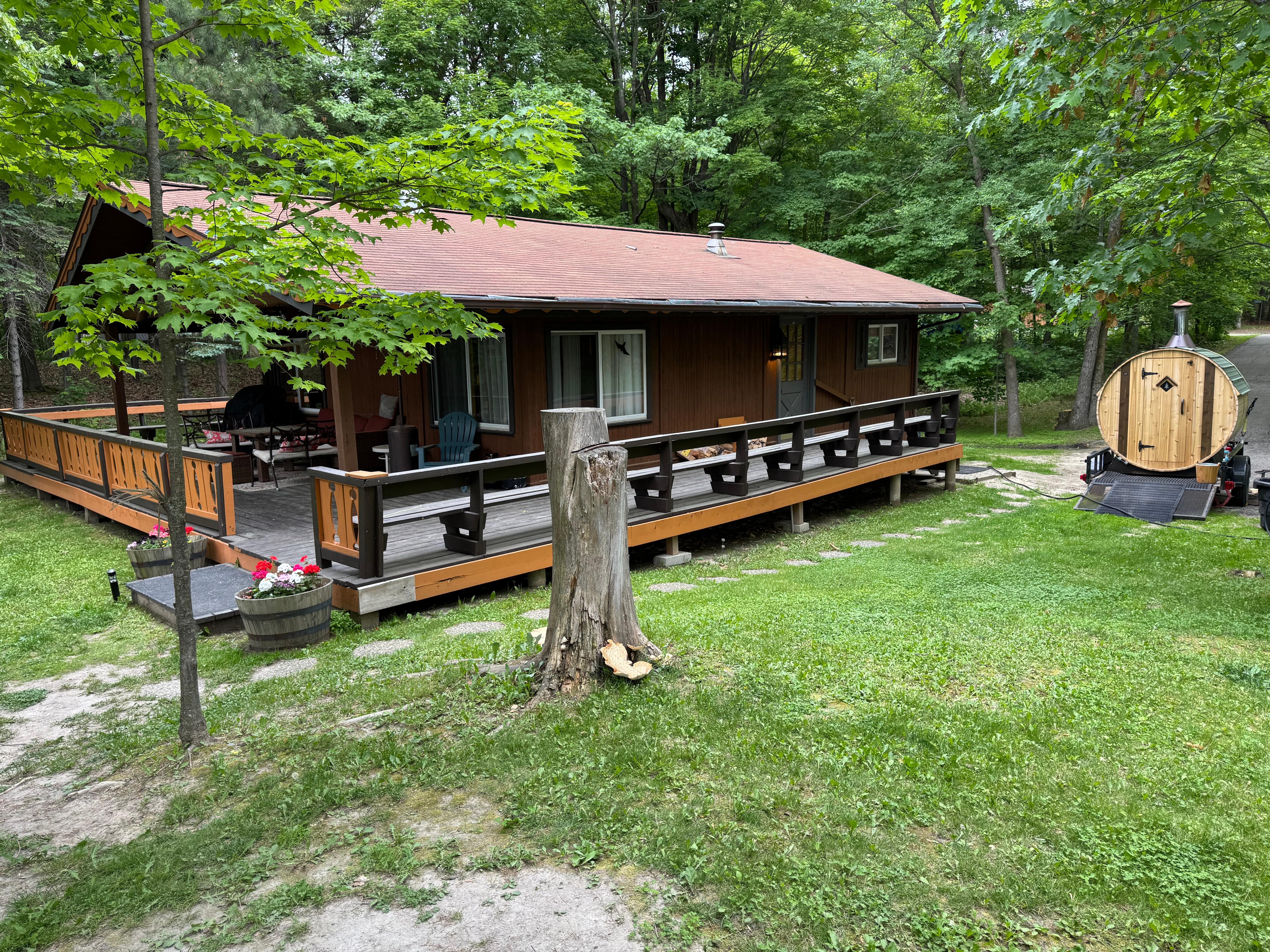 2 bdrm, 1 bath, sleeps 6. The cottage has been thoughtfully updated for modern life with top of the line kitchen appliances, hand scraped hardwood floors, brand new pillow-top mattresses, vaulted log ceilings, 40 inch flat screen with Satellite TV and lightning fast internet. With a huge front deck and comfortable patio furniture, grilling and sunsets are a must every evening.