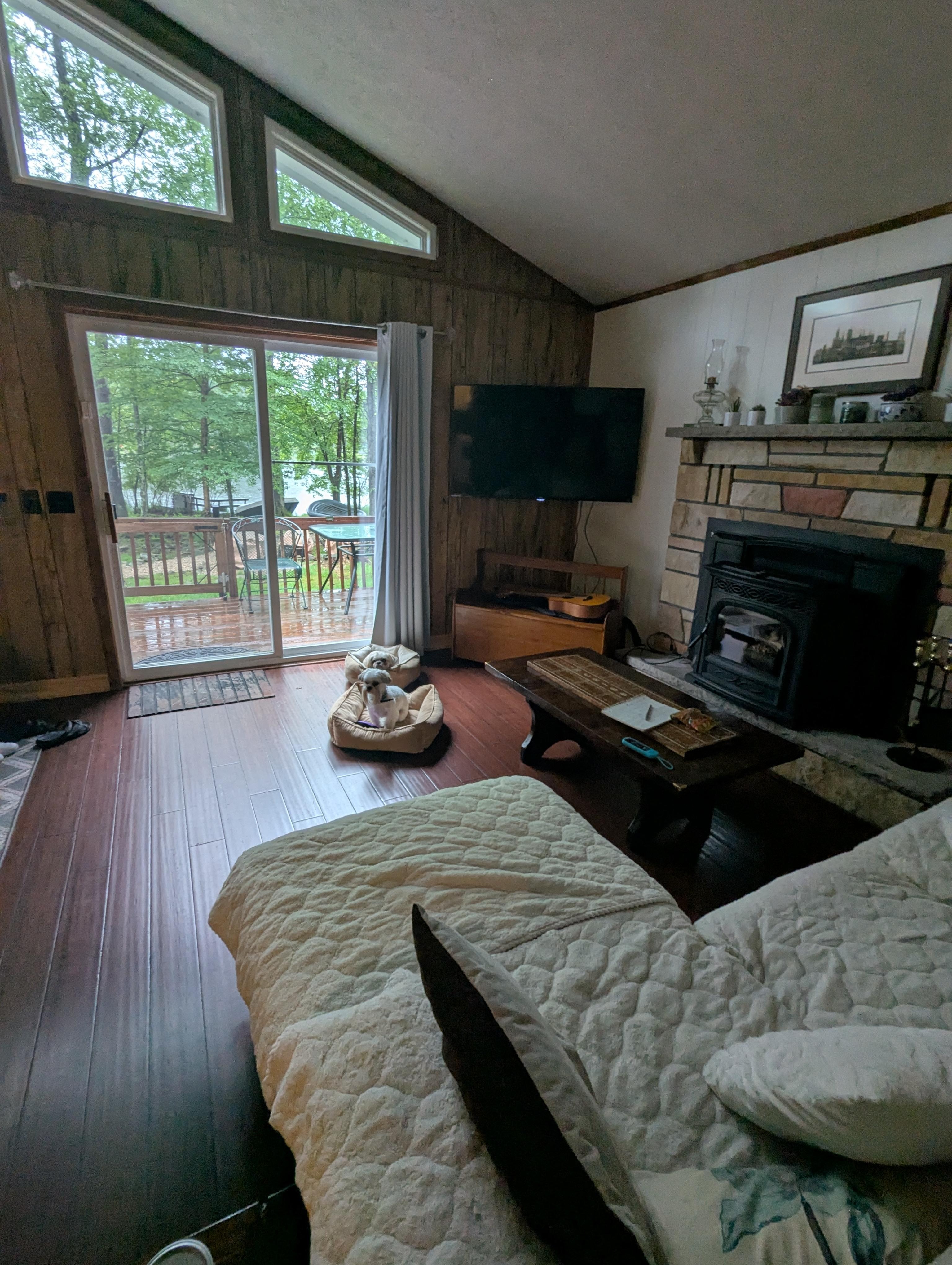 Cozy lakefront chalet located on a quiet cul-de-sac in a gated community. Enjoy the private wooded quarter acre lot with a private dock on Lake Carobeth and a deck with patio doors so you enjoy the beautiful lake views while outside or inside by the fireplace. Located a short drive to most of the area attractions including Kalahari, Camelback, Pocono Raceway, The Crossings Shopping Outlet, Mt Airy Casino, and Great Wolf Lodge.