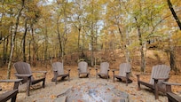 Further exploration leads to the creek and a fire pit surrounded by chairs, where guests can enjoy the tranquil sounds of nature and the warmth of a fire.