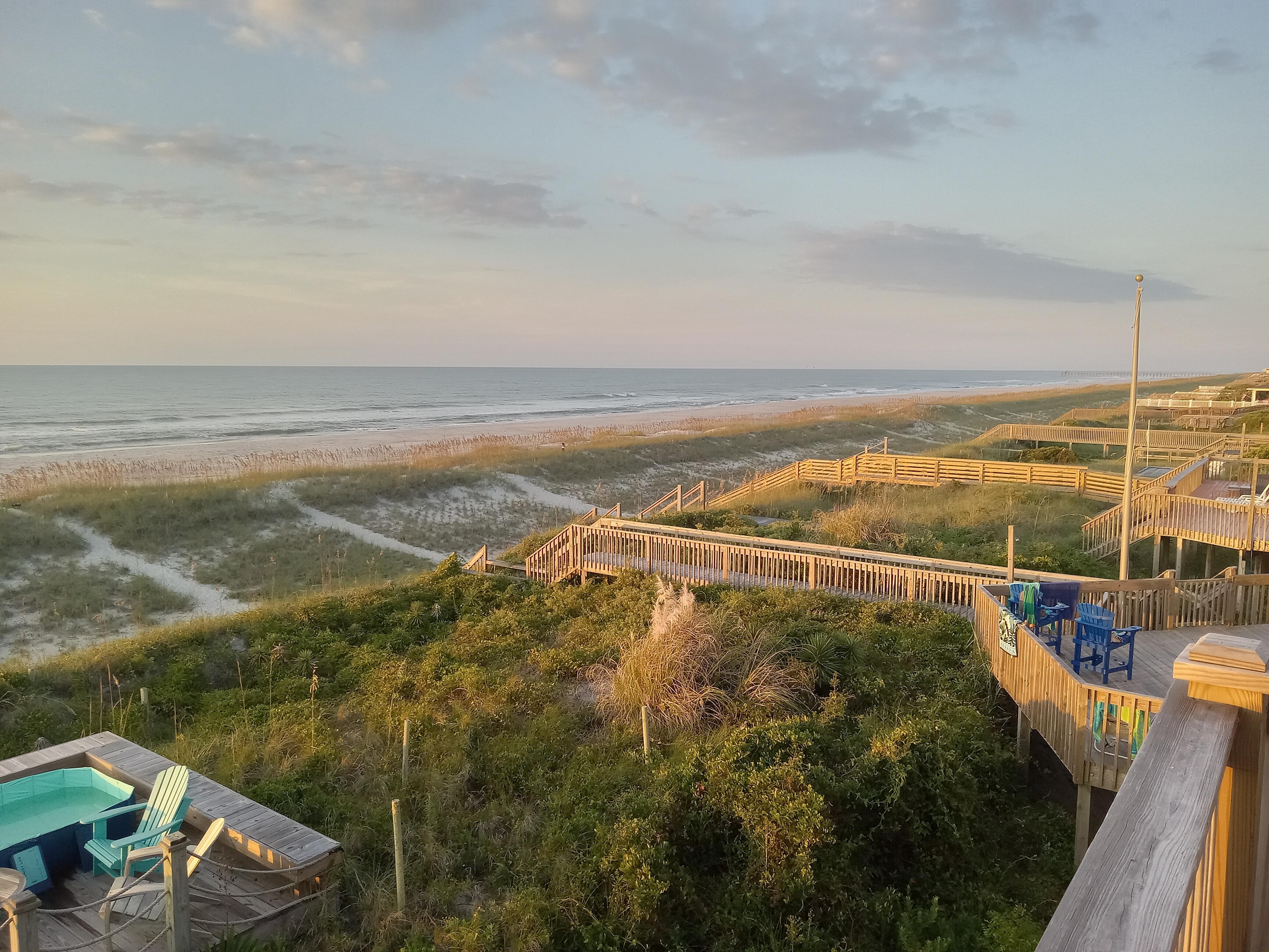 Dine in style at the large indoor table or take your meals outdoors on the top deck’s dining set, all while enjoying the beach breeze. The lower level features three bedrooms, each with deck access, including two master suites. Upstairs, an additional bedroom boasts a private balcony with breathtaking views of Topsail Sound. Both decks lead directly to a private beach walkway, where a newly enlarged dune deck with seating provides stunning Atlantic Ocean views and refreshing salt-air breezes.
