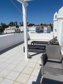 Spring Summer Autumn Winter Sunshine Specials Free WiFi Cabanas is a typical small & pretty fishing village/beach resort located in the natural Eastern Algarve, 4km from Tavira. It has a friendly & family atmosphere. Surrounded by best beaches, golf courses & countryside Algarve has to offer. This penthouse, spacious one bedroom apartment is luxuriously appointed and in the heart of the old historic village. Three great outdoor large terraces for your bbqing, alfresco dining including a private rooftop patio offering great sea & mountain views with lounge chairs & sunbeds. Situated one street from the sea front promenade. It is within walking distance of unspoiled white sandy beaches, many local restaurants, bars and shops. Local produce & fresh fish available at the daily market. Convenient buses & trains to all areas of the Algarve and Spain. No need for a car! There are 4 superb golf courses within easy reach. Close by there is a resort with tennis, rental bikes and cars. Free Wi Fi. Aircon available at a cost. Book now for last minute get away or long term stays.