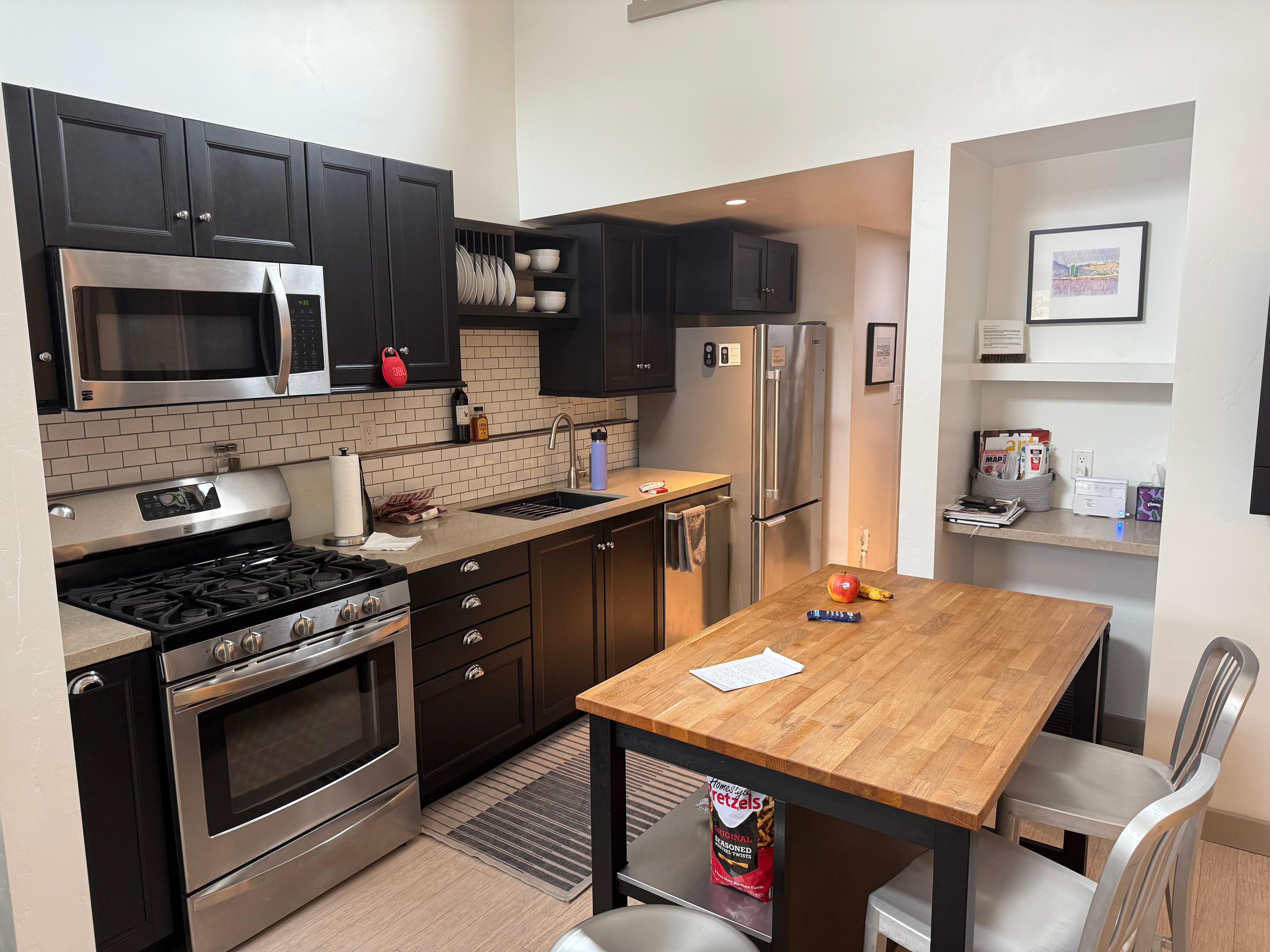The Artists' Cottage on the corner of Eight and Euclid was completed in December of 2015 and has over 600 square feet of bright south facing living that accommodates two to three guests (additional nightly charge for 3rd guest). The cottage is a free-standing building separate from the owners’ house and has its own parking, entrance, flagstone patio, small yard and view of Mt Sopris. With a vaulted ceiling, gas fireplace and bamboo floors the cottage is a warm contemporary space to spend a few days or a few weeks. A separate bedroom with a queen bed, blackout blinds and high thread count linens guarantee a great night’s sleep. A hotel style twin size roll-away bed is available to be set up in the living room for a third guest. The bath has a walk/wheel in shower and a separate room with commode and washer/dryer. The kitchen is fully equipped with gas convection range, microwave, dishwasher, refrigerator, toaster and both a multi-cup and single serve coffee makers and all the utensils and serve ware needed to prepare and serve meals. There is an attached storage area for skis and other sporting equipment. Cable TV and free WiFi allow guests to stay connected. While the cottage is not ADA compliant, it has no stairs and is fairly accessible depending on an individual’s needs. Please inquire for more detail about accessibility.