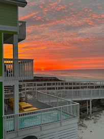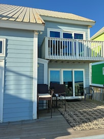 Living: Marilyn's Cottage is perfect for multi-generational or family friends with kids. Each of the three bedrooms has its own bathroom, a seldom-seen feature for a 3-bedroom--- so you don’t have to share your bathroom with the kids while you’re on vacation! Upstairs in the master bedroom, there is an amazing view from its private balcony. This is our favorite sunset happy hour spot! In the upstairs bunk room, there are two sets of bunk beds - that sleep up to six people, along with an en-suite bath with tub. In the main level guest bedroom, there is easy access to the living space without having to climb any stairs. This is perfect for grandparents or little ones. There is one sleeper sofas in the living room, perfect those early risers or ones that make a lot of noise in the morning before you have had your first cup of coffee. There is plenty of furniture on the deck - along with a large picnic table for you and your family to enjoy. Finally, there is a convenient shower right off the beach - so you can wash the sand and salt water off before coming back inside to relax with your favorite beverage.