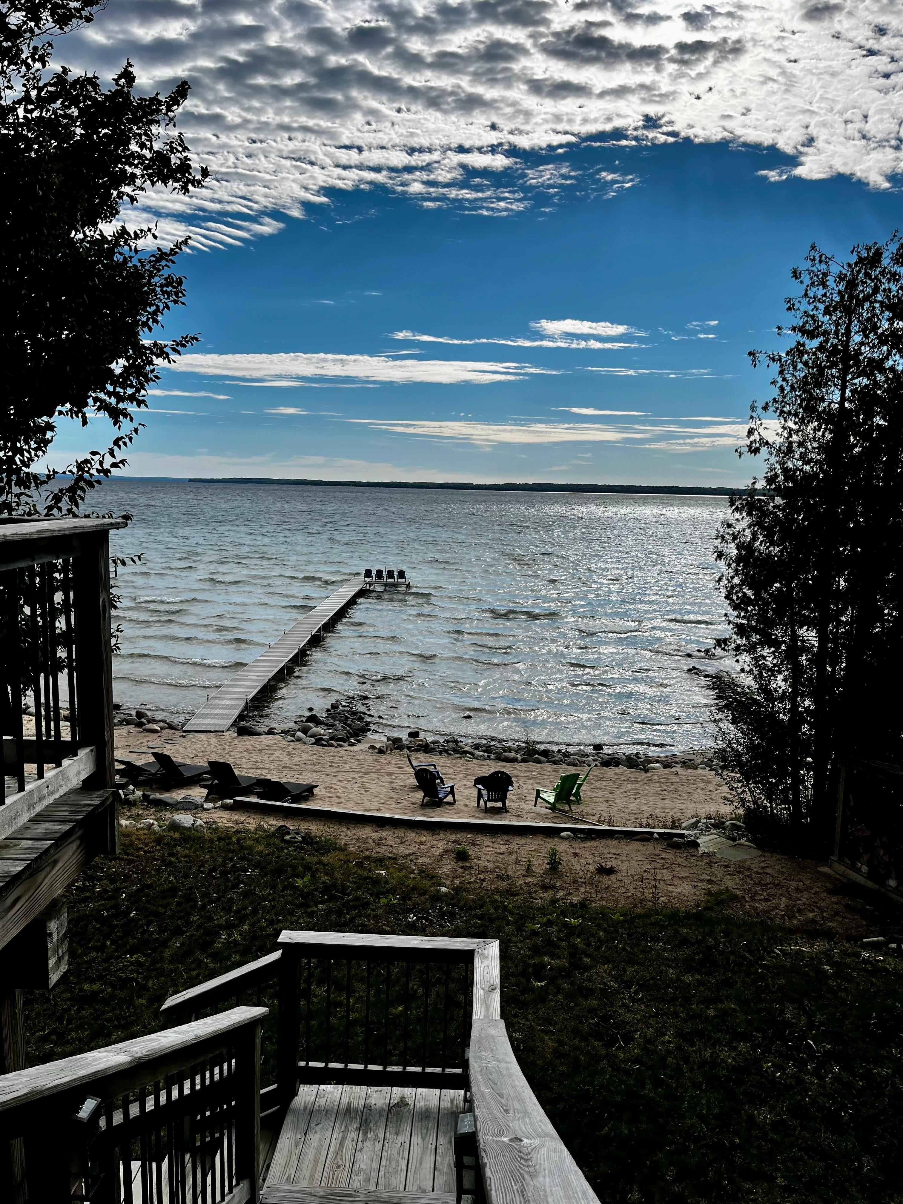 "SUNRISE ON SUTTONS BAY" was designed by a local Architect to frame views of the Bay from every room. Pulling Into the Driveway You will see the magnificent blue waters of Sutton's Bay. The Foyer Gives Way to a Two-story Living-room, Vaulted Ceilings, a Gas Fireplace With Gorgeous Two-story Stone Chimney and a Glass Wall of windows With Views from Water to Sky. There Are Several Inviting Seating Areas Including the Living-room With Two Full-sized Sofas, the Loft Library Perfect for Cards and Games With Large Sectional Sofa, and the Screened Porch With Sectional Sofa and Lots of Cushions. Downstairs, there is a large leather sectional sofa and a 70" screen smart tv for a fun family movie night or a rainy afternoon snooze! There Are Additional Areas to Gather Out On the Back Deck and a Charming Swing On the Front Porch.