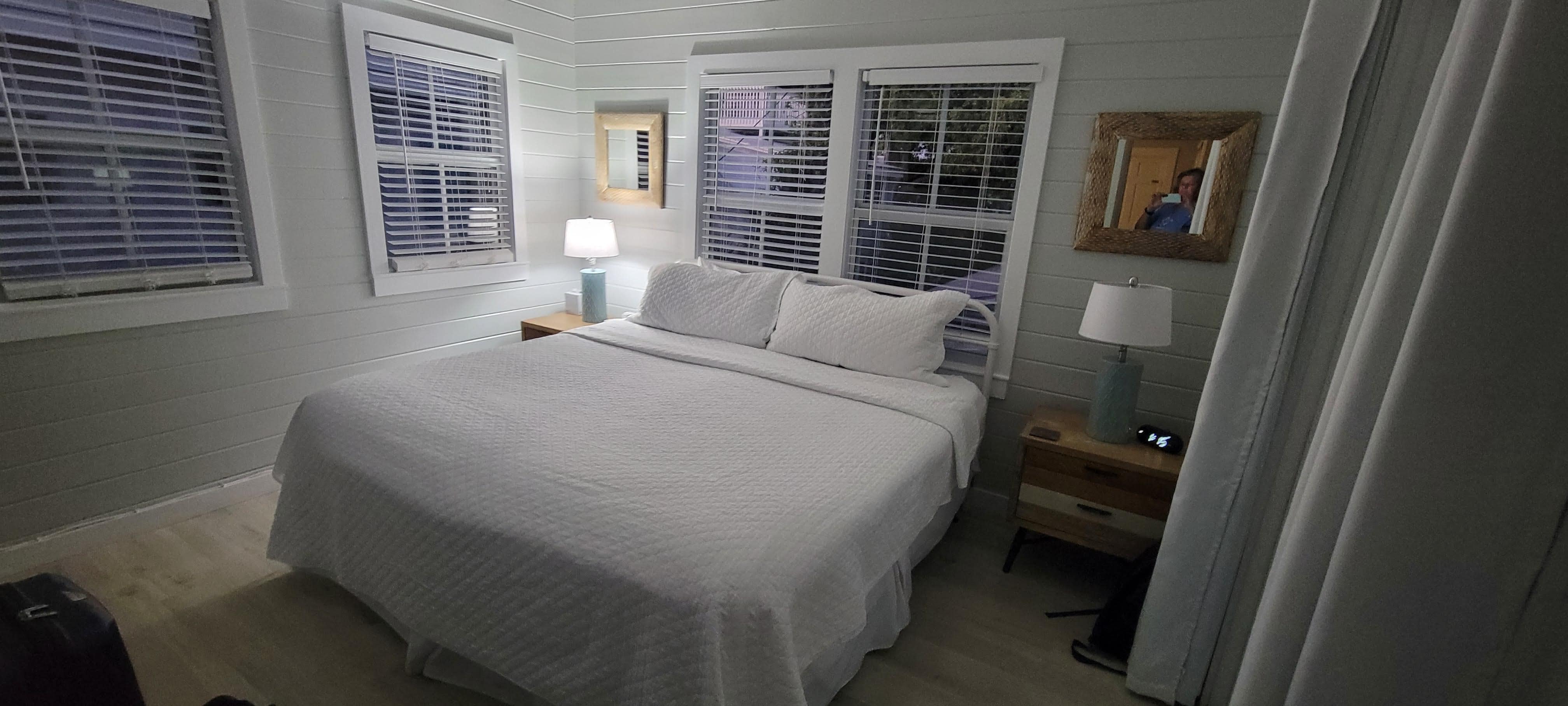 BED CONFIGURATION: The king bedroom has an ensuite bathroom with a tub/shower combination and a mini-split AC. There is a sleeper sofa in the living room for a child or guest.