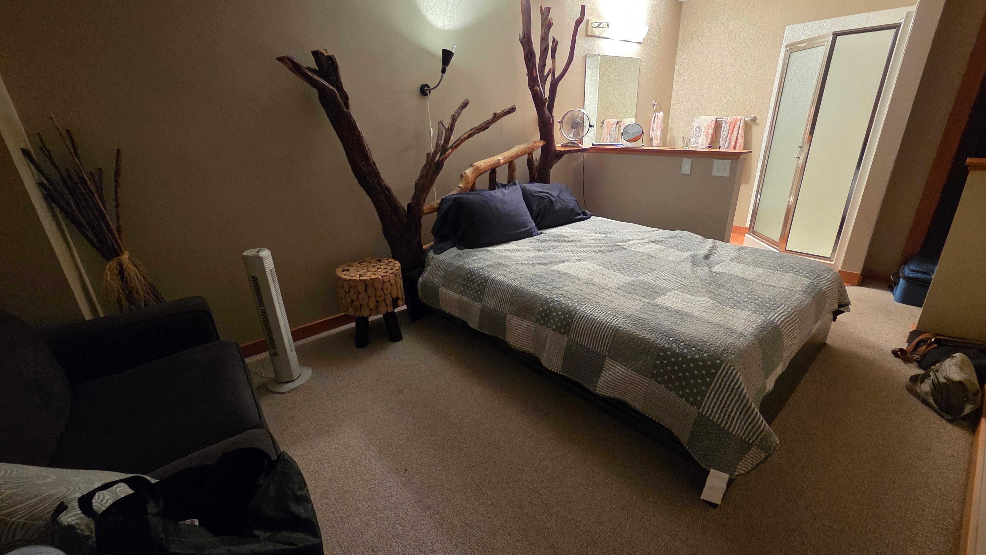 Main level bedroom: One queen bed, plus a twin spare mattress under bed. Sleeps 3 persons. There is a separate conventional full bathroom next door (North American-style bathtub with wall-mounted shower).