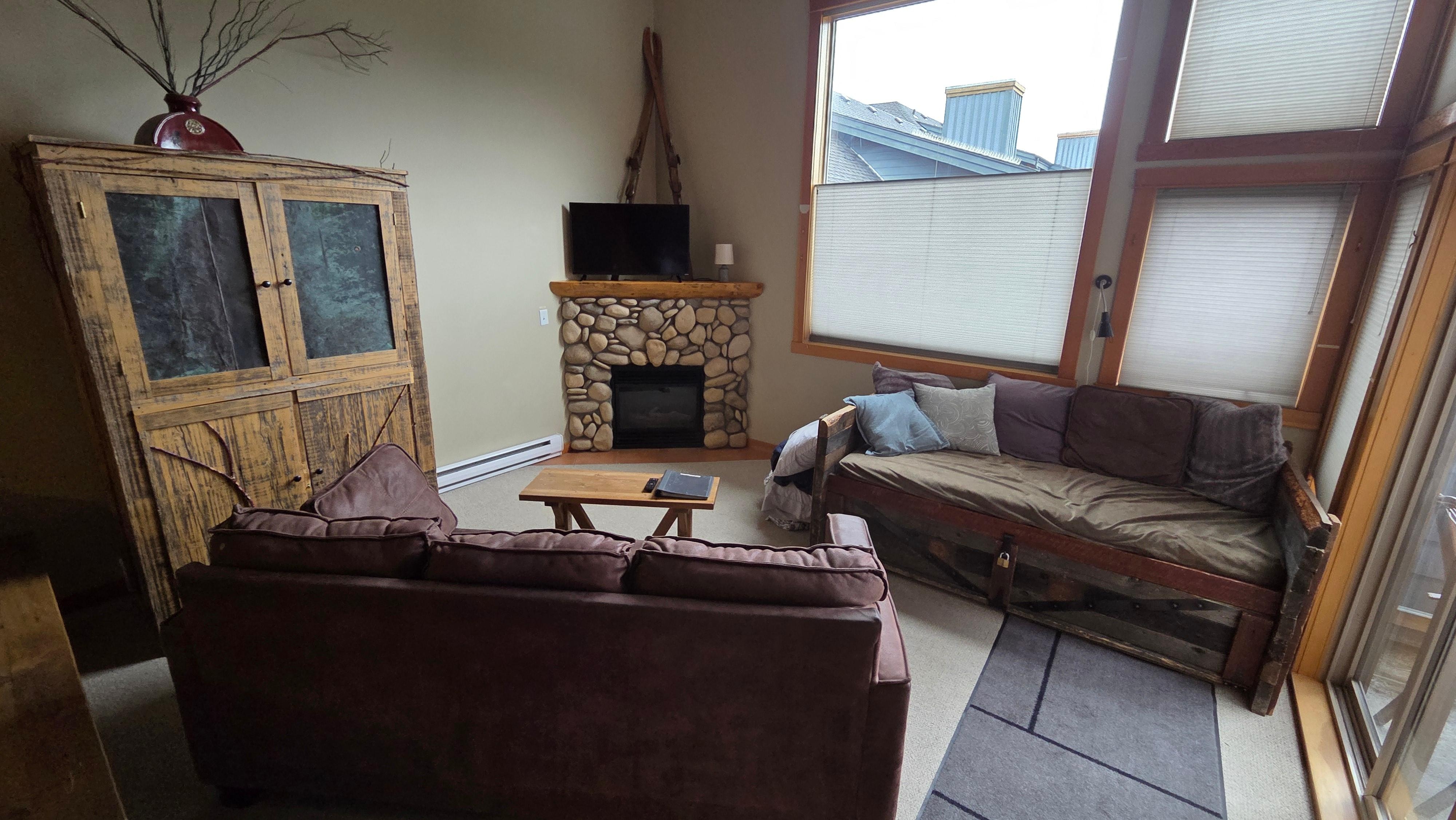 The loft features 23-foot vaulted ceilings, soaring 8-foot walls of glass flanking a cozy log/river stone fireplace & hi-speed wireless internet. Enjoy stunning views whether you are lounging in bed, relaxing on the sofa or window daybed, working out in the gym or soaking in the shared rooftop/indoor hot tub!