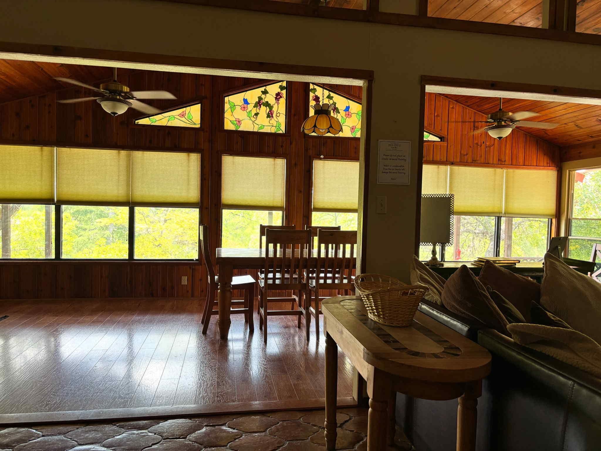 The main house living area has vaulted ceilings and an open floor plan. The spaciousness of the living area makes visiting with your family and friends easy. Prior guests have found the house to be very cozy and a great place to reconnect with family and friends. It consists of the main house, the attached bunk room, & a guest apartment. The house has steps & railing leading down to the river below. It accommodates up to 15 people; perfect for that family vacation you have been wanting to take.