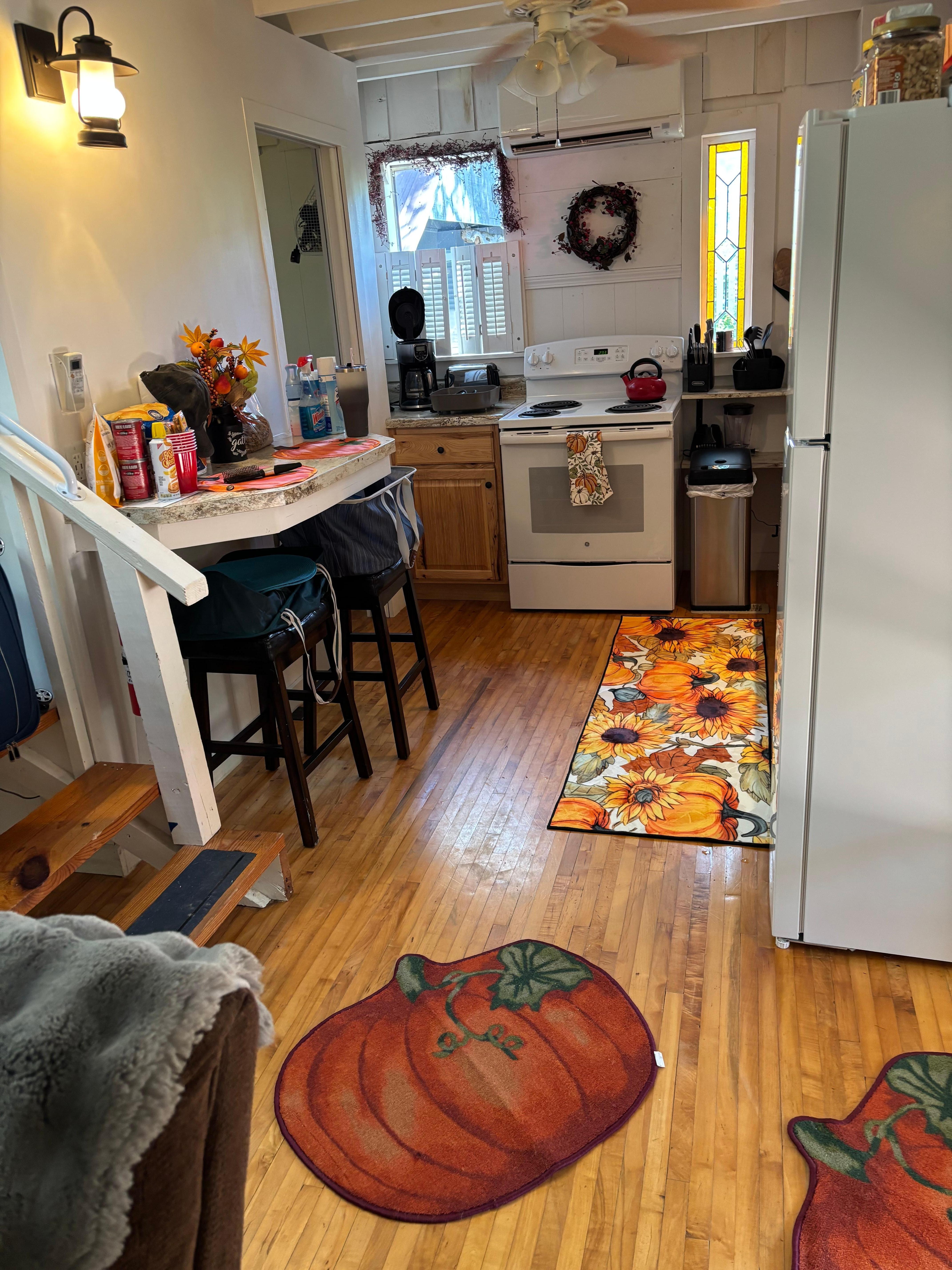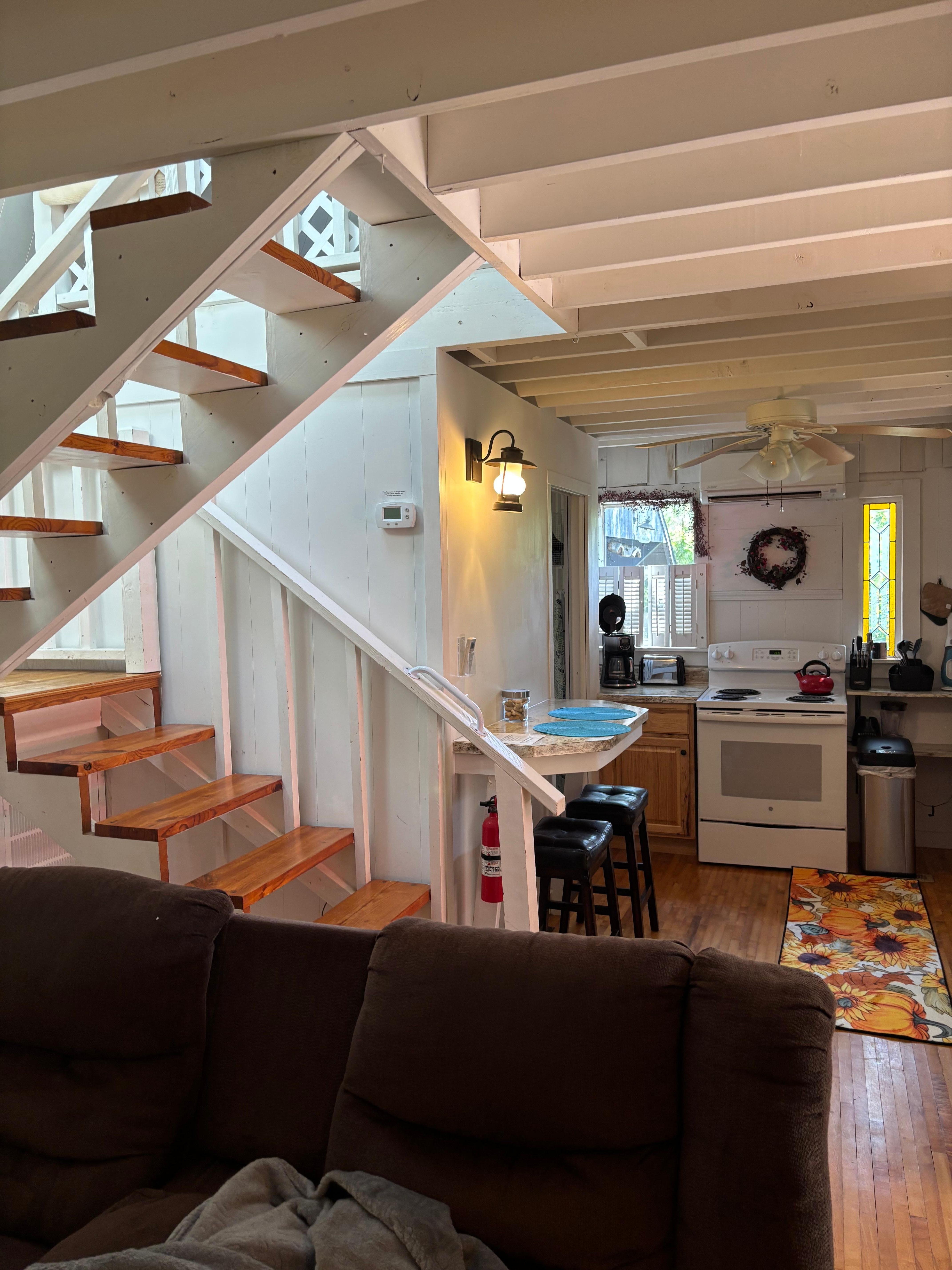 1st floor houses a comfortable couch with dual recliners, 42” TV/DVD set up with satellite channels, fully functioning fireplace, full country-style bath, full kitchen, a bistro-style eating area and a small bar area that doubles as a cozy place to eat if you prefer to dine in the kitchen. Internet access available. Kitchen is equipped with full size refrigerator and stove, wine glasses, coffee mugs, glassware, stoneware plates , mixing and serving bowls, pots and pans, microwave, blender, coffee maker, toaster, mixer, utensils, oven mitts and dish cloths. 2nd floor loft bedroom with queen size bed and separate reading / lounging area. Hardwood floors throughout. One set of linens provided for the bed and adequate towels for the bath. .