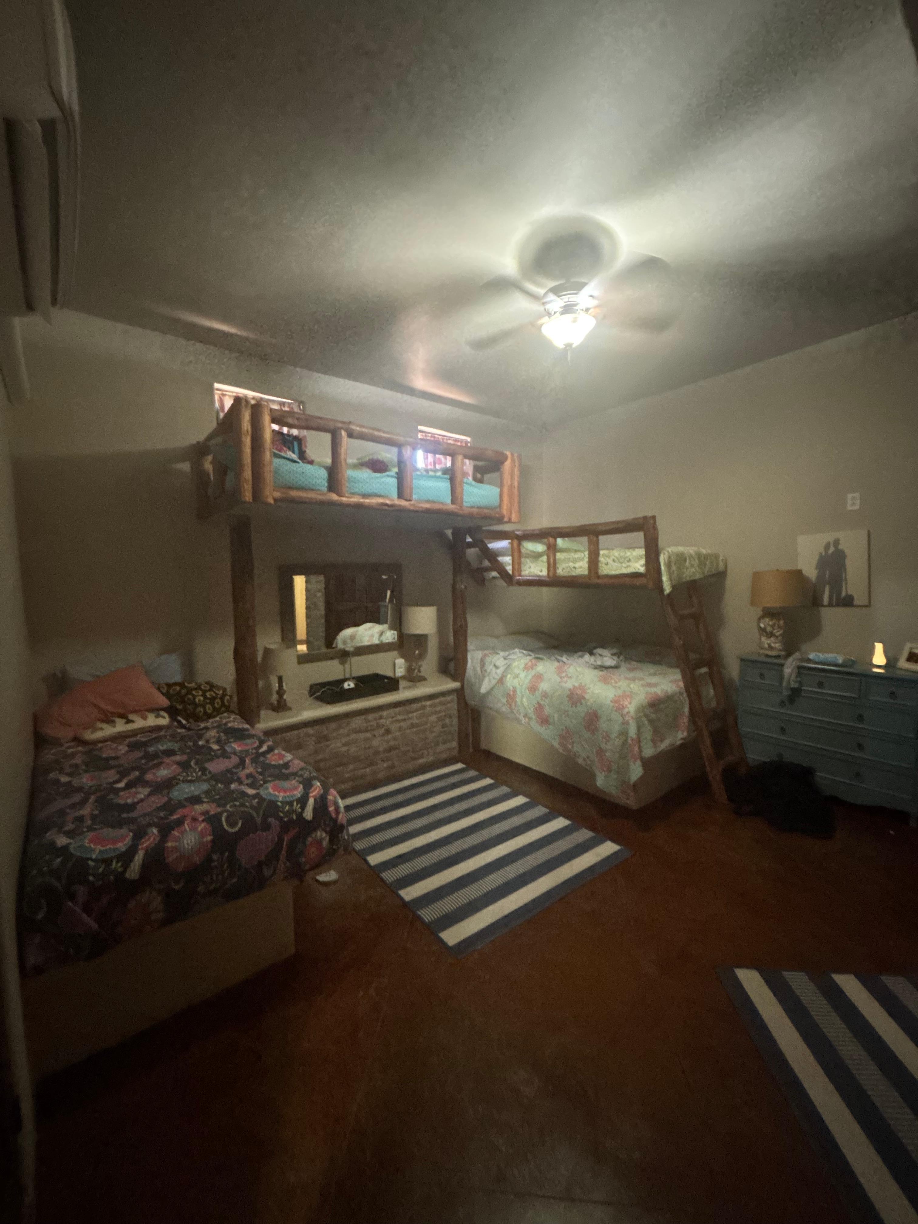 Bedrooms #3 and #4 are connected, share a bathroom, and are separated by only a privacy curtain. Bedroon #3 is a "bunk room" with a queen bed, twin bed, and two upper twin bunks. Bedroon #4, the "round room," is a sweet circular room with a comfy queen sized bed.
