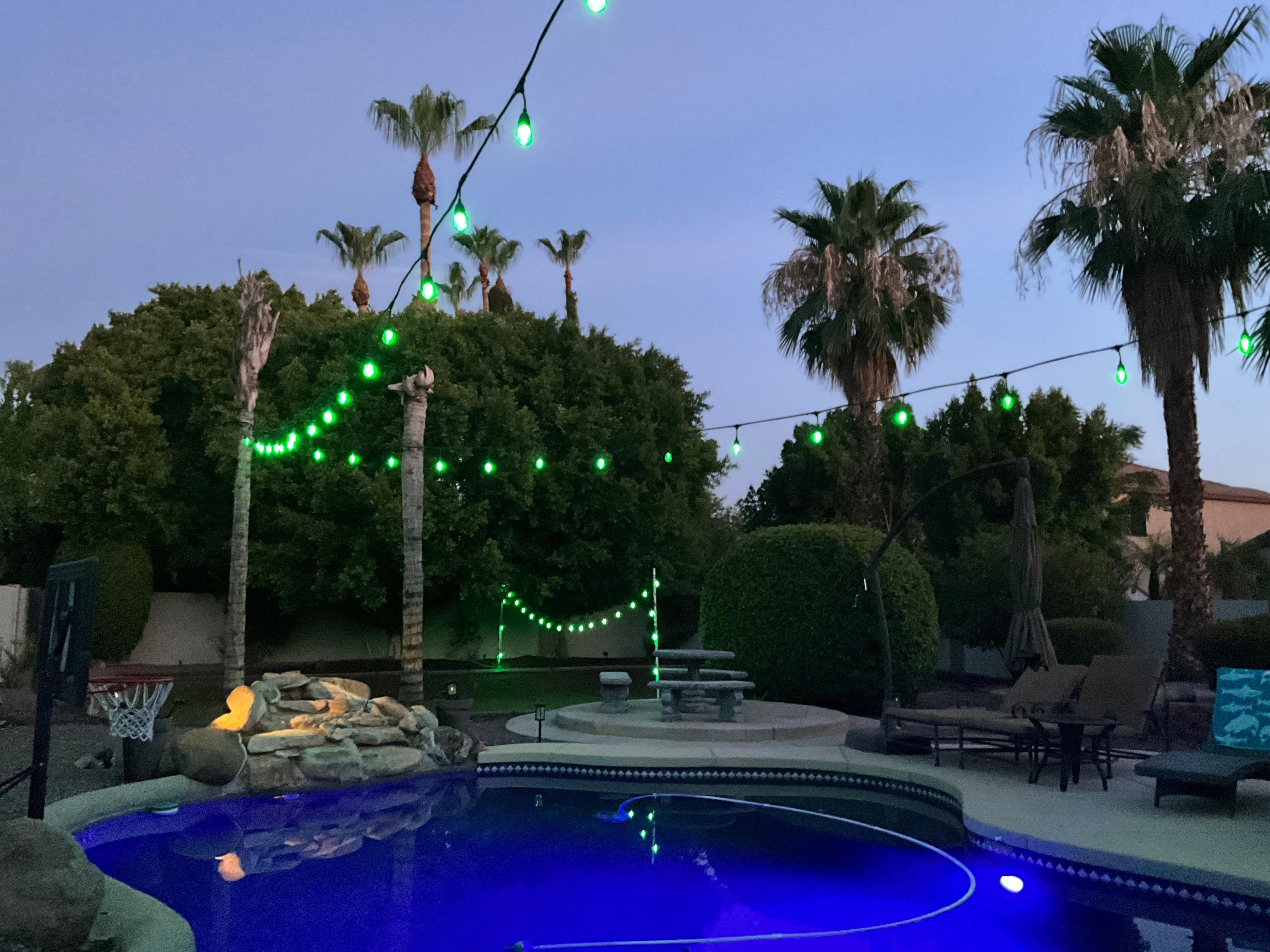 Vacation rental located on the border of Gilbert & Chandler. Close to major freeways and 25 minutes from the Phoenix Airport. This home has 4 bedrooms and 2.5 baths and will sleep at least 8. The backyard has a pool, outdoor firepit, bbq, a covered patio with a large seating area and a table with chairs. It also has a large grassy area towards the back of the yard. As well. The inside includes a washer/dryer, desk, fully loaded kitchen and a huge upstairs loft with a tv, and L-shaped couch and a slider that goes out to the balcony. The master bedroom is downstairs and has a slider that goes out to the backyard. The master also has a walk-in closet with a king tempurpedic adjustable bed. There are 3 other bedrooms that all have queen beds, 1 is adjustable and 1 is a pillow top. There is also Direct-tv Satellite, Netflix and wireless internet.
