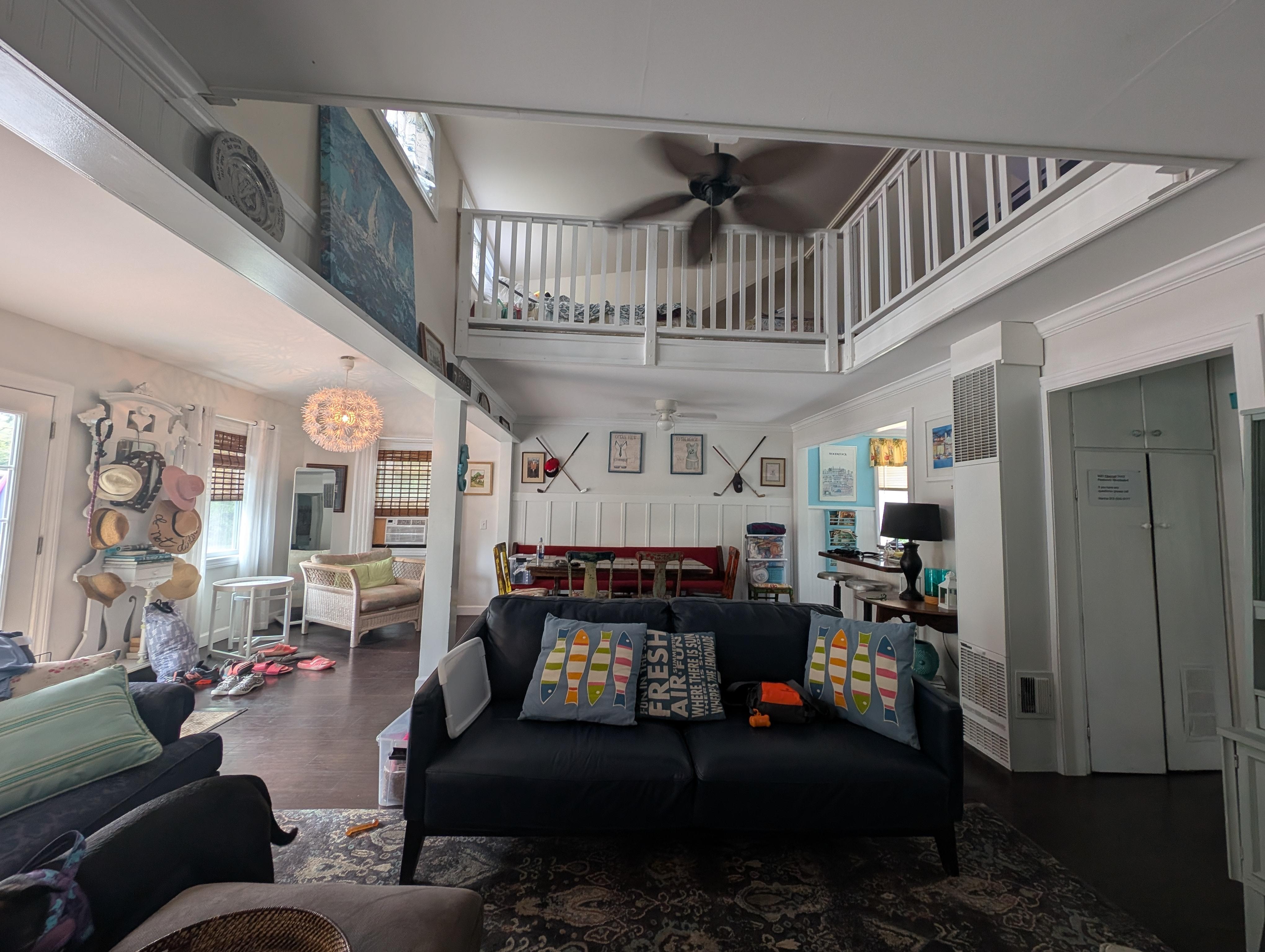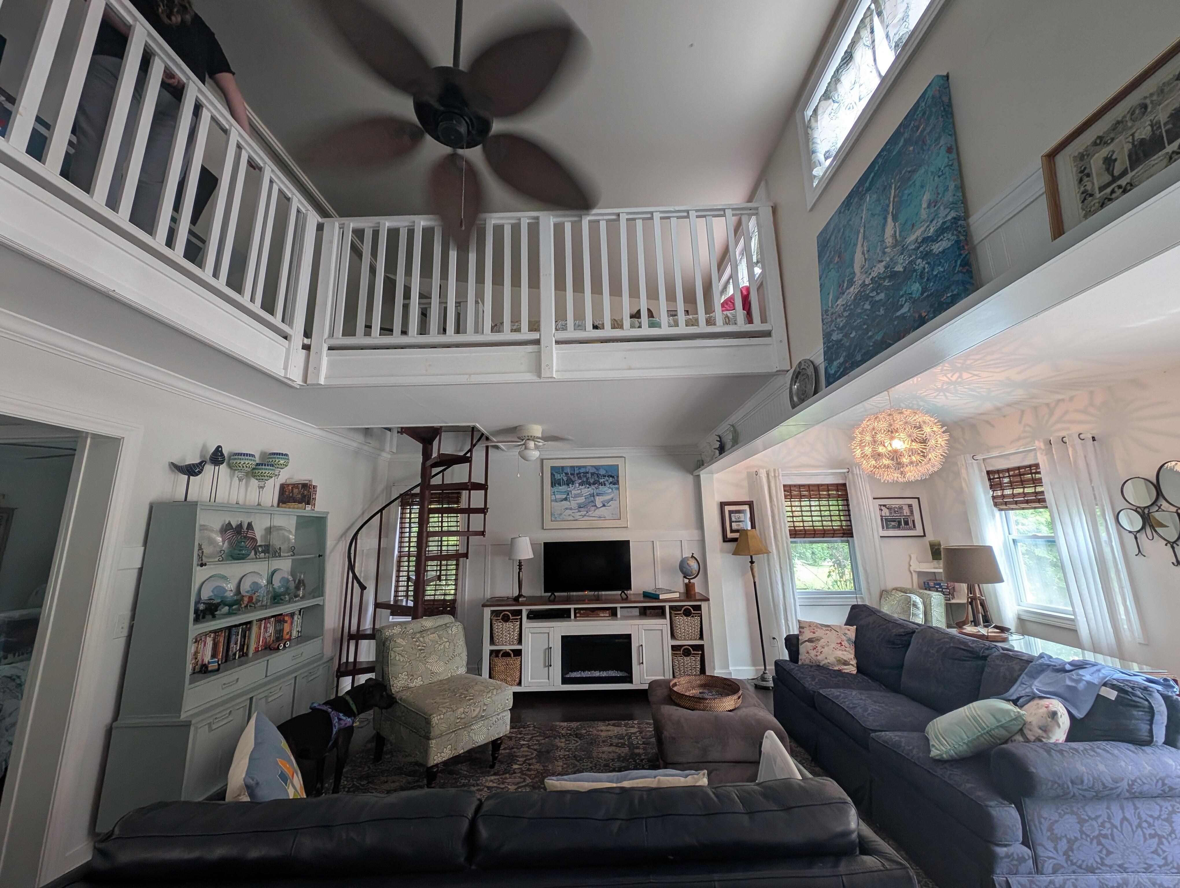 1st floor Full Bedroom and 1st floor bathroom with tiled shower. Spiral stairs lead to charming 2nd floor loft containing 4 single beds overlooking the entire 1st floor.