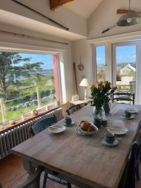 There is also a cosy snug with a huge heart warming stove to warm the cockles after a long walk across the beach and there is a gorgeous bathroom with a power shower. Additional facilities include a flat screen local TV, & DVD player. The stove, oil fired central heating and high performance double-glazed windows ensure a cosy, comfy living environment no matter what the weather is doing outside. The dining area with a large dining table accommodates 8-10 people.