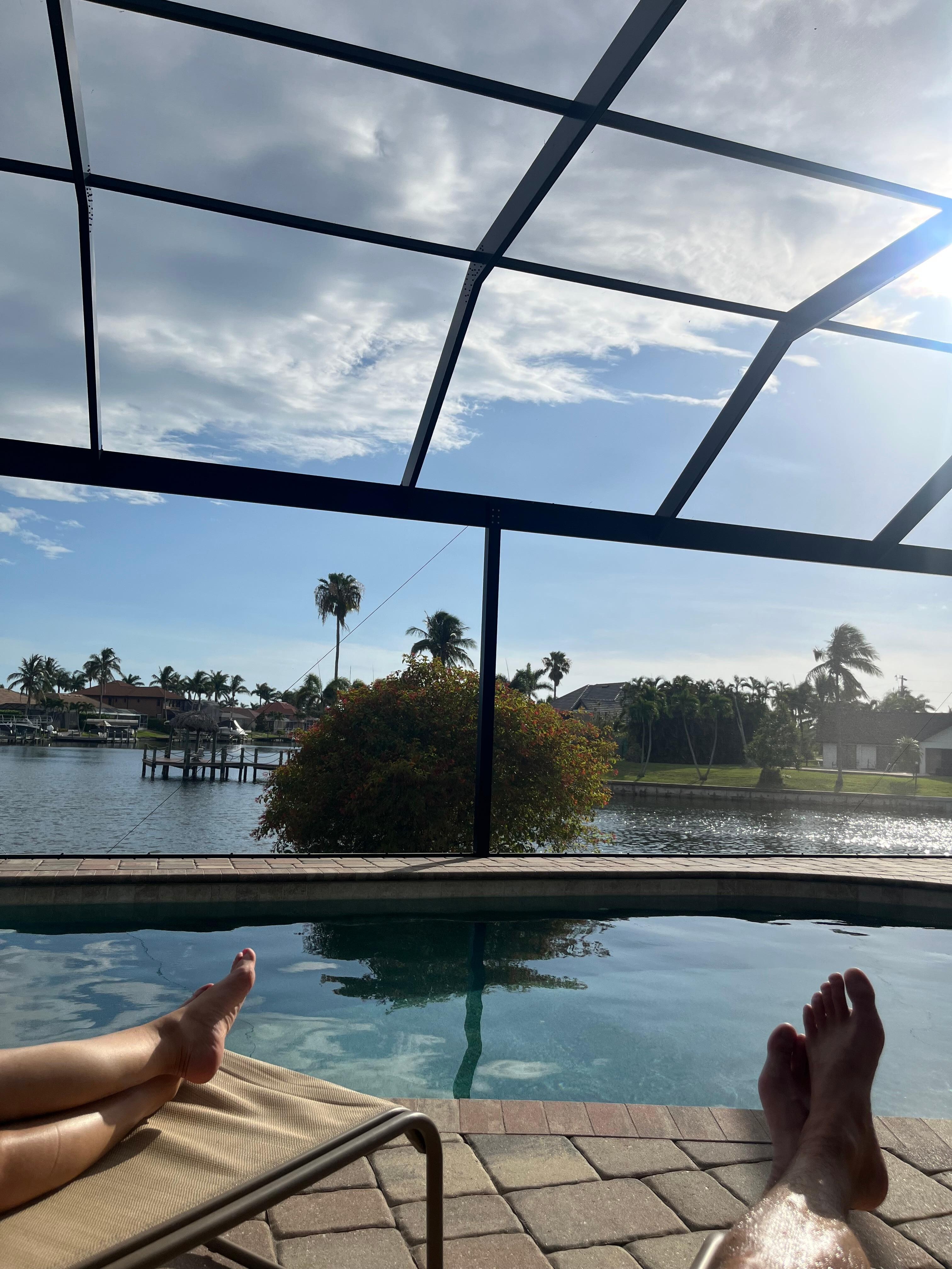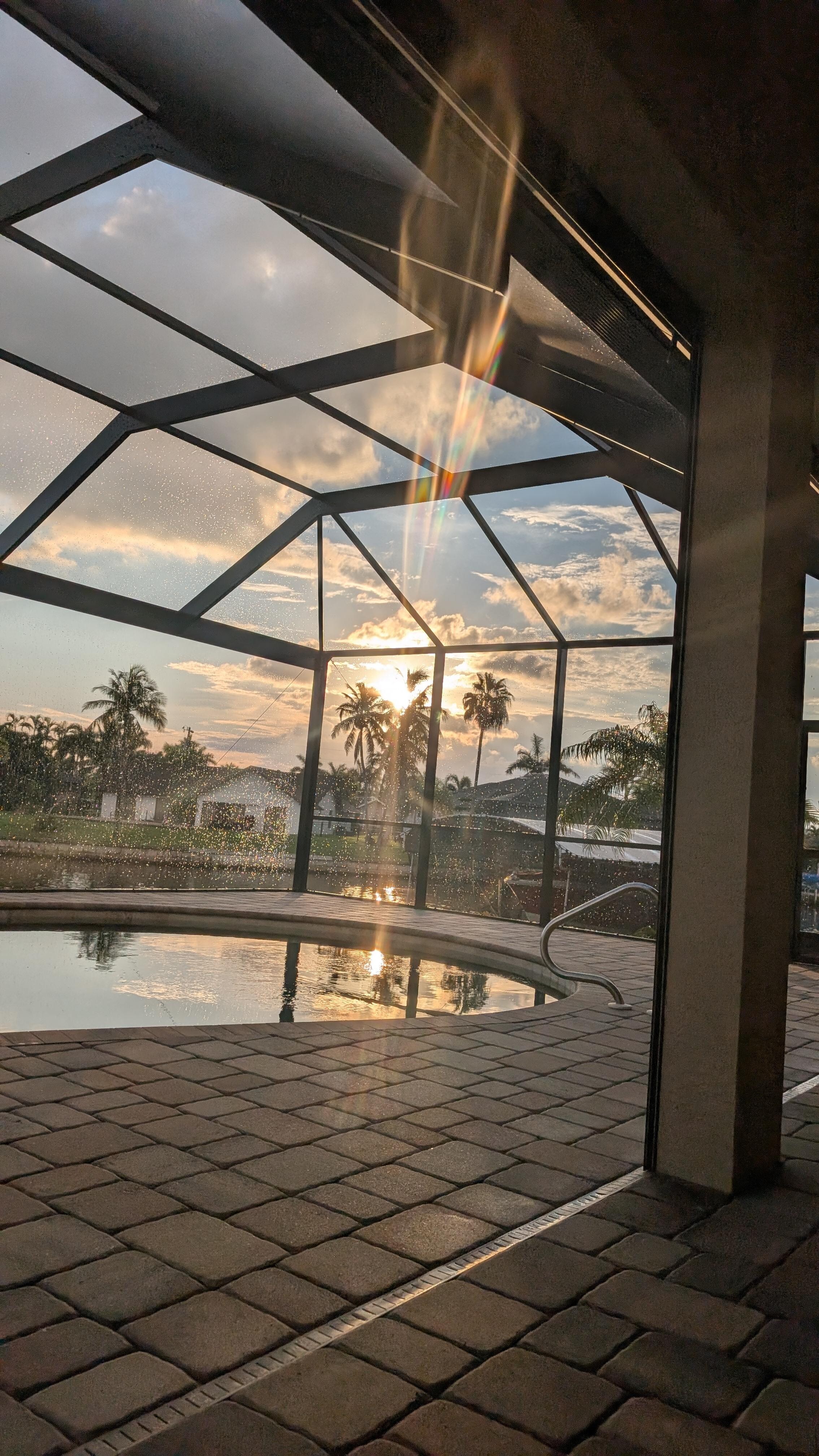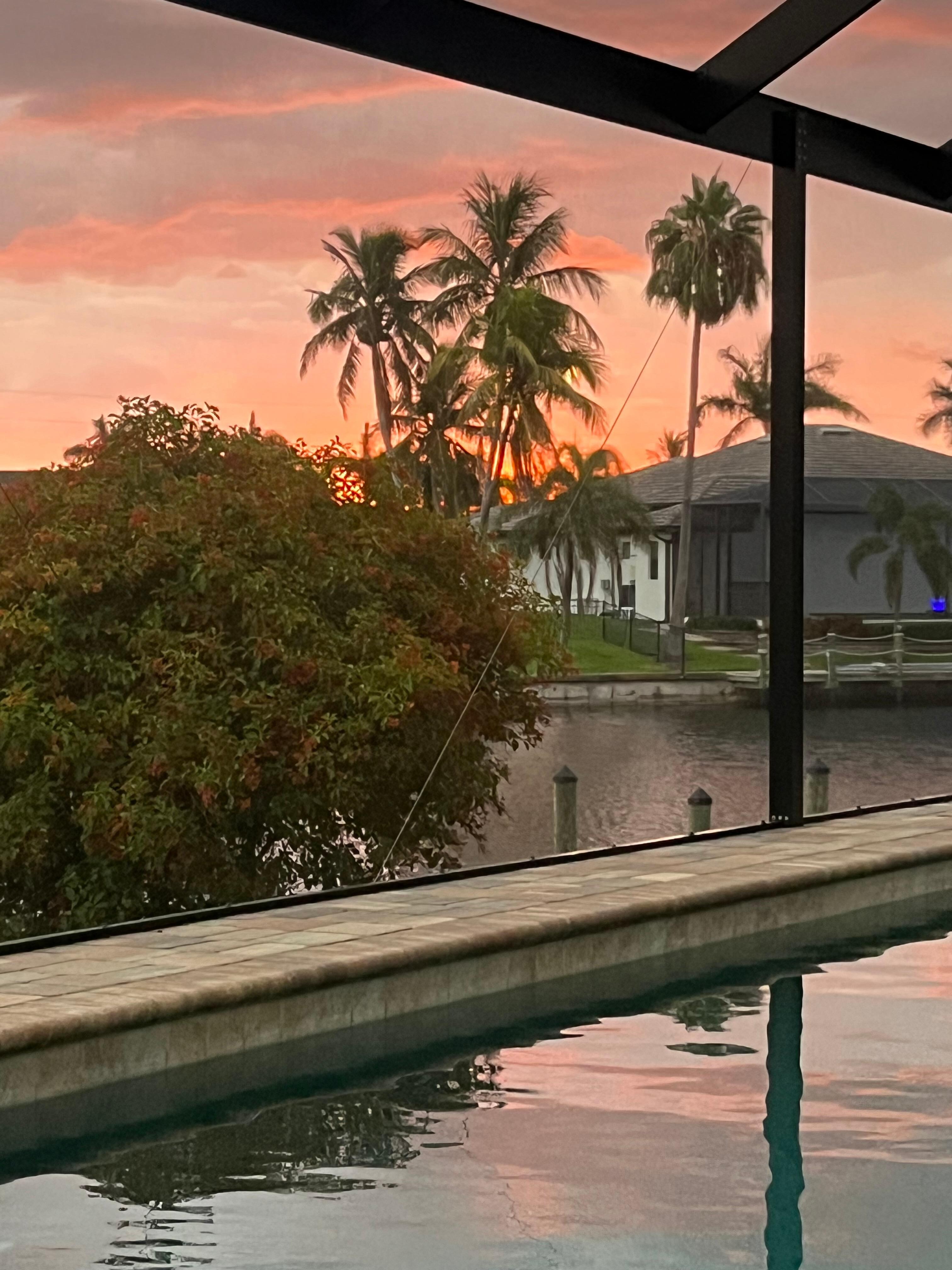 Please see the aerial video to appreciate the wonderful location of this home on a point of land where two wide canals intersect. You will feel like you have escaped to an island paradise surrounded by water as you enjoy the privacy of the expansive lanai and screened area (2100 sq ft/200 sq m) for casual dining, swimming and relaxing. The spectacular 40 foot salt water pool (12 m) with a sturdy handrail at the stairs and a beautiful view of the wide water on three sides of the home will refresh you while swimming a few lengths, playing in the water or just sitting and enjoying your favorite beverage. The outdoor under roof (lanai) itself is a large 655 sq ft (61 sq m) but more importantly, it is 24 ft deep (7 m) providing lots of protection from the sun. In addition, the see through outdoor power blinds can be lowered as needed to provide extra sun protection but not block your view. The comfortable custom patio furnishings will enhance your enjoyment whether dining or just lounging. Because of the wide panoramic view, we often see Osprey, Bald Eagles, Egrets, Little green herons, Ibis, Red Tailed Hawks, Shrikes and cardinals. Burrowing owls live at the end of the street during season. There are mullet jumping high out of the water and we sometimes see Manatee and Jackfish.. The mangroves fringing Cape Coral are only one major block away making them easily accessible with our canoe.. Gentle breezes come in off the Gulf of Mexico most days. The bedroom has a few extra features for romance. We also have two new bike with helmets and lots of bike lanes in the area. One guest even biked to the beach, 7 miles away. The new Sands Park, five minutes away boasts four pickleball courts, 2 tennis courts, a basketball court, bean back toss and a paved walking path. It is easily and safely reached by bike. You will quickly realize that this home is well above the standards set by most rental homes in Cape Coral. The half acre lot (750 sq meters) boasts 207 ft of shoreline (82 meters) with two docks that don't block your view and a large lawn at the back. In total the home has 6000 sq ft of enclosed space (550 sq m) including a two car spaces in the three car garage reserved for guests. The interior of the home under air is 3000 sq ft home (280 sq m). It is located In a quiet neighborhood in the highly desirable South West area of Cape Coral on two wide Gulf Access canals. The canal to the south is three times wider than most Cape Coral canals. The general area is well established with modern homes. The home has an open floor plan with the master bedroom separate from the guest wing. The guest wing includes second large bedroom with a king size bed and a games room with a new queen sized pull out couch. A Jack and Jill bathroom is accessible to both. There is a $14 per day charge for each guest above two. There is also a 18 cent per KWH charge for usage above 40 KWH per day.