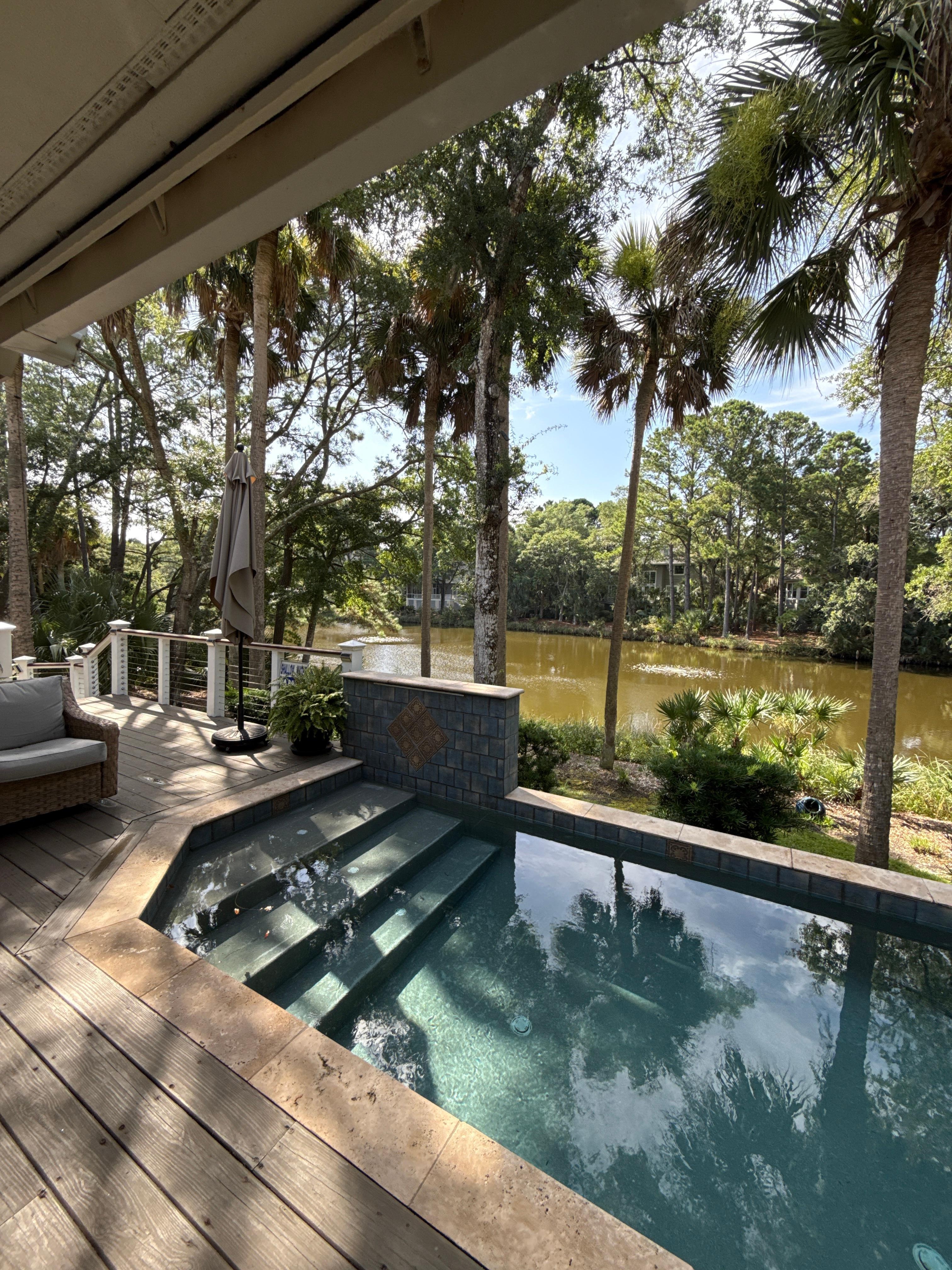 The Beach is just an 8 minute bike ride away or drive to designated beach parking in just a minute or two. Access to 5 Resort Golf Courses and tennis. This gorgeous home is situated on a beautiful natural lot that is embraced by a serene lagoon and mature oaks, magnolia, cedar, and palm trees. Out back, the deck and in-deck saltwater pool enjoy unobstructed lagoon views and self-cleaning, the pool can be enjoyed nine months out of the year. RBL-19-006918, Driveway parking is available for 4 Cars