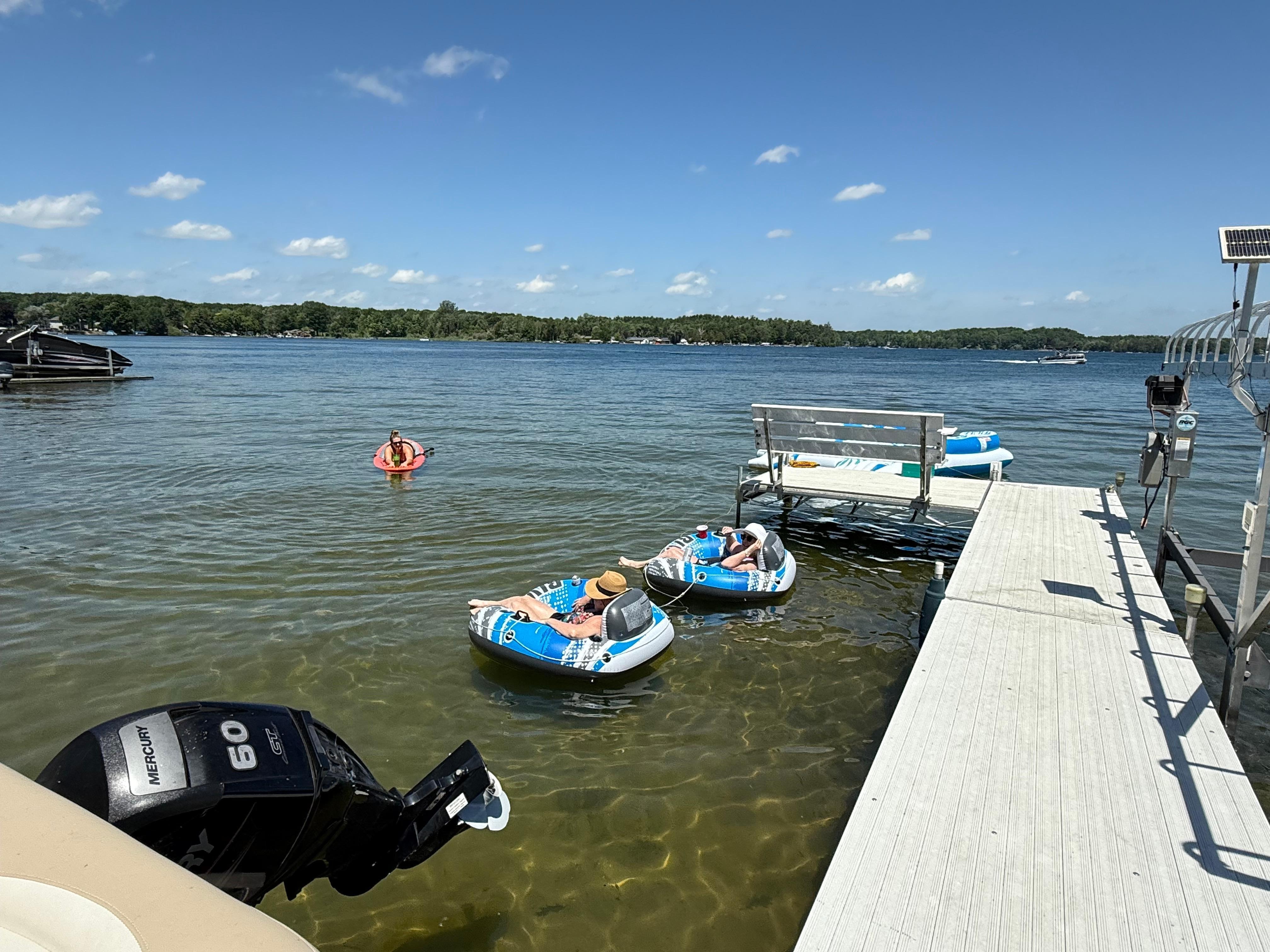 Outside you will find a deck that is accessed through patio doors from the living room. There is a picnic table for meals on the deck and a fire pit in the yard. Wood is provided for guests to use. The lot offers gradual, sandy frontage with a 100' long aluminum dock that offers easy access for boats. Two paddle boards and a pedal boat are available for use, however, you will need to bring your own life jackets for water recreation. We also have a 20' pontoon that guests can rent out. We will need to know prior to your stay if you are interested in renting the pontoon. Life jackets are provided with the pontoon rental.