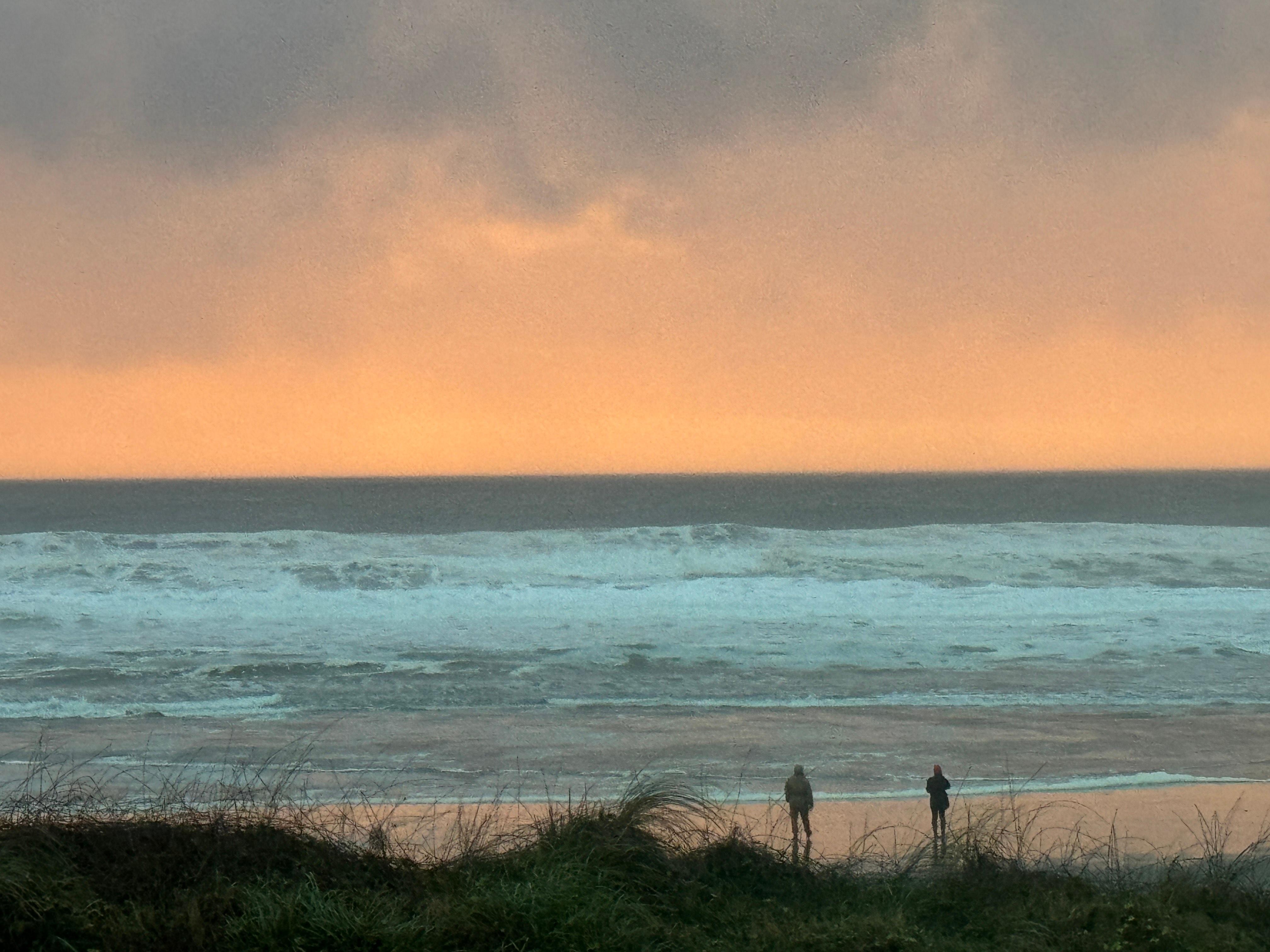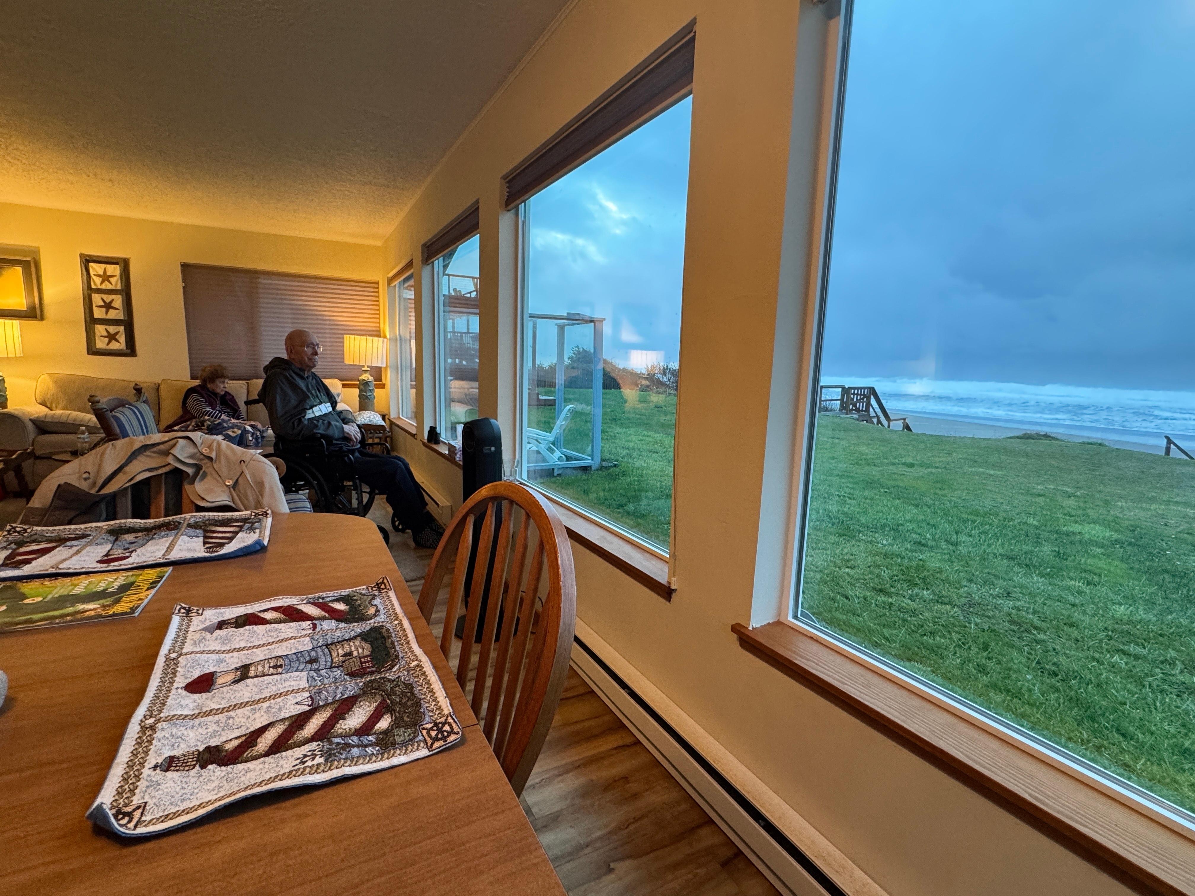 Ocean front one story, three bedrooms, one bath, full kitchen, dishwasher, clothes washer & dryer, family room with television and cable TV, dining area, wireless internet access, mobile phone booster. 180 degree view of the Pacific Ocean and beautiful Roads End beach. Large backyard has a tanning/sitting patio with windbreak. Fifteen steps to the beach via private access stairs. Parking for three cars (one which is covered).