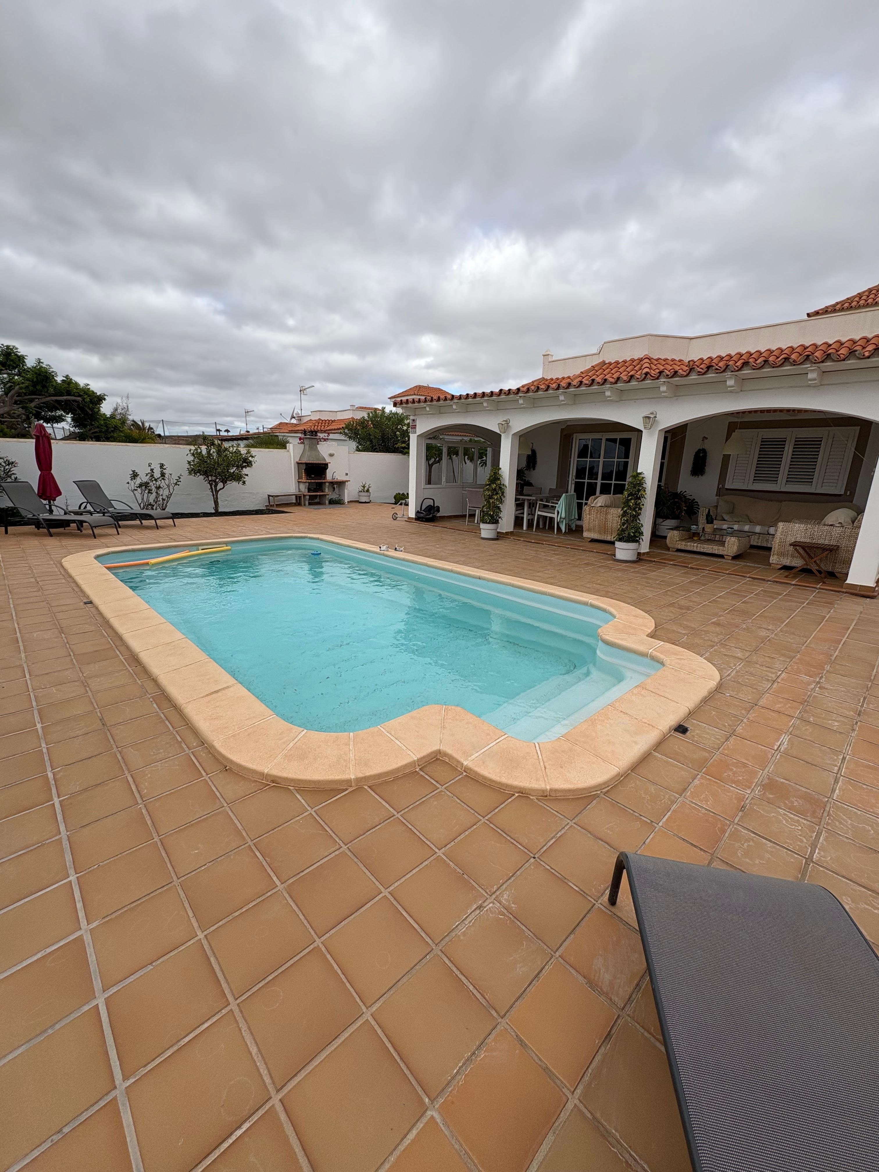 Impressive and exclusive independent villa, located on the first line of the golf course. It has 600m2 plot, where you can find a pool, a barbecue area to enjoy during your stay, as well as a relaxation area that has hammocks and a table to take advantage of the spectacular days offered by Caleta de Fuste .