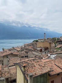 Being on a raised, village edge position the Olive House's views are, on the one side over the clay tiled rooftops of the village to the magnificent Lake Garda below, and on the other side, looking over the olive groves of the garden to the grand backdrop of the mountains of Mt Pizocolo and Monte Castello behind.