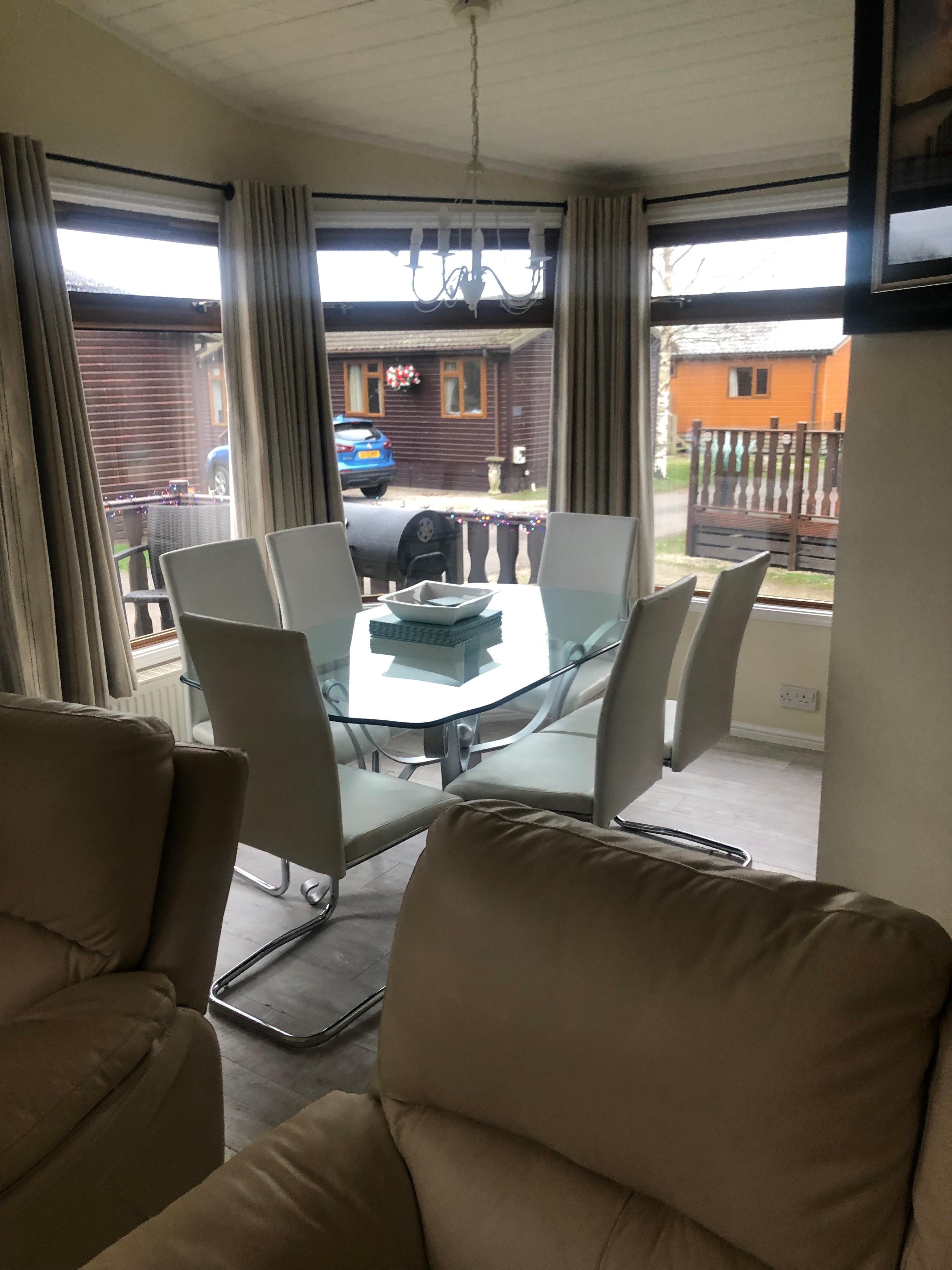 The open plan Lounge/Dininig area has 2 cream leather sofas and a cream leather armchair, a living flame electric fire, smart HDTV and WIFI connection.