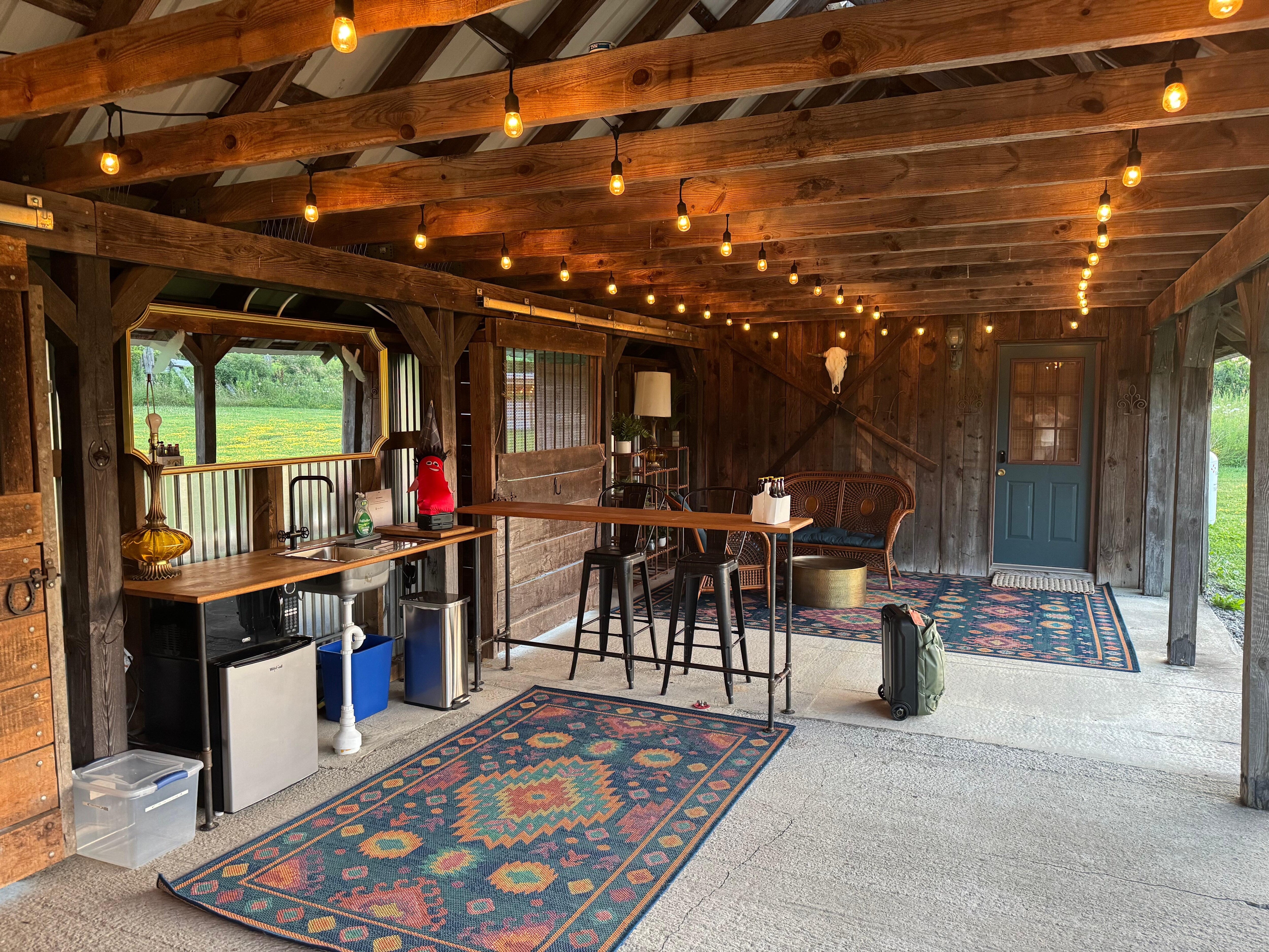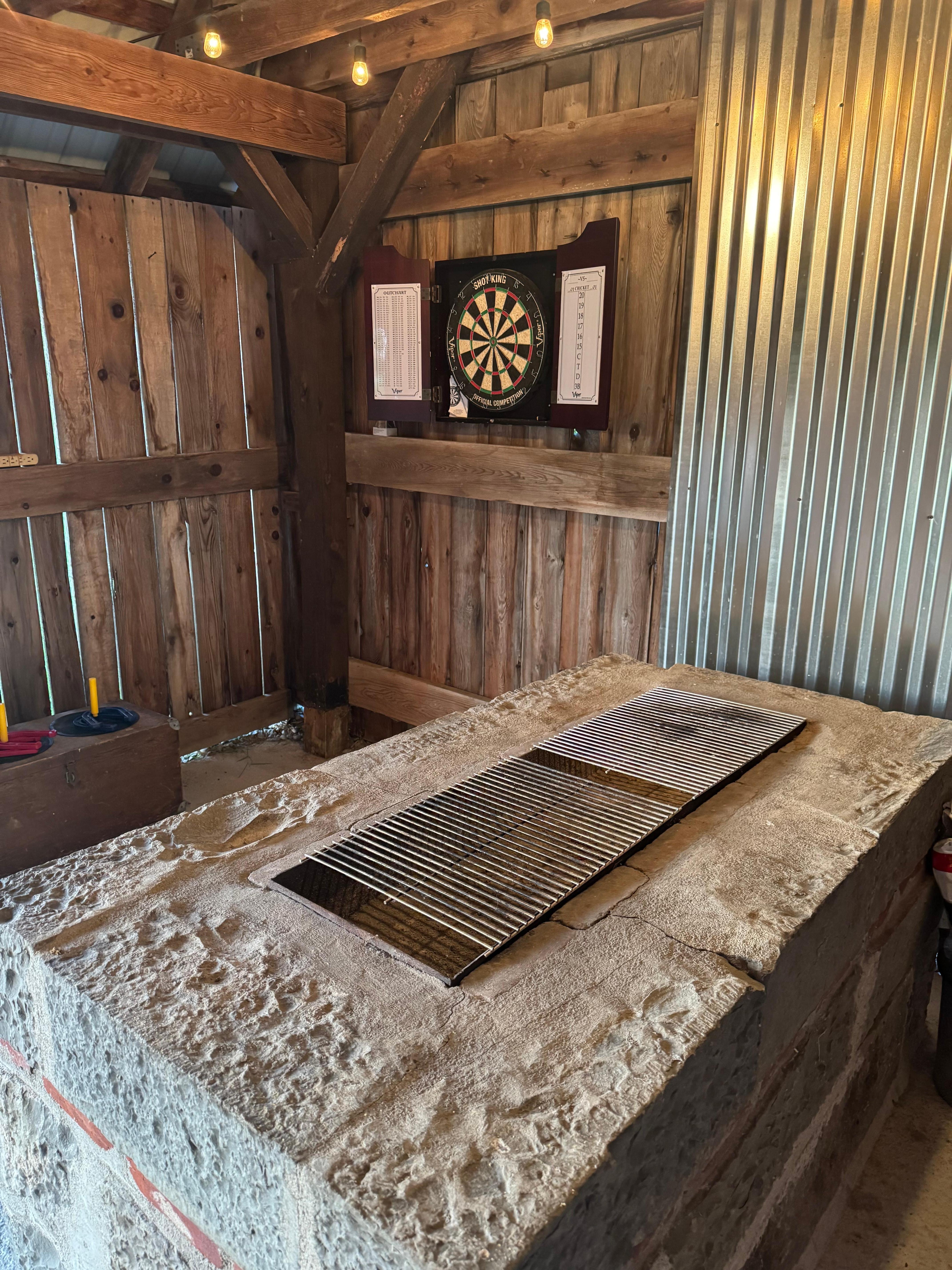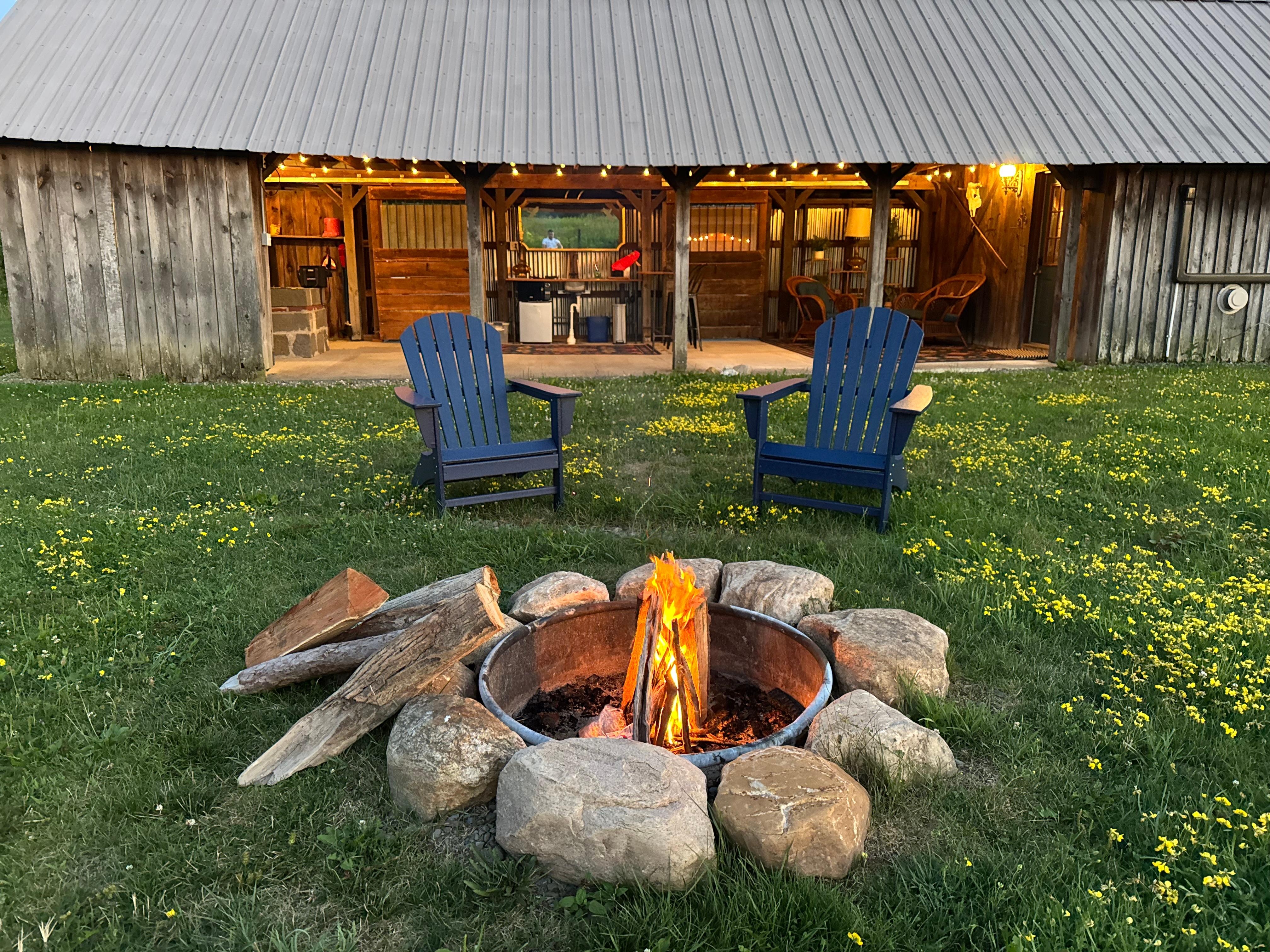 * Outdoor Living Area: Love seat & arm chair facing the open meadow, kitchenette, bbq pit and dart board all covered and protected from weather