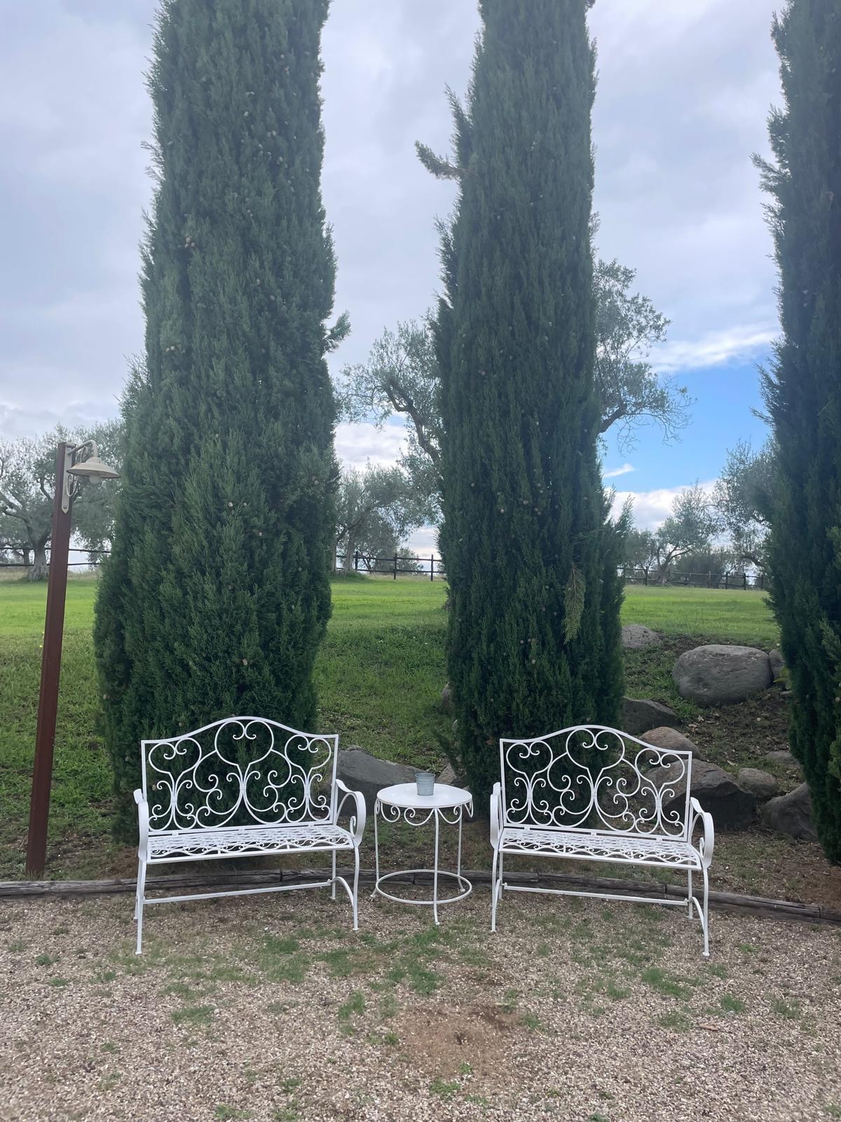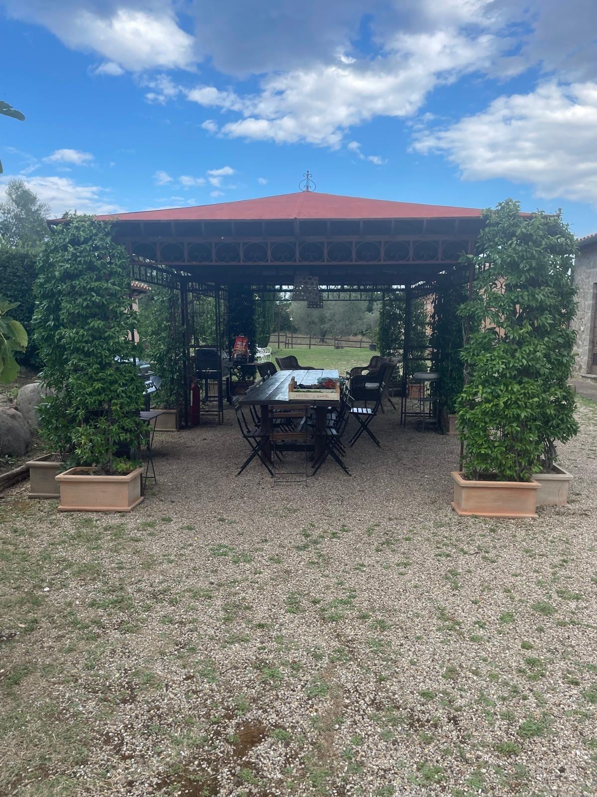 the ceilings retain exposed beams and chestnut trusses. All around large green areas with olive and fruit trees, as well as cypresses and other lush plants that decorate gazebos and pergolas.