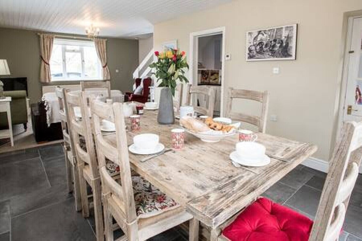 The kitchen is finished in a true country-cottage fashion, continuing the slate floor from the dining area, and fully equipped cupboards with all you need for a short break.