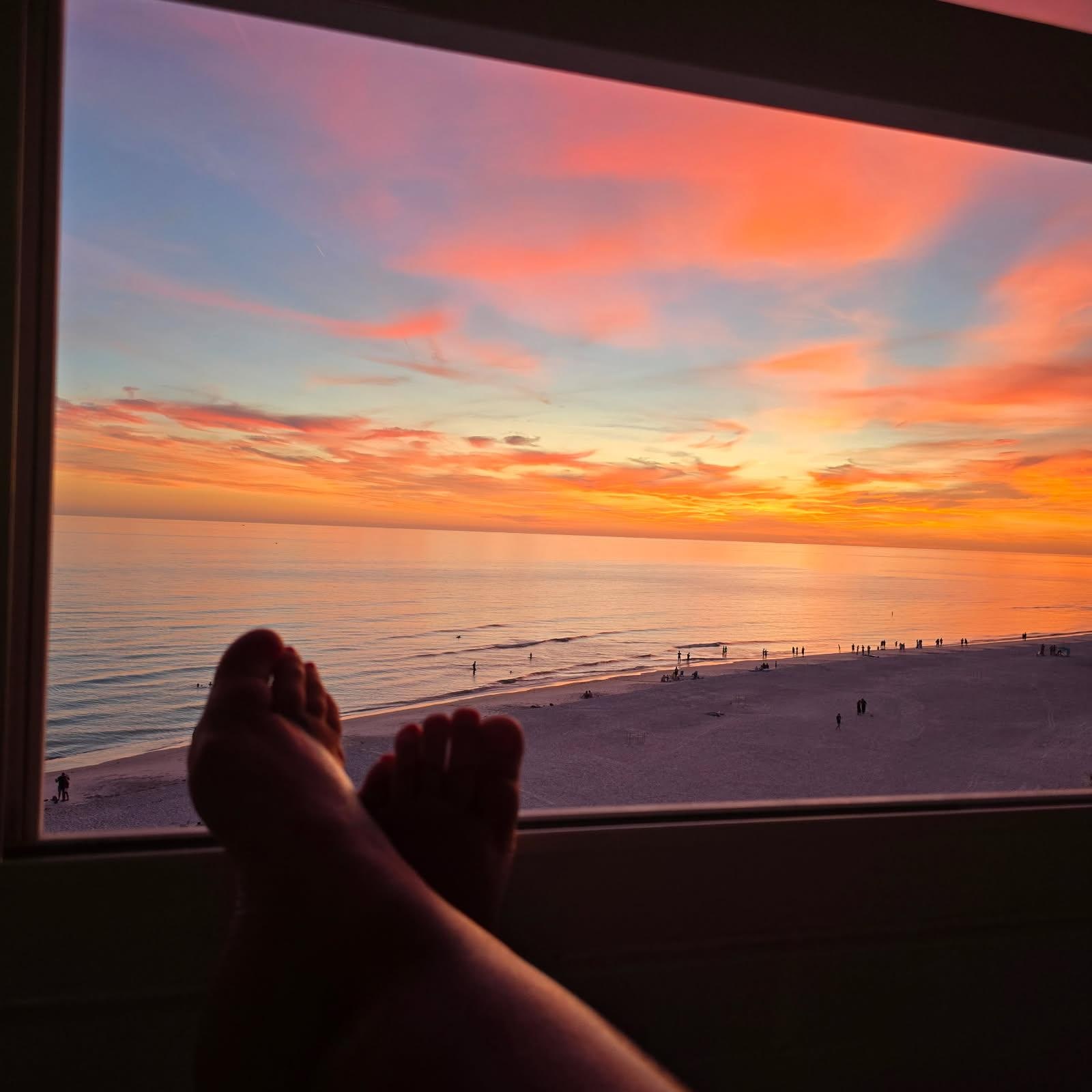 Florida Vacation Dream Spot - easy and fun! This 2 Bedroom, 2 Bath condo is direct beachfront with wide open views up and down the coast. The condo is on the top floor (6th) of the building and is completely furnished with a dining table that seats 6 – 8, sofa and loveseat, coffee and end tables, flat screen tv, and table and chairs on the enclosed balcony that is a perfect spot for watching the beach, ocean, and fantastic sunsets. You can even see dolphins swimming in by! The master bedroom is an enclosed suite with a large walk in closet, private bath, dresser, night stands and king size bed. The second bedroom also has an adjoining bath, queen bed ,closet, dresser, nightstands and two twin beds. The kitchen is fully equipped with quality cabinetry, corian countertops, Stainless fridge, stove microwave and dishwasher. The unit comes with a covered parking space and storage unit equipped with all the beach. Free wifi.