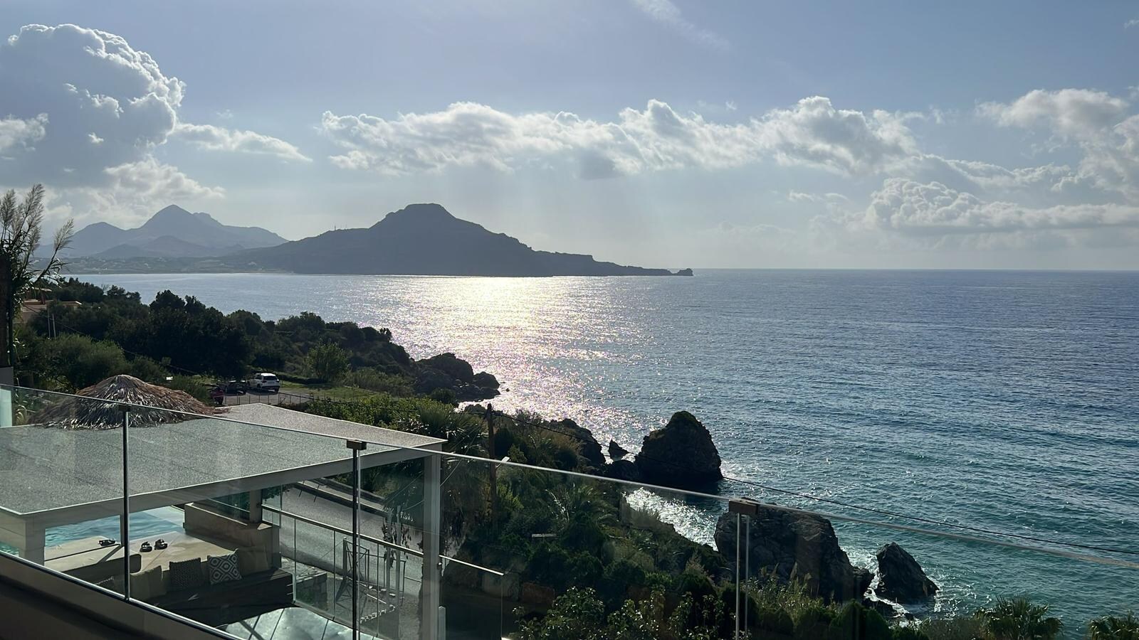 Perched on a hill, the villas interior uncoils to an open living space with sea vistas all around. The open plan area consists of the fully equipped kitchen with a height dining table and high bar style chairs, the living room and the dining area. The modern and fully equipped kitchen provides all essentials for a self catered vacation. The living room offers a large corner sofa, a 45 HDTV, Playstation 4, bluetooth speaker, a wine cooler and large glass doors that open to a balcony with a sitting area overlooking the sea. Next to the living room is the dining area seating 12 guests with floor-to-ceiling windows which bring in sea views. This floor offers a WC and the villa has central air-conditioning throughout and in areas.