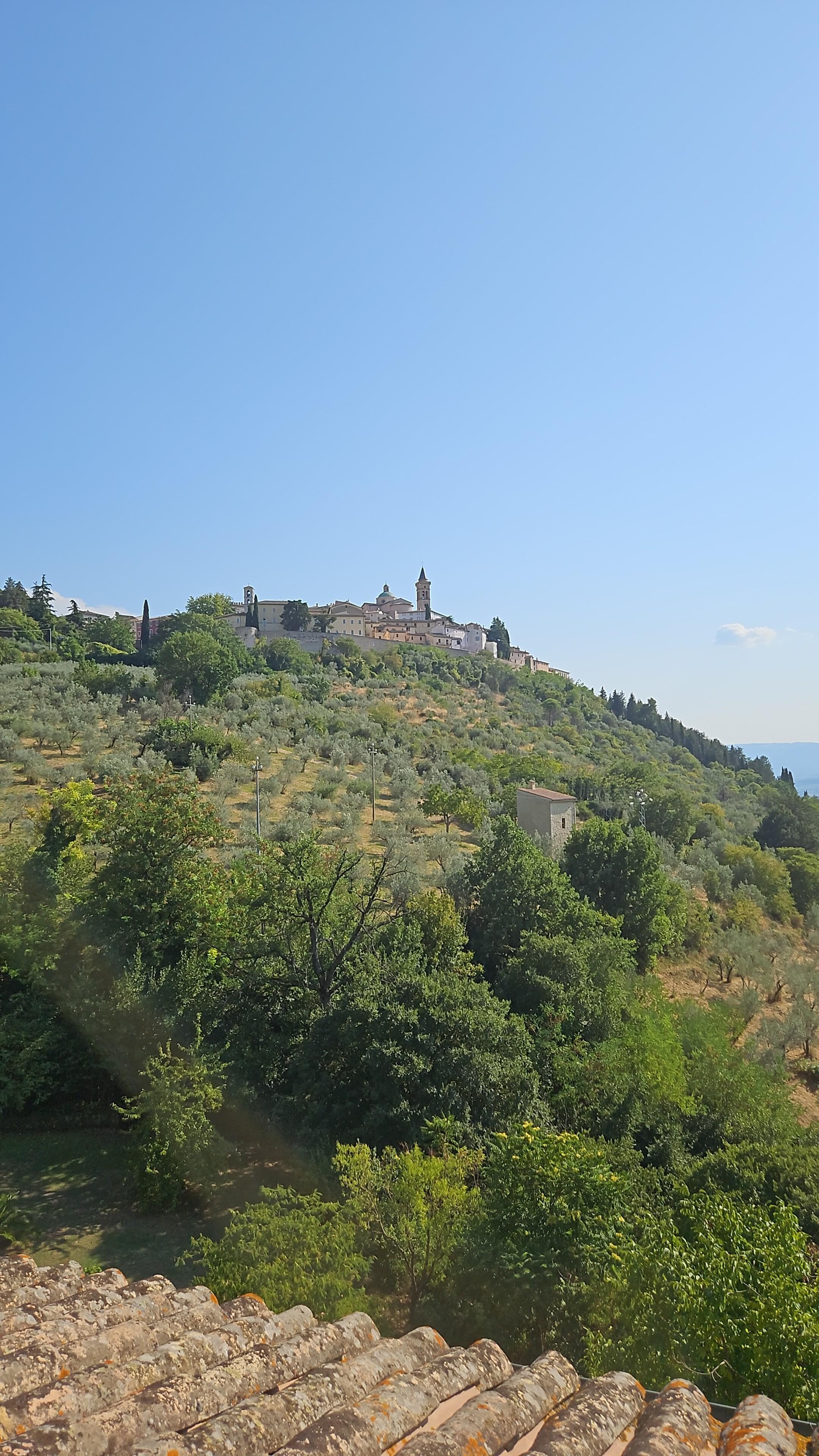 A third apartment is occupied by the owner. The Villa is situated in a superb position with magnificent views across the Vale of Umbria to the Martani Mountains and to the nearby town of Trevi, which can be reached by foot in only ten minutes. Trevi has an unspoilt charm and offers several very good restaurants, a pizzeria, bars and shops. The beautifully restored Villa lies in a semi-fortified estate just outside the city walls. Below the house is the secluded garden which has a large salt water swimming pool (12m x 6m). Il Tramonto has a large double bedroom which leads directly onto a private terrace with wonderful views across the surrounding countryside and towards Trevi. There is a second bedroom with two single beds which can be combined. The apartment has a bathroom with shower and small bath tub and a new kitchen/dining room with induction hob and oven. The apartment is spacious, light and comfortably furnished. There are mosquito nets on all windows.