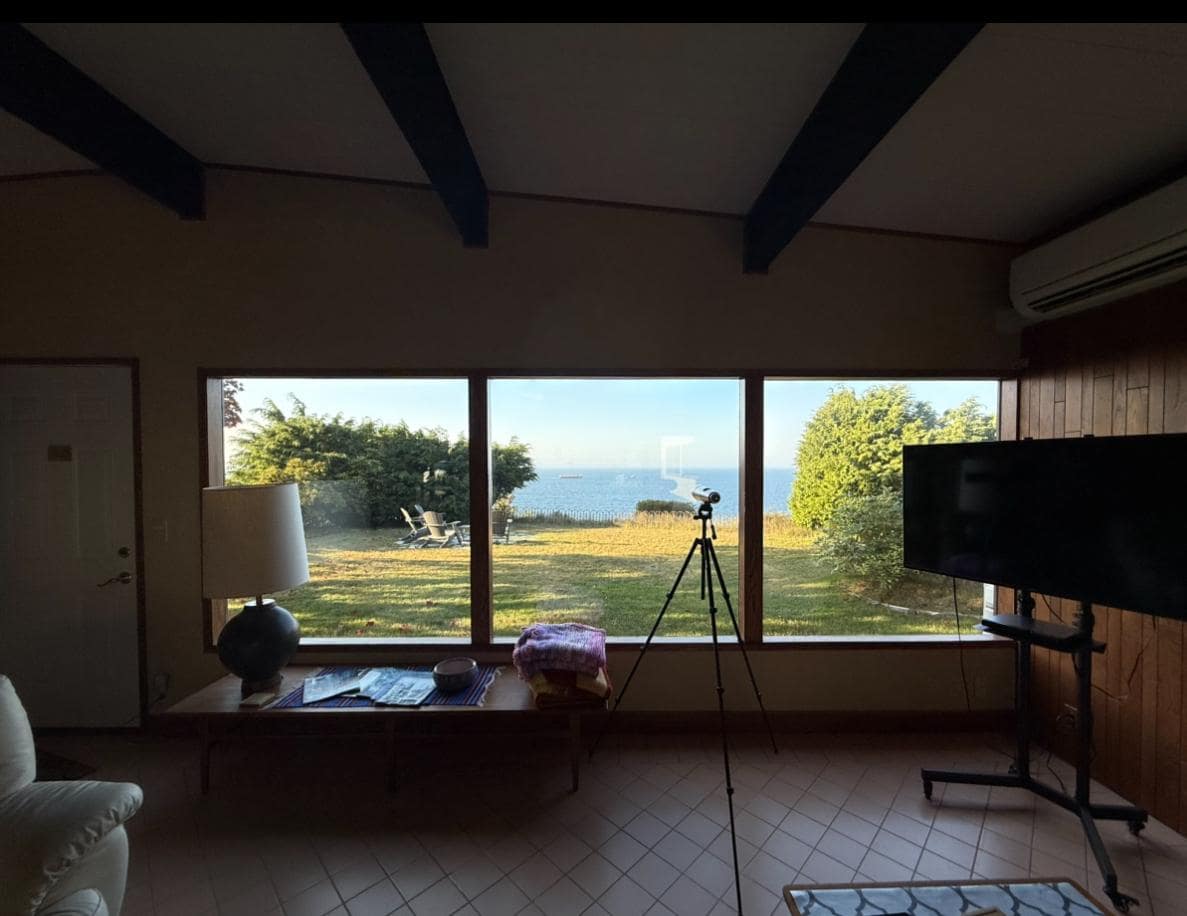 This renovated mid-century home located on a bluff directly above the the Strait of Juan de Fuca facing north to Victoria.The home has original teak furniture from the 1960's even a pink bathroom! Enjoy watching cruise ships, freighters, and the lights of Victoria from the living room, master bedroom , kitchen and dining room. Sit outside and watch an eagle catch it's dinner or activity at the Coast Guard Station. Enjoy the 3 acres of meadow and forrest with ample room to park a boat or trailer. This 3 bedroom home has a fully equipped kitchen, large living room and propane fireplace. Two bedrooms have queen sized beds and one bedroom with a single bed.