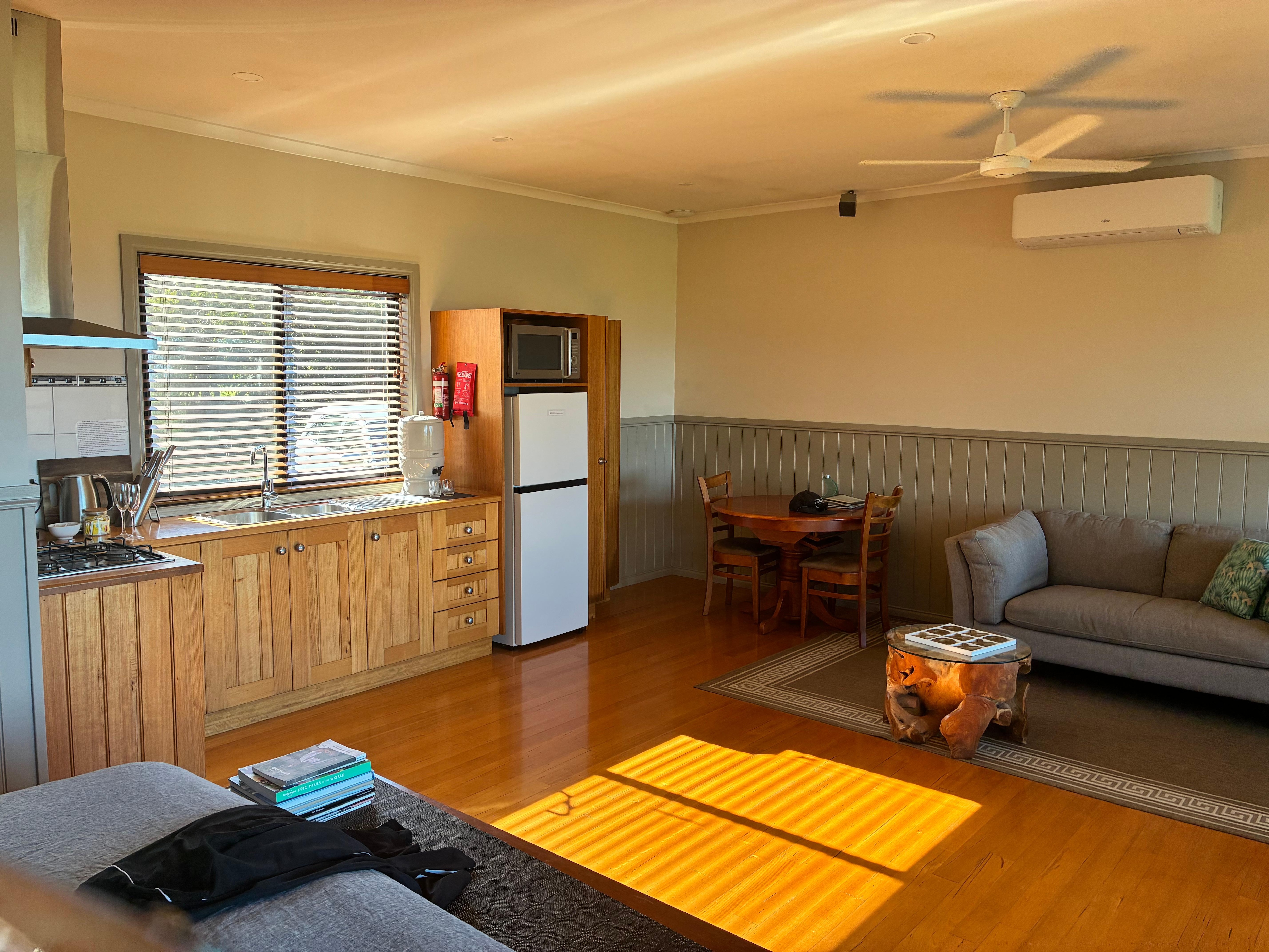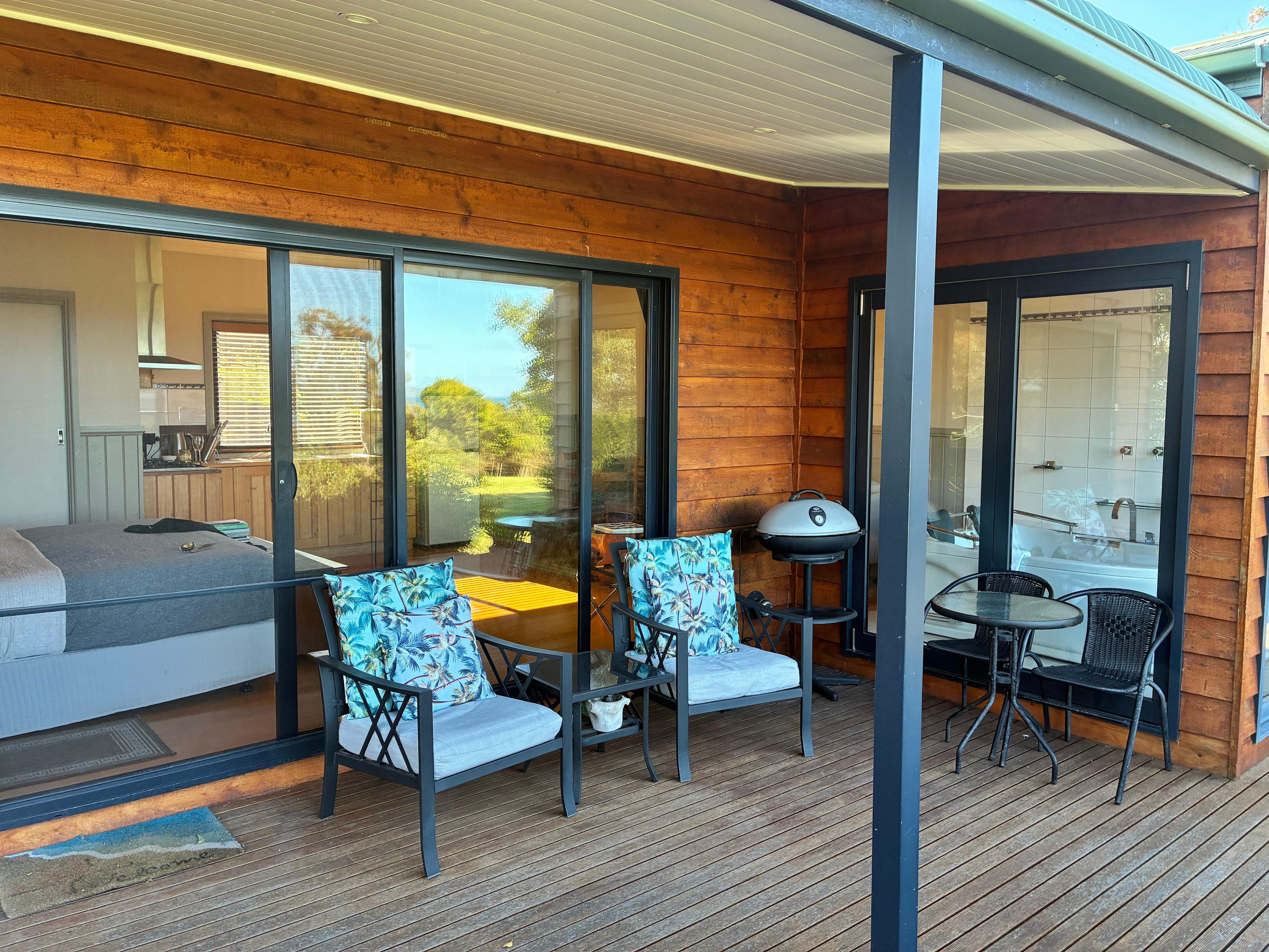 Outside the cabins have their own private timber deck with an electric BBQ and lots of seating to watch the native birds.