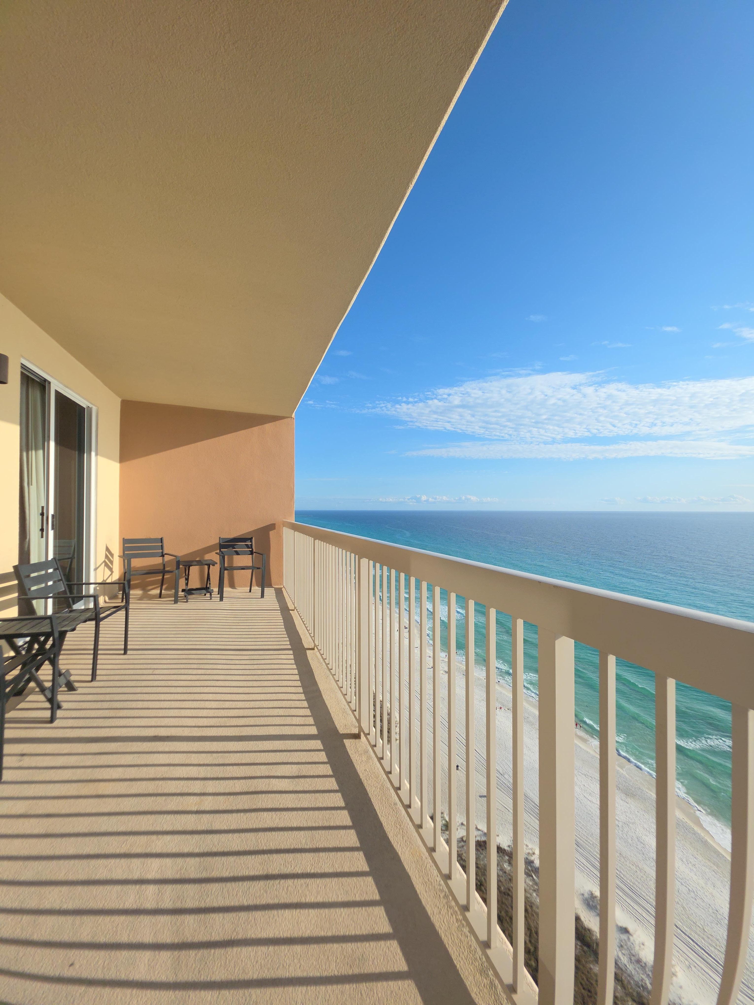 Our unit is on the 23rd floor with a spectacular view of the emerald blue water and white sandy beaches. The gulf front master suite, with direct balcony access, has a queen-size bed and television. Draperies have a blackout lining.