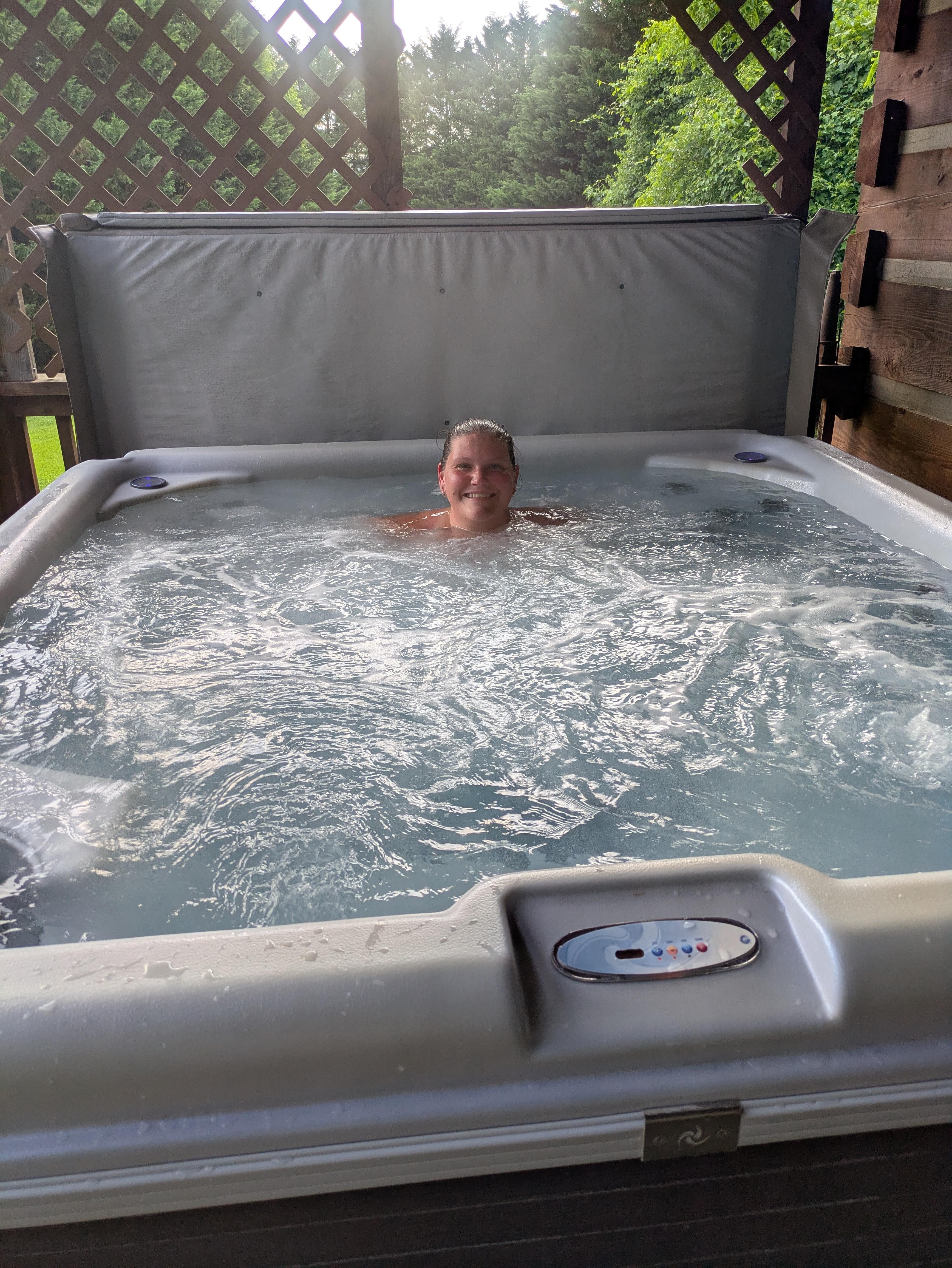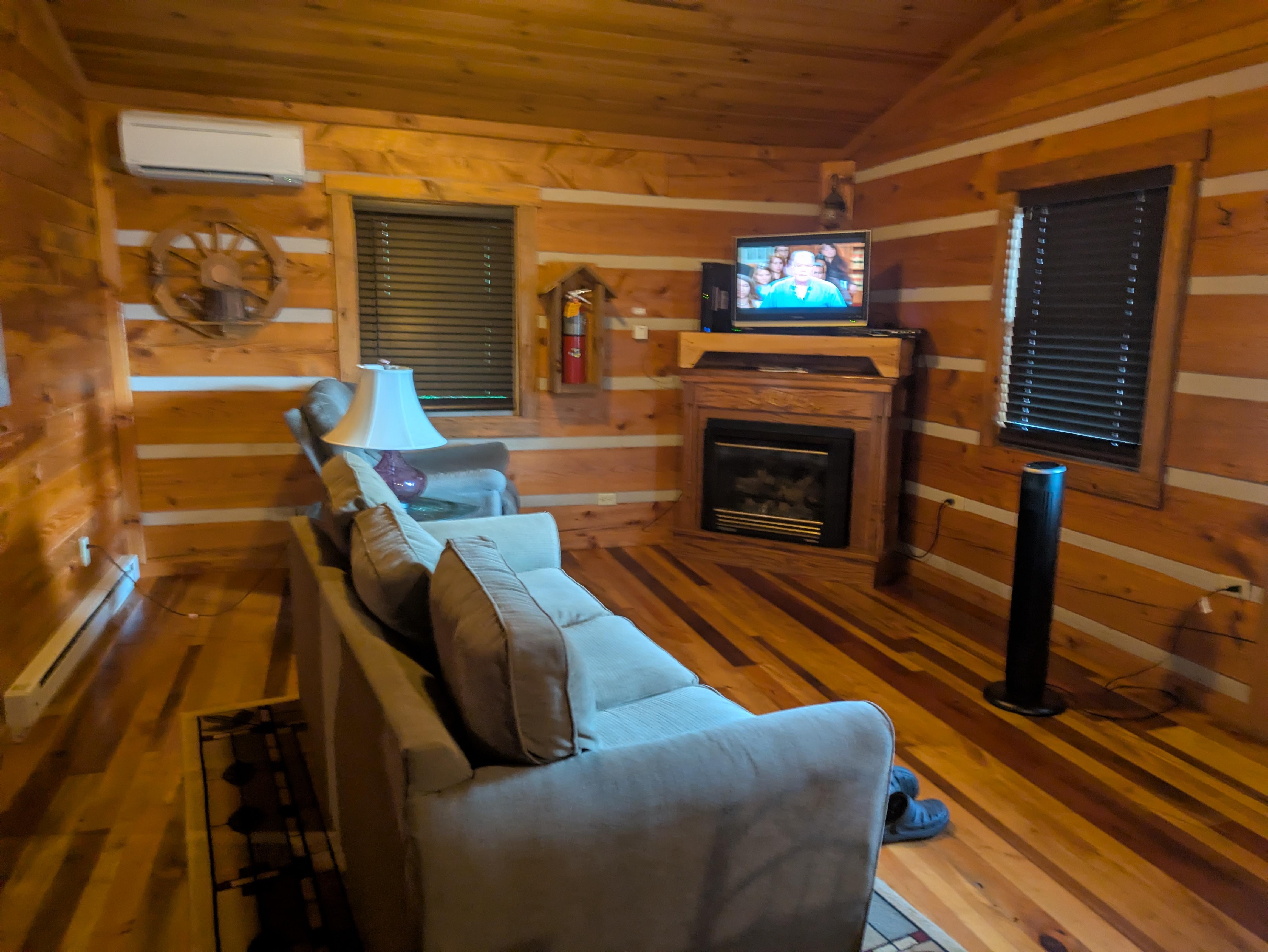 Our riverfront log cabin offers the perfect vacation getaway for couples of all ages, small families, and pet owners. The cabin has a vaulted ceiling in the main room, a private queen bedroom with antique furnishings, a futon and a bath with a shower. The large sunny kitchen includes a side-by-side refrigerator, an electric cook stove, a convection oven/toaster, a microwave, and a coffee maker, and has a comfortable dining area. The covered front porch has a slatted wooden glider swing, a roomy hot tub and a gas grill in the yard. Other amenities include 4 towels and wash clothes, a satellite TV, split mini in the living room and bedroom, ceiling fan in the kitchen, bedroom and porch and a gas fireplace ( Winter Use Only). The cabin can accommodate 2 people comfortably.