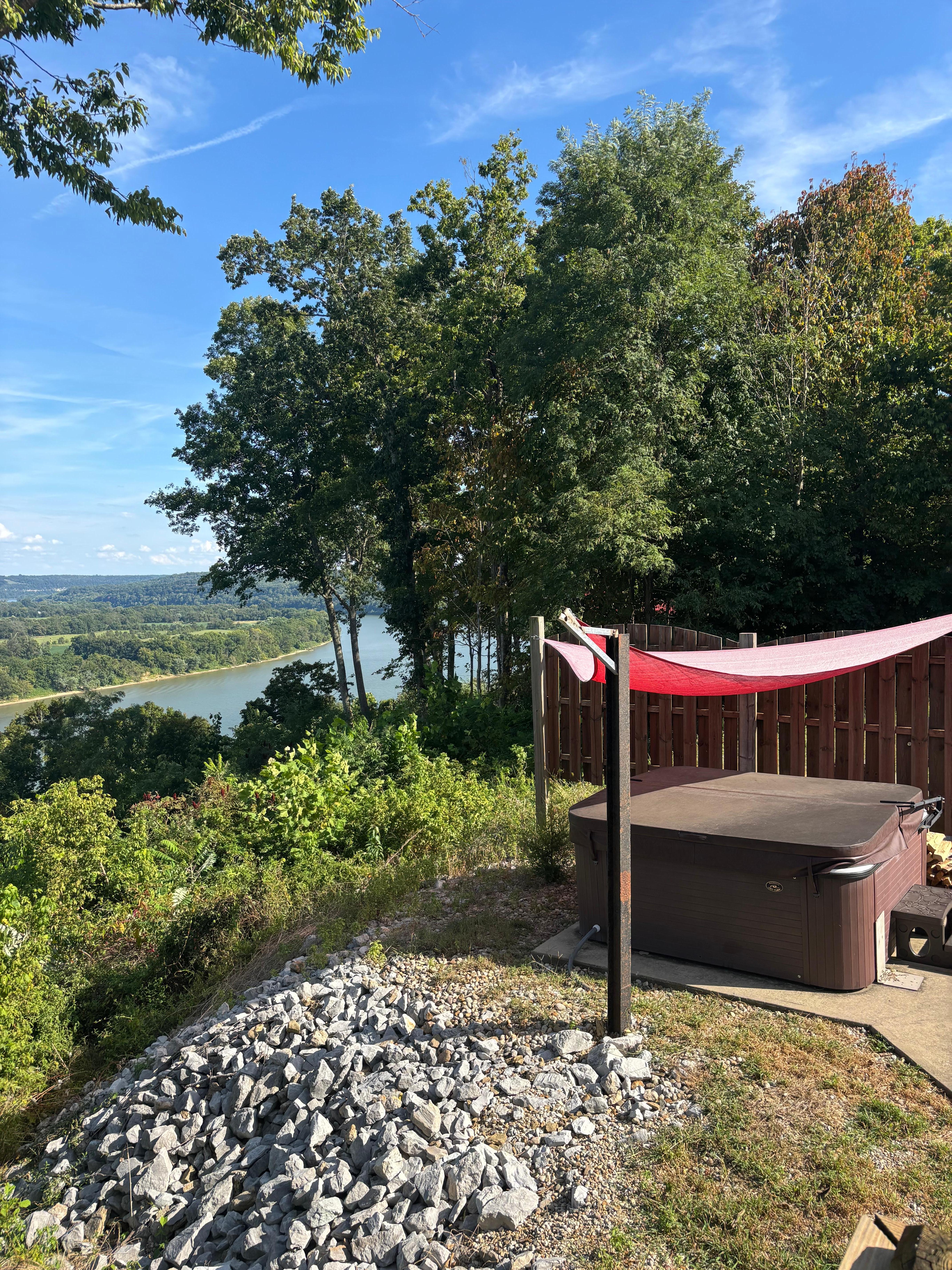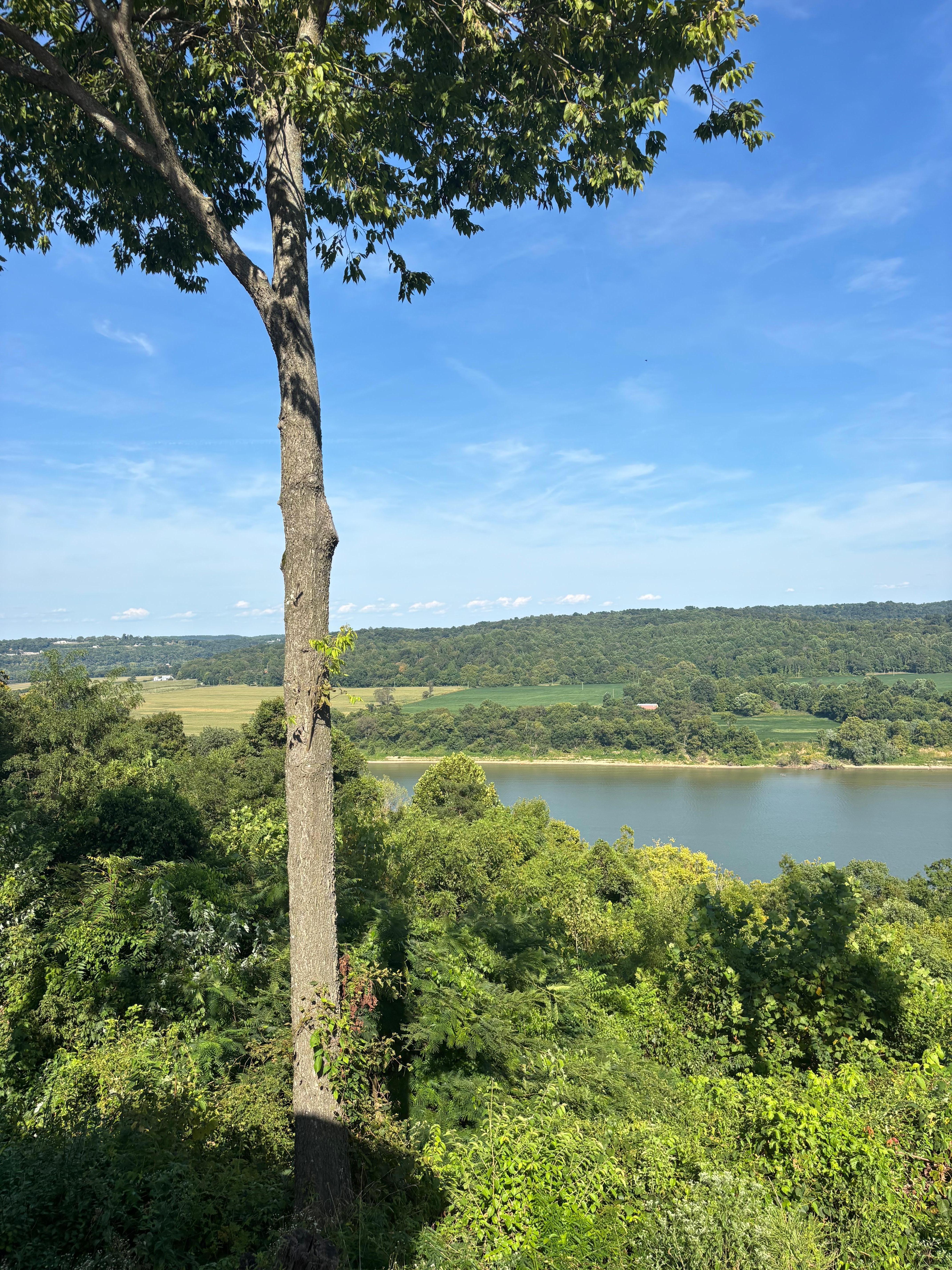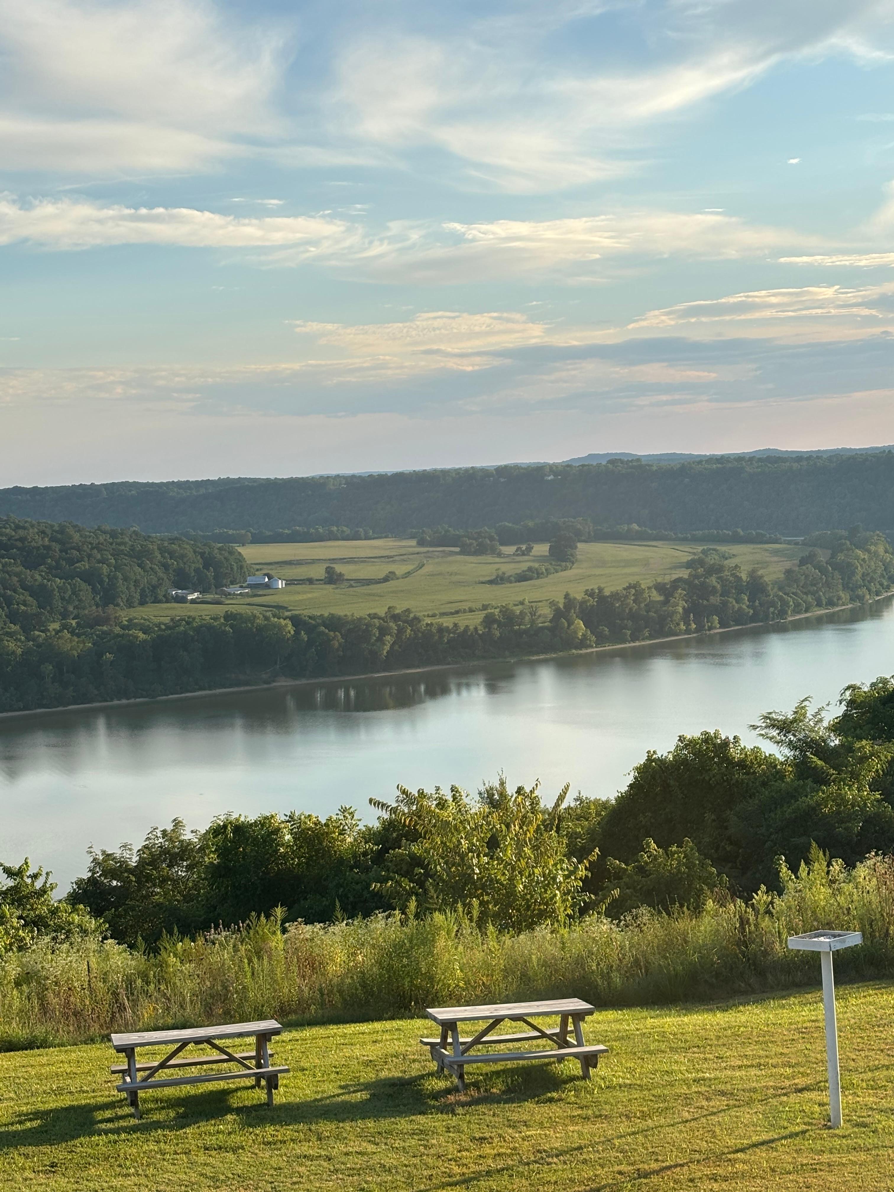 The view is fantastic. Nestled high on the bank of the Ohio River looking east into Kentucky. I had no idea Indiana had anything like this view.