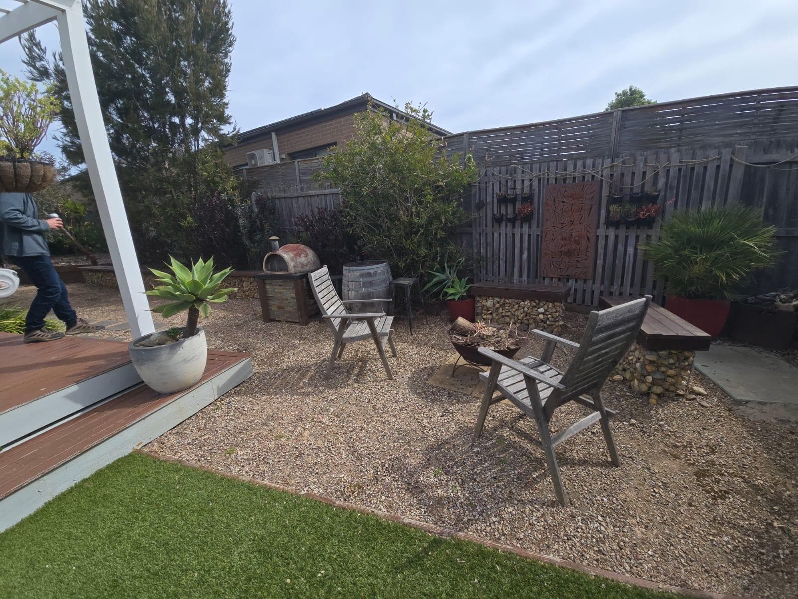 The backyard is compact and has a large sundeck, fire-pit area, outside dining table and lounge and BBQ.