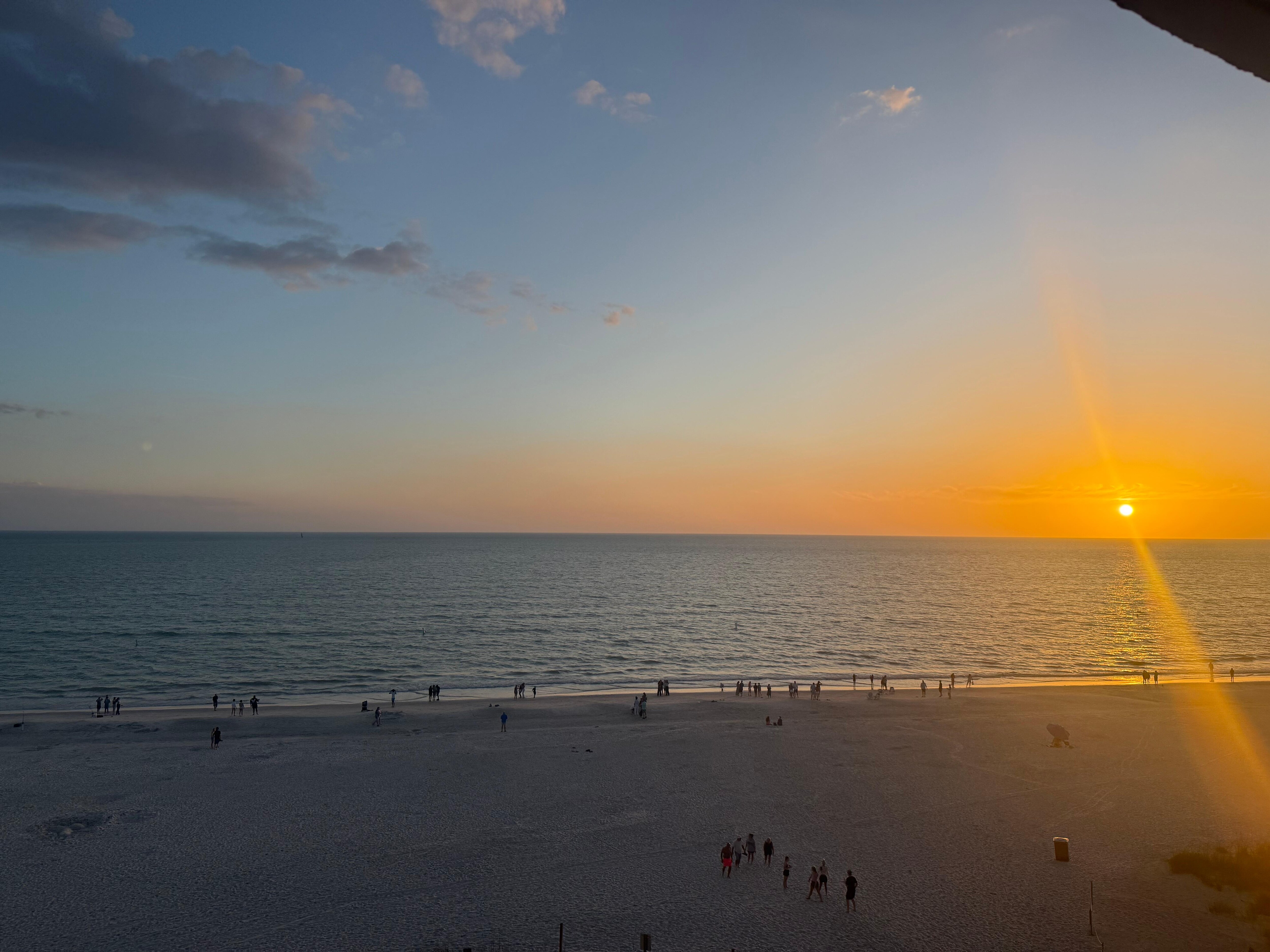 From our top floor penthouse level corner condo, you will see a panoramic 270 degree view of the Gulf of Mexico, Boca Ciega Bay, and Johns Pass. The balcony, accessible through large sliding glass doors from the living room and the master bedroom, overlooks the beach and the heated pool, and faces southwest across the Gulf.