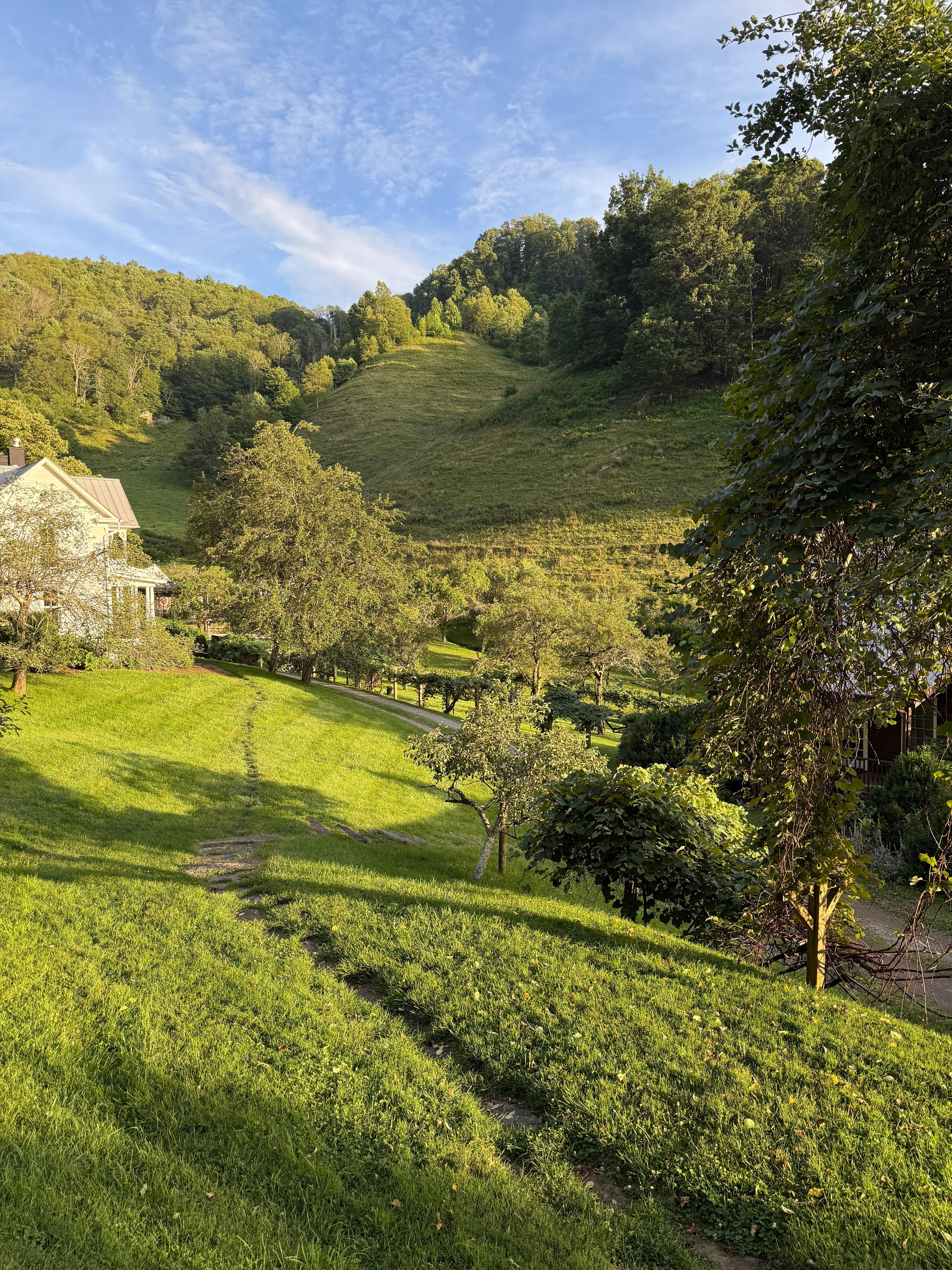 If you are looking for a quiet, peaceful time in a beautiful place, you'll enjoy this historic cabin/cottage. Nothing fancy, but full of charm. The upstairs bedroom is of particular interest. A bedroom with it's own library. When I saw this, I immediately thought of my relatives that would love this property. Not only upstairs but all through the cabin, books are everywhere. Look at the farm, pet the pooches and cats, and read all day. The bathroom is kind of a throw back to old timey showers in styling but, the water is hot! Many times, in these rentals, owners can sometimes have a tendency to have the water temperature set for economy, but, not here. Bravo! If you choose to stay here, be sure to visit the owners new coffee/antique/art shop in downtown Lansing. It's going to be a great place to hang out after walking in the town's new park. The owners are great people and have great history to share with you about this blueberry/apple/pear farm. Thanks to Walter and Johnny sharing some of their heaven with us.